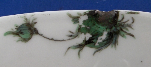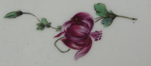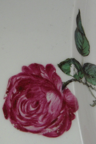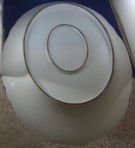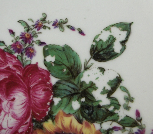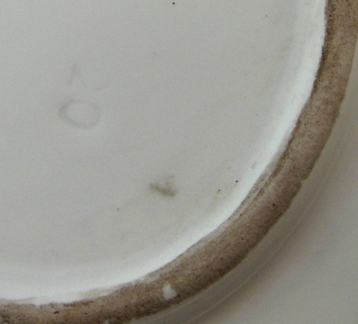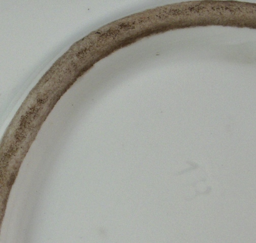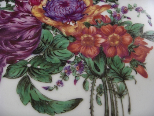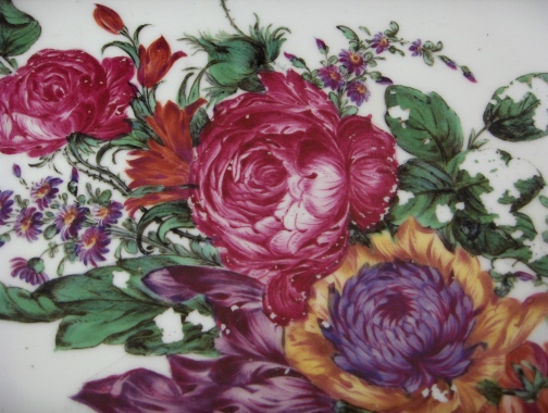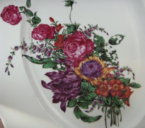 This is a giant platter made in France in the 19th century or maybe earlier. I have owned it for many years and it just has me stumped! It is huge being 21.5 inches wide, 15.5 inches deep and 2.5 inches tall. Handpainted with a superb floral arrangement as well as a few smaller flowers and leaves. One leaf with a flower bud was painted over a large rim chip which I have never seen before on that scale. Two green bugs are also on the rim. The piece is in good condition considering the side - the one overpainted rim chip I already mentioned and another rim chip plus flaking to the paint. I first thought it might be Tournai because the porcelain has a green translucency but the style of flower does not fit nor do I think this is soft paste. The only markings are an impressed 18 and 20 underneath. Maybe someone out there has more of a clue what this might be than me :) It is a very ehavy piece! Please email me for more information or other pictures.
