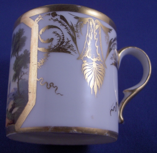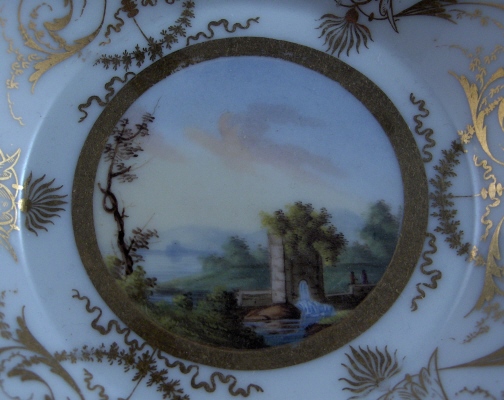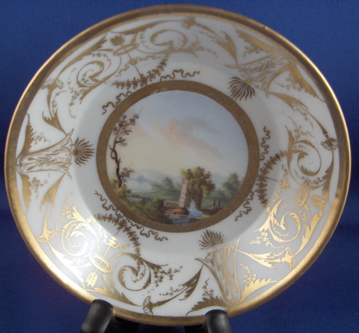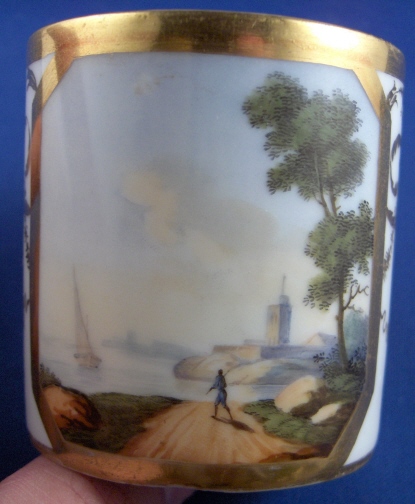 This is a cup and saucer made by one of the Paris makers around 1800. Most likely La Courtille or Clignancourt . The set is superbly decorated with a handpainted scene of a fountain in a landscape in the saucer well and a man on a road next to water with a sailboat on it on the front of the cup. These scenes are of very high quality! Then there is the gilding. Quite fancy and better looked at in the pictures than described. The amazing thing is that this set is in perfect condition (with minute wear of the gilding) and matches three others I have up on the site as well. The set is unmarked which is common for Paris makers around that time. The cup is 2.5 inches tall and 2.375 inches in diameter. The saucer is 1.25 inches tall and 4.875 inches in diameter. Please email me for more information or other pictures.