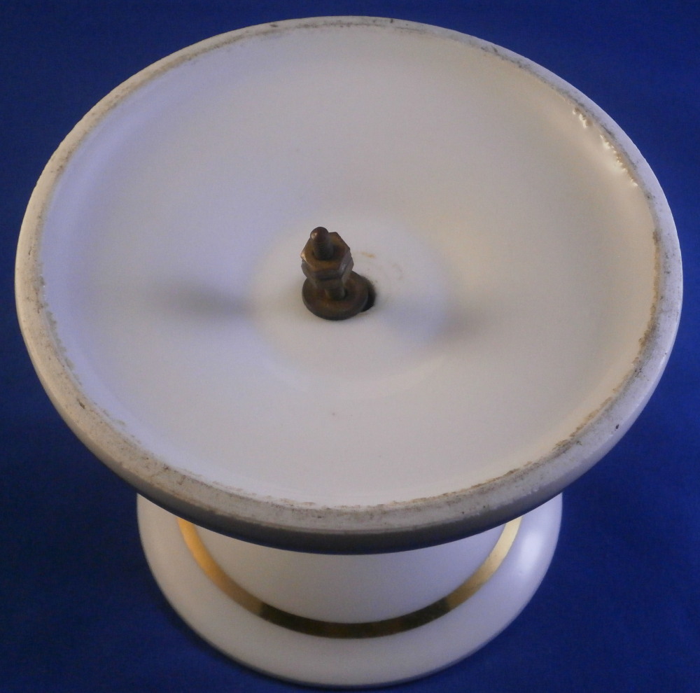 This is a pedestal base made in France in the mid 19th century. It has a simple shape to it with some nice gold highlights. Could be used for a reticulated basket, a plate, or possibly even a vase. The piece is 3.875 inches tall and 5 inches in diameter at the bottom. The top outer diameter is a tiny bit over 4 inches. Unmarked but definitely French from this period. It does come with the old metal hardware to hold the new plate or basket in place. That is a bit rusted. The porcelain is in great condition and the gilding is great. Some minor age related marks but no damage or obvious wear spots. I have a second piece if anyone is interested in a hard to find pair. Please email me for more information or other pictures.