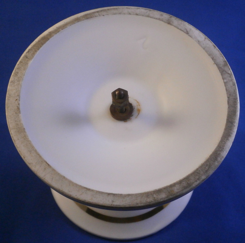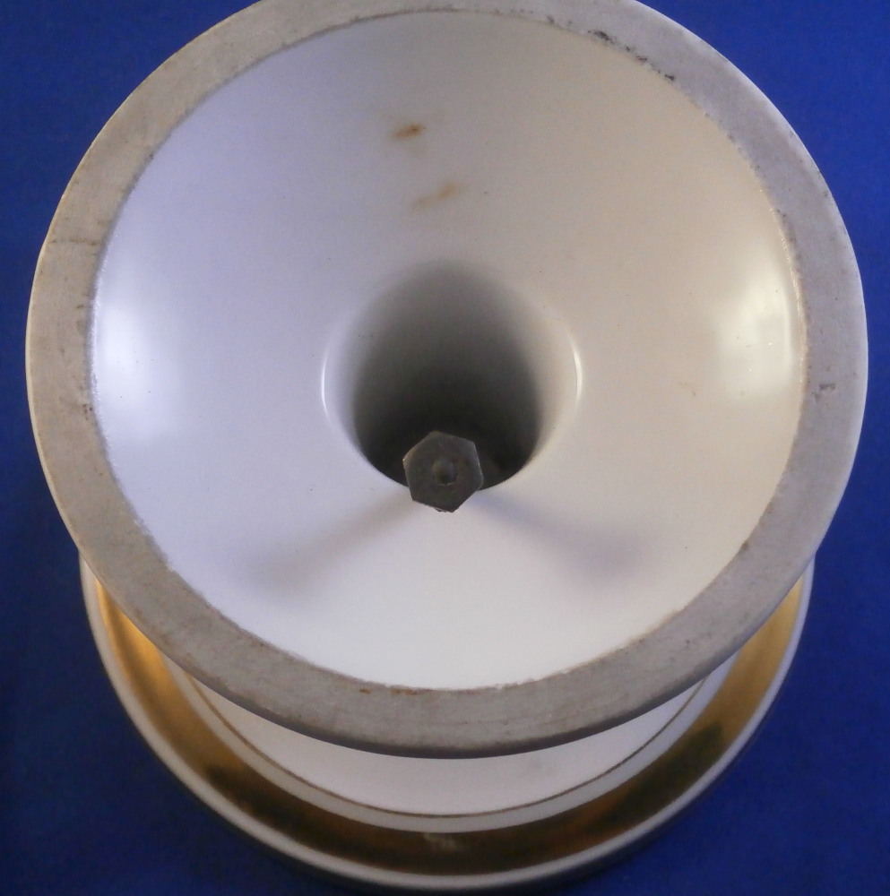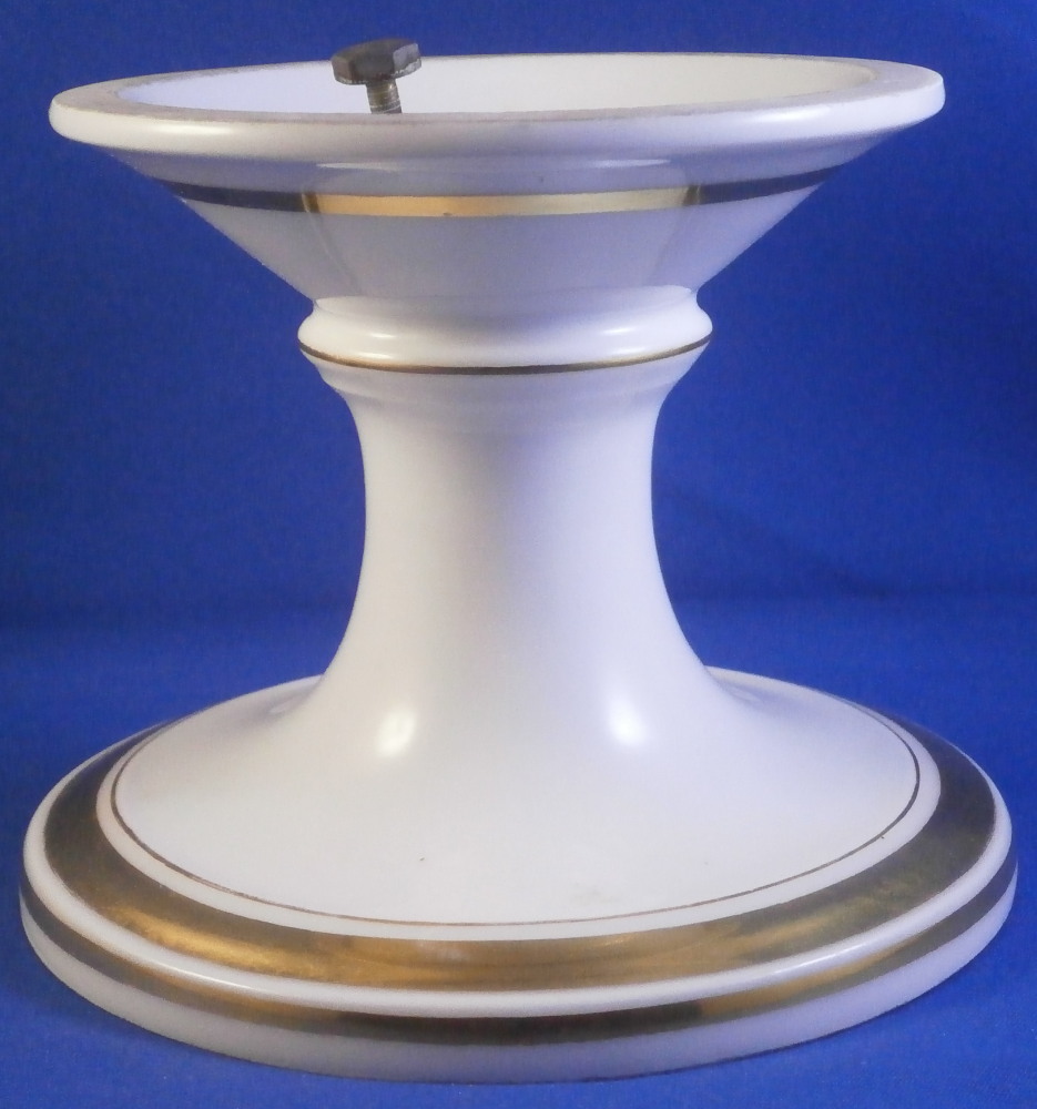 This is a pedestal base made in France in the mid 19th century. It has a simple shape to it with some nice gold highlights. Could be used for a reticulated basket, a plate, or possibly even a vase. The piece is 3.875 inches tall and 5 inches in diameter at the bottom. The top outer diameter is a tiny bit over 4 inches. Unmarked except for an incised 2 but definitely French from this period. It does come with the old metal hardware to hold the new plate or basket in place. That is a bit rusted. The porcelain is in great condition and the gilding is great. Some minor age related marks but no damage or obvious wear spots. I have a second piece if anyone is interested in a hard to find pair. Please email me for more information or other pictures.