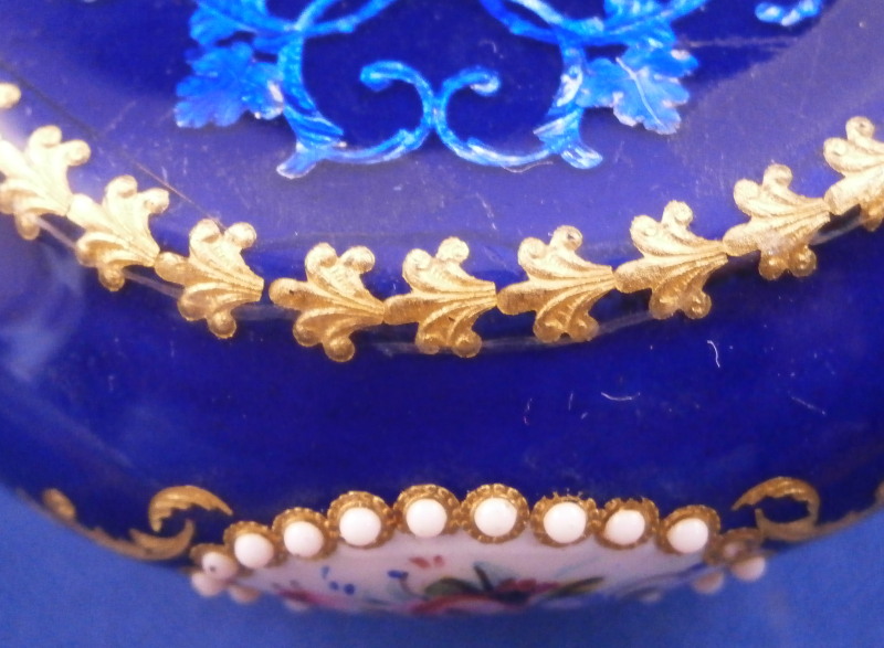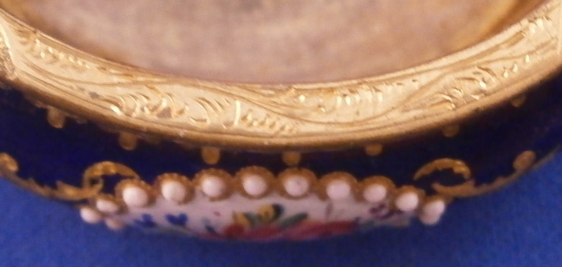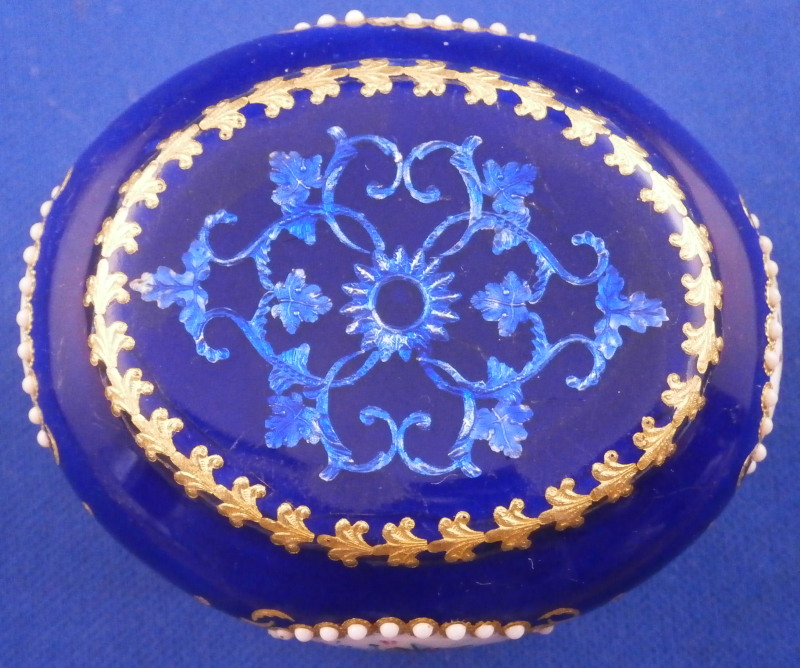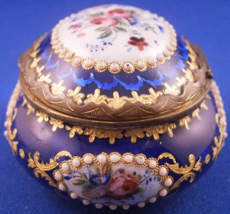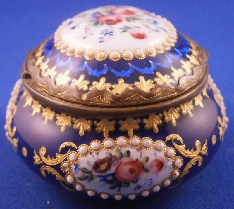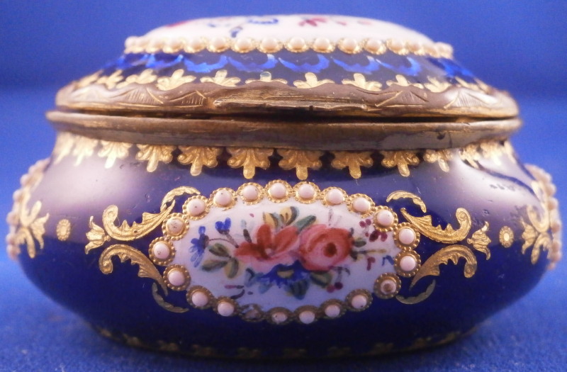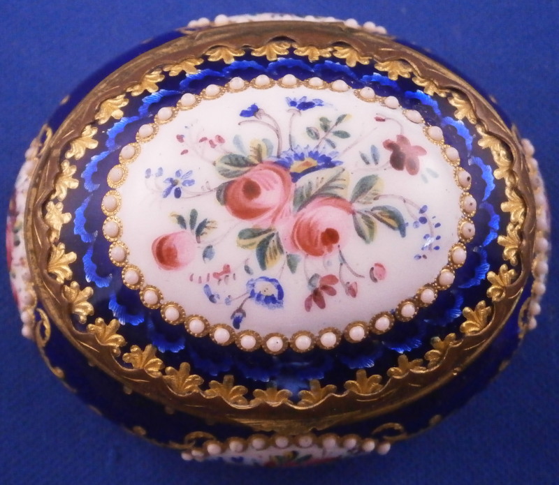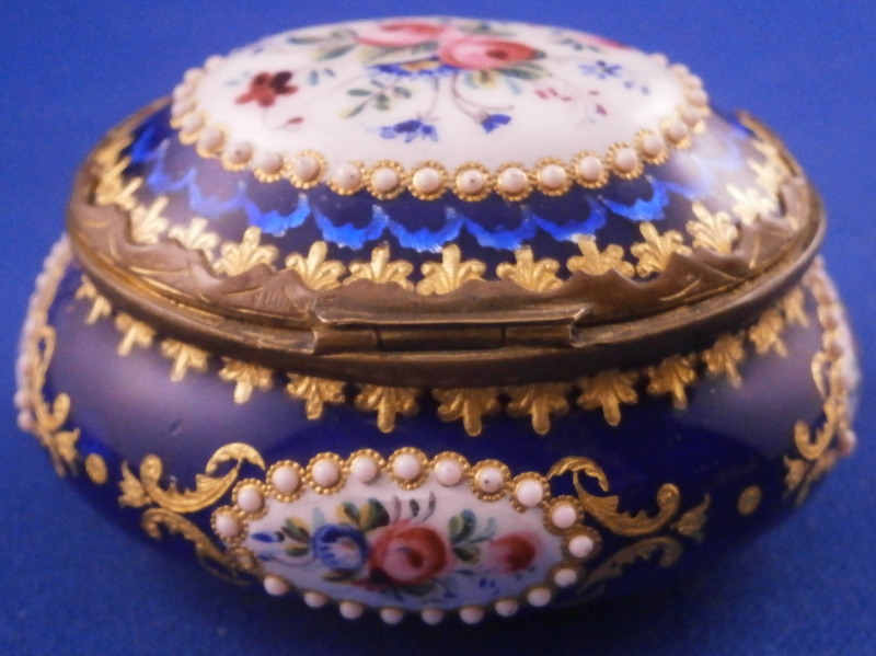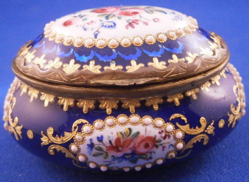 This is a nice enamelled brass box made in France in the mid to late 19th century. The box is oval in shape and has some superb details to the outside. There are gold and silver designs - the silver is under a blue enamel where you just see it with the gold just being under the top clear coat. Each of the four sides as well as the center top has a hand painted flower design on white ground surrounded by little white raised "jewels" on gold foil. I have seen these being called seed pearls as well as opals but they are just small riased enamel dots on a gold faoil backing. More common to porcelain I think than these enamel boxes. The brass hinges have a nice chased design to them for the lid edge as well as the part that doesn't show when the lid is closed. Inside is plain brass as shown. The underside has that amazing silver design under blue enamel with the gold design around the edge under the clear enamel. A stunning little box! The box is in great condition with three of the tiny "jewels" missing but the gold faoil is there so it is not easy to spot at all. None are missing on the lid. A bit of scratching to the underside enamel but the piece displays perfectly! The box is about 1.25 inch tall, 2.375 inches wide and 2 inches deep. It is not marked as far as I can tell. Please email me for more information or photos.