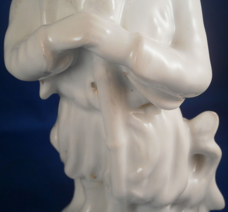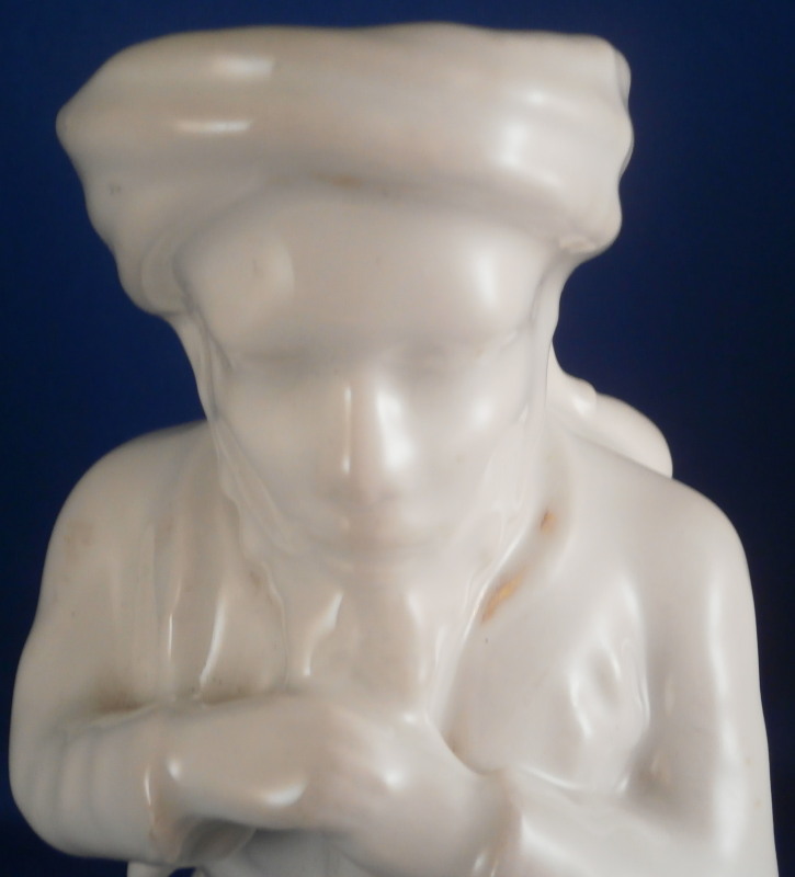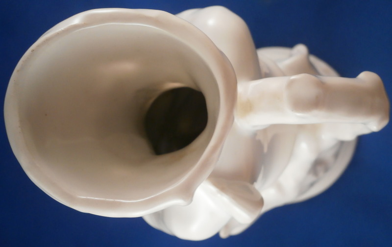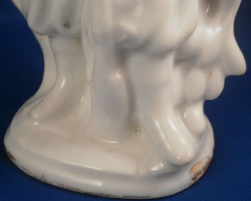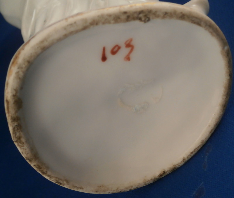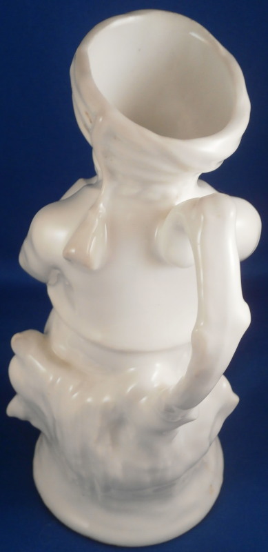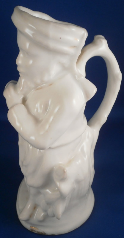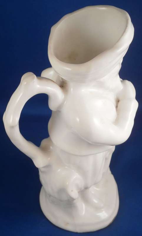 This is a pitcher or milk / cream jug or such made by an unknown maker in France in the 19th century. It is nicely modeled in the shape of a hunter with a beard holding his rifle with some greenery to the back out of which the branch shaped handle comes up and curves back towards his neck. A fun piece I have not seen before and it would make a great addition for someone that colelcts figural jugs or such. Not sure as to the exact maker as it is only marked with a red number 103 which seems more English in terms of mark but the paste screams French.The piece is about 6.875 inches tall, 3 inches wide and 3.5 inches deep. The creamer is in great condition without any chips, etc. but it used to have some gilt highlights which are all but gone now. Please email me for more information or other pictures.