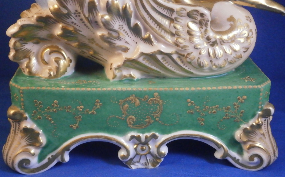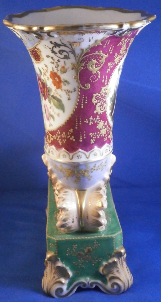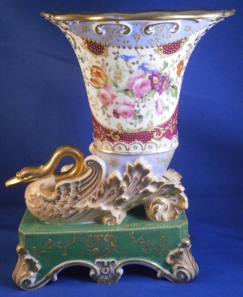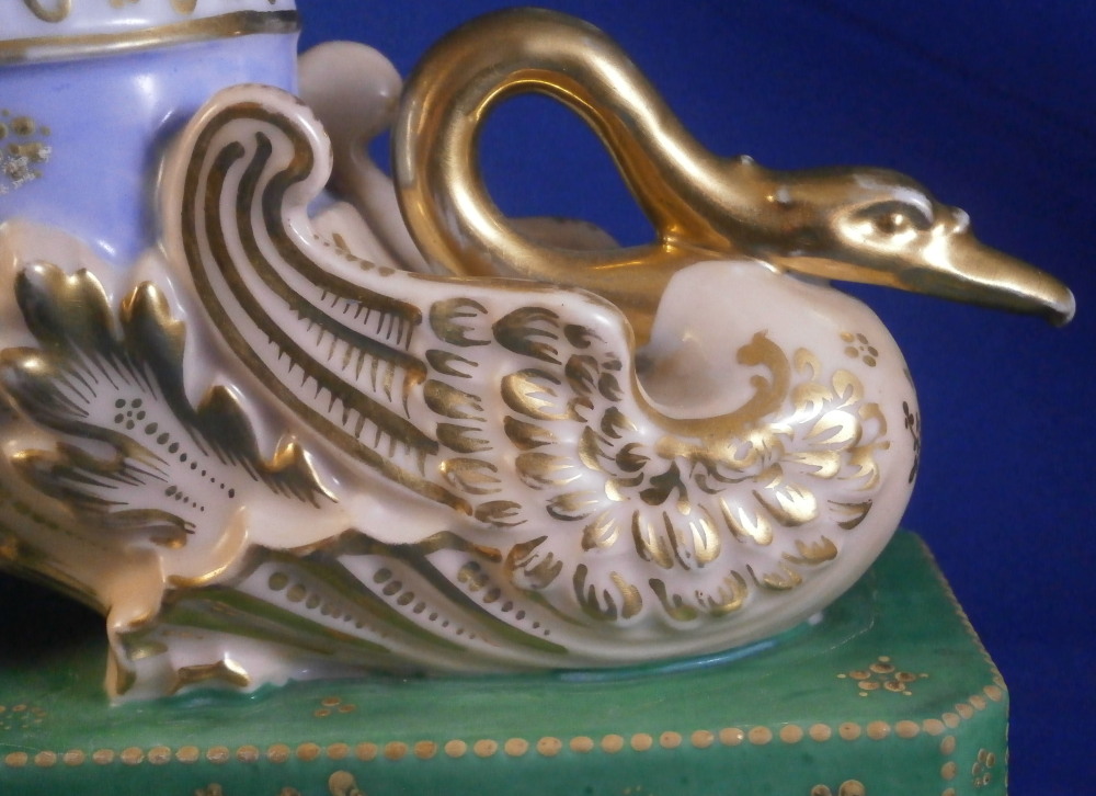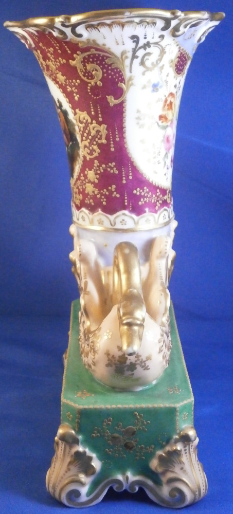 This is a really superb vase most likely made by Jacob Petiti of the Paris region of France in the early 19th century. I have had a very similar marked example in the past and the design and style fit his work the best. A very nice example of this style for sure! Sort of like a cornucopia vase held up by a swan on a rectangular base. The vase has an oval shape to the top - one side is painted with a scene of a couple with the surrounding area having a burgundy ground color to it with the typical raised gold designs over that. The other side of the vase has a floral arrangement to it on white ground with some of the burgundy ground around it and a light blue ground near the top. Gold scrolls along the top edge. The nicely modeled swan it an off white or beigy orangey color with lots of gold detail to it and the base has a green ground color with raised gold desaigns to that. Some nice scrolls to the bottom and corners. All in all a very fancy and nice piece! Good size as well! The vase is in good condition with a touch of wear to the gilding mainly along the very top. The scroll design in the center of the base on the front and bac both ahve a chip / some chipping to it as shown but neither takes away from the piece at all and it looks amazing! The piece is not marked underneath but that is not very unusual at all. Definitely French from this period! The entire piece is 8.5 inches tall, 7 inches wide and 4.25 inches deep. Please email me for more information or other pictures.
