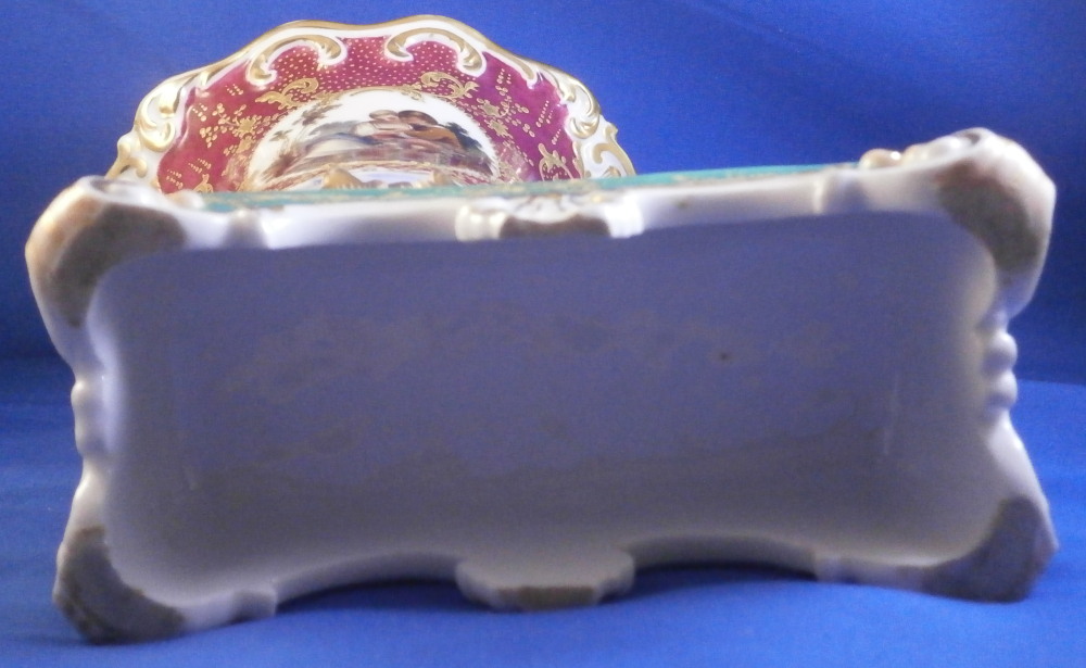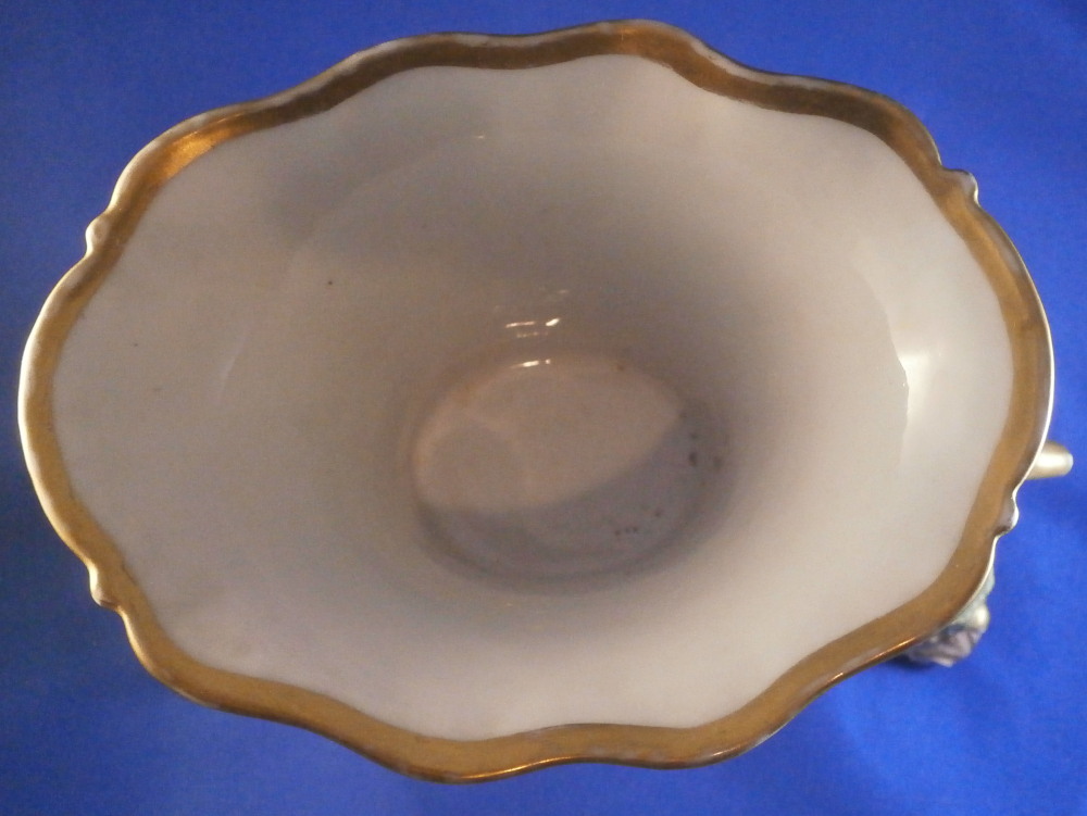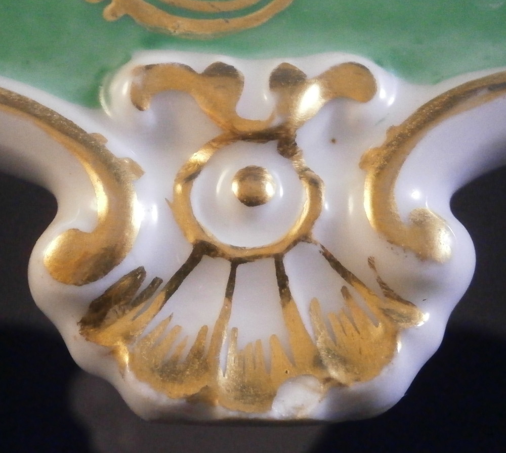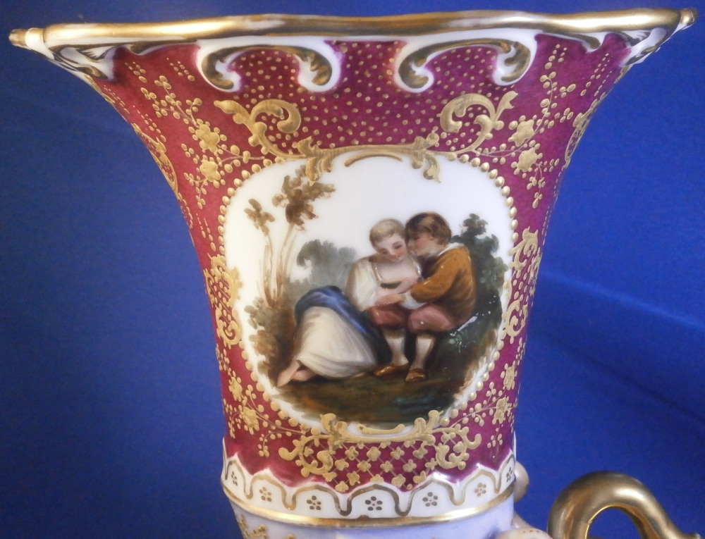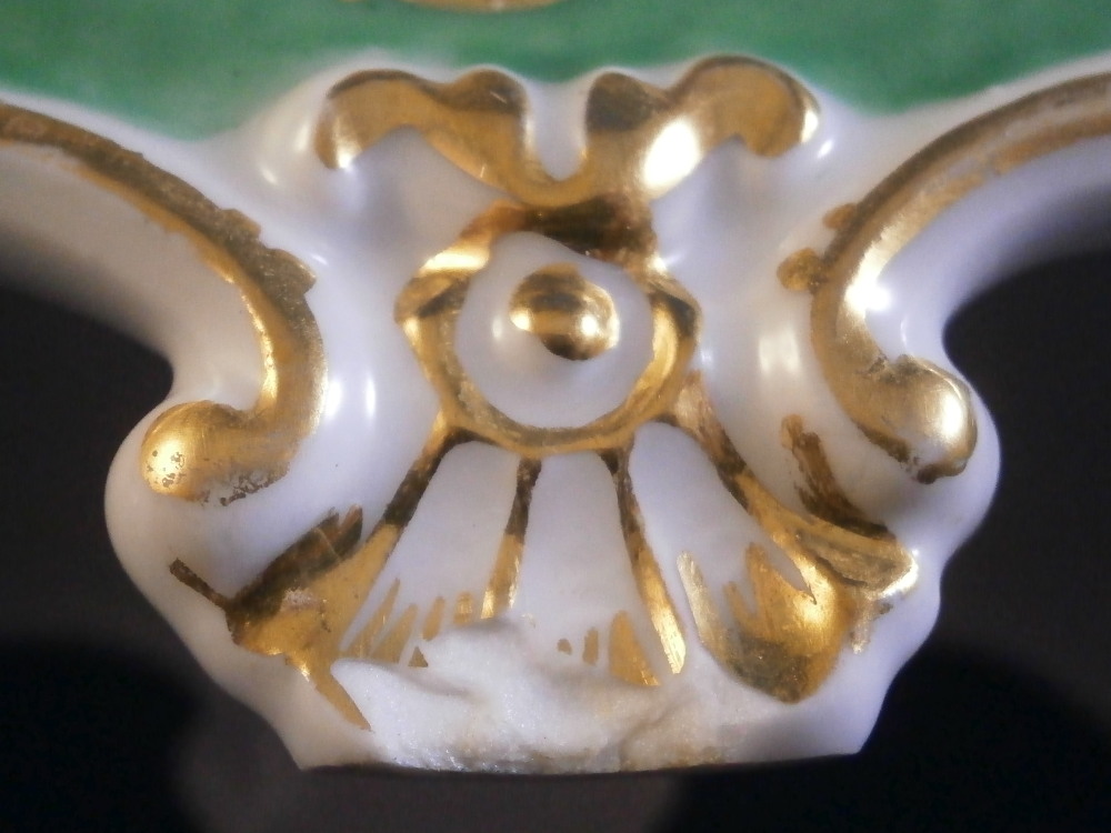 This is a really superb vase most likely made by Jacob Petiti of the Paris region of France in the early 19th century. I have had a very similar marked example in the past and the design and style fit his work the best. A very nice example of this style for sure! Sort of like a cornucopia vase held up by a swan on a rectangular base. The vase has an oval shape to the top - one side is painted with a scene of a couple with the surrounding area having a burgundy ground color to it with the typical raised gold designs over that. The other side of the vase has a floral arrangement to it on white ground with some of the burgundy ground around it and a light blue ground near the top. Gold scrolls along the top edge. The nicely modeled swan it an off white or beigy orangey color with lots of gold detail to it and the base has a green ground color with raised gold desaigns to that. Some nice scrolls to the bottom and corners. All in all a very fancy and nice piece! Good size as well! The vase is in good condition with a touch of wear to the gilding mainly along the very top. The scroll design in the center of the base on the front and bac both ahve a chip / some chipping to it as shown but neither takes away from the piece at all and it looks amazing! The piece is not marked underneath but that is not very unusual at all. Definitely French from this period! The entire piece is 8.5 inches tall, 7 inches wide and 4.25 inches deep. Please email me for more information or other pictures.