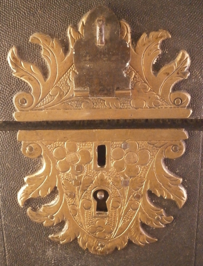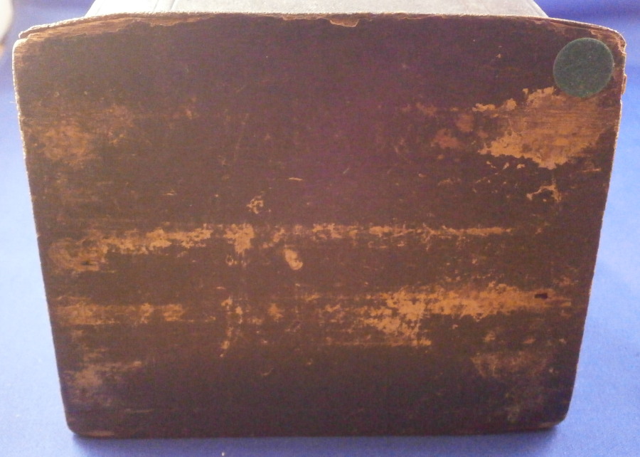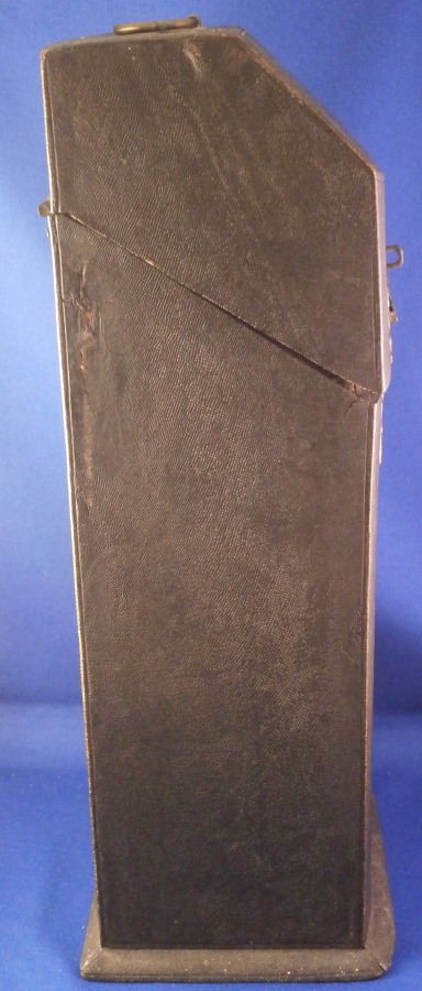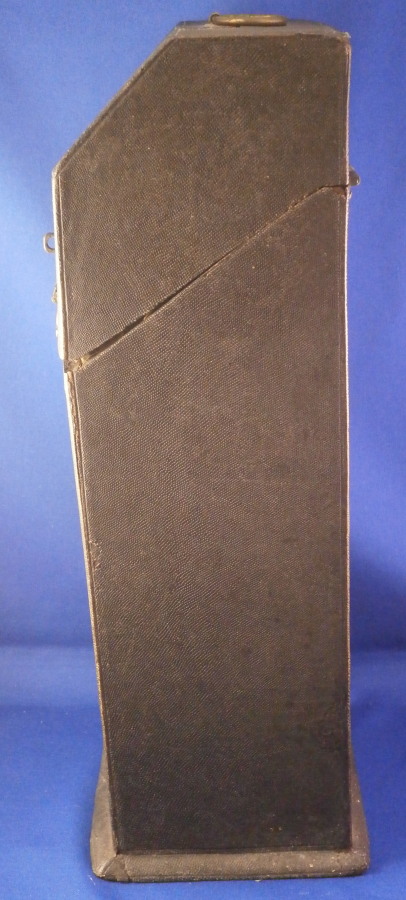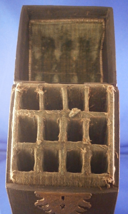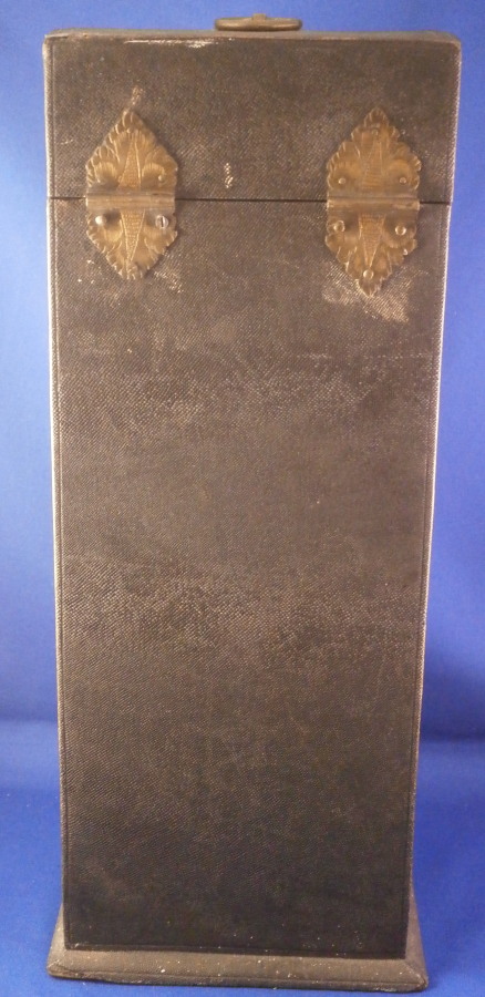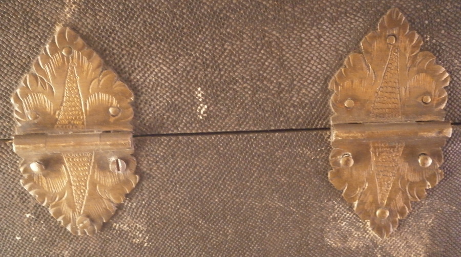 This is a rare case for a set of knives and forks made in France in the early 18th century. These so called shagreen (fish skin, probably shark) cases boxes are rather hard to find, It is tall and slender, lined with green velvet and would be for a full set of St. Cloud porcelain handles knives and forks. The case displays nicely and is a rare survivor but not perfect. The lid does not close easily all the way in order to lock it probably because the hinges had some of the original screws replaced and it was not a perfect fit anymore. I do not have the original key either but one might be able to find one that works. No idea. The fish skin on the outside is in good shape except for a little bit of damage to the edges and a reglued tearalong the left back side as shown. It has a ring on top to be able to hold it when locked. The underside is wood. The hinges and the hardware around the lock are beautifully done with a ton of detail as shown. The insidevelvet has faded and is worn and torn in places now. Still looks great and works very well with the knives and forks I own. I don't have a perfect set for 6 but I have a set of five and another set that matches perfectly so it would look perfect. The piece is 13.25 inches tall, 5.5 inches wide and 4.75 inches deep. Please email me for more information or other pictures.