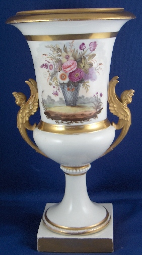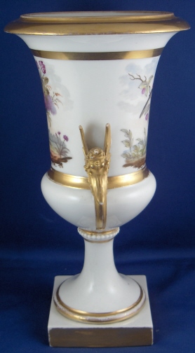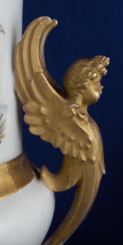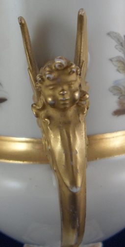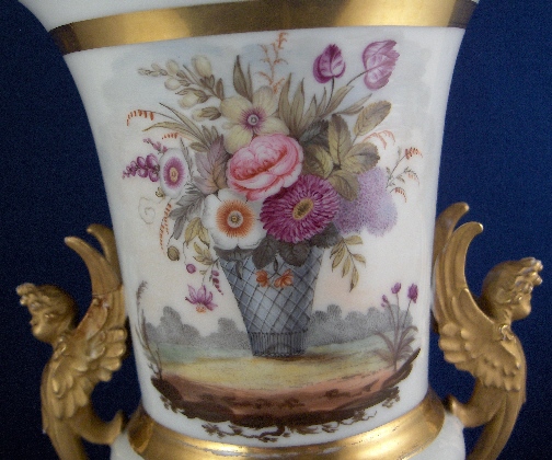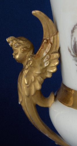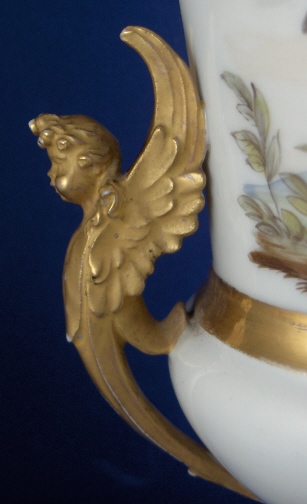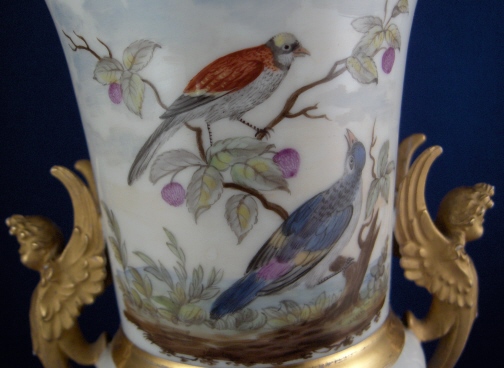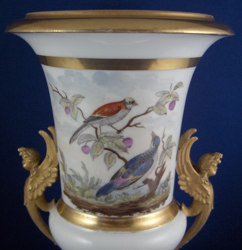 This is a superb vase made by Rue de la Fontaine au Roi (aka La Courtille or Locre ) in the 18th century. Vases are rather hard to find by them and this one is a really nice one! The vase has a typical shape for the period but the handles are amazing - they are in the shape of angels with a little head and wings that have lots of detail. The vase has a handpainted scene to the front of two birds sitting on a branch in a landscape surrounding with the backside having a scene of lots of nice flowers in a basket sitting in a landscape surrounding. Lots of nice gilding to the piece as well. The vase is marked underneath with the crossed swords type mark often passed as off as Meissen which was the point of it back then as well as some incised letters that look like PB but are hard to read - these are also quite typical on Paris region porcelain. The vase is 10 inches tall, 5 inches wide from handle to handle and has a top diameter of 5.25 inches. The piece is in great condition with a little wear to the gilding, one tip of a wing was broken and reglued and the screw mechanism that holds the base and main body together is a bit loose so the base can turn but that is it. A really nice piece from a great maker of this period in France! Please email me for more information or other pictures.