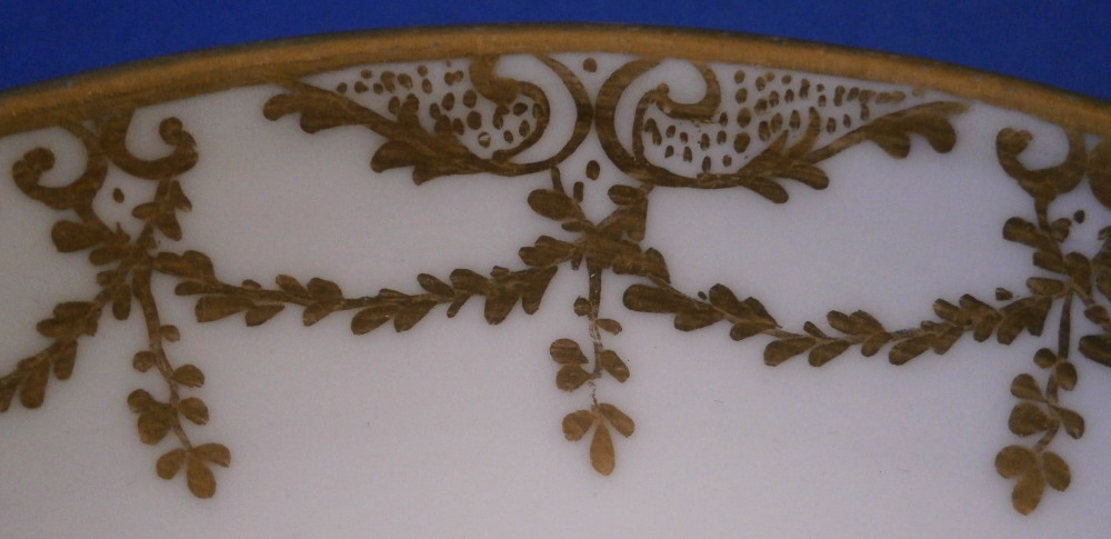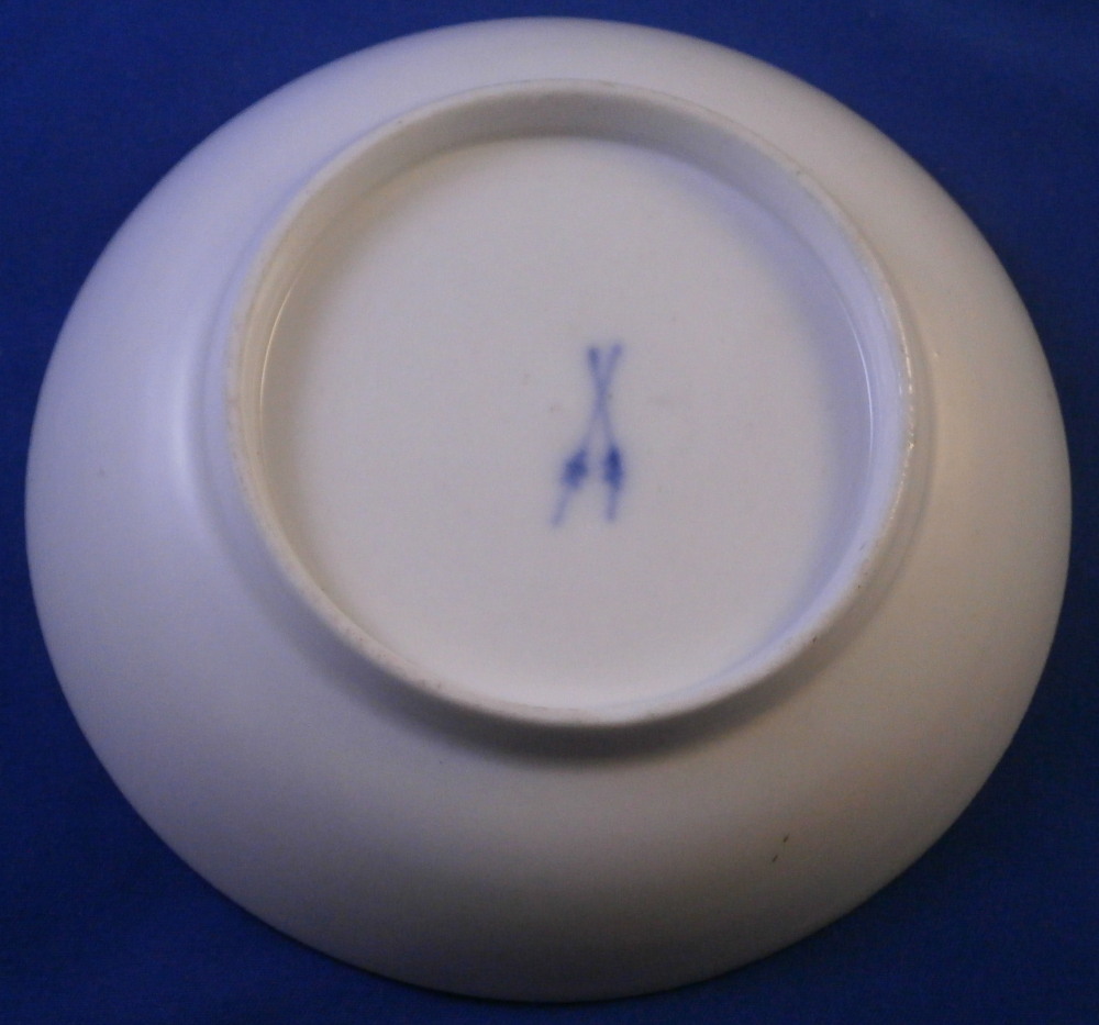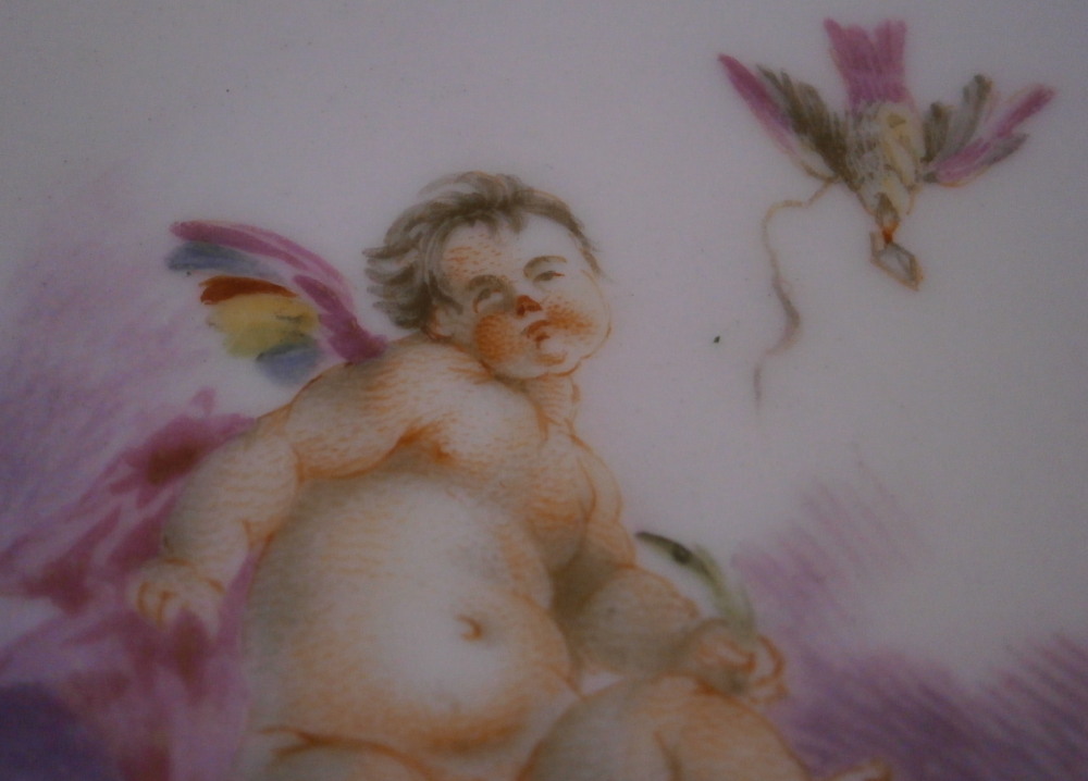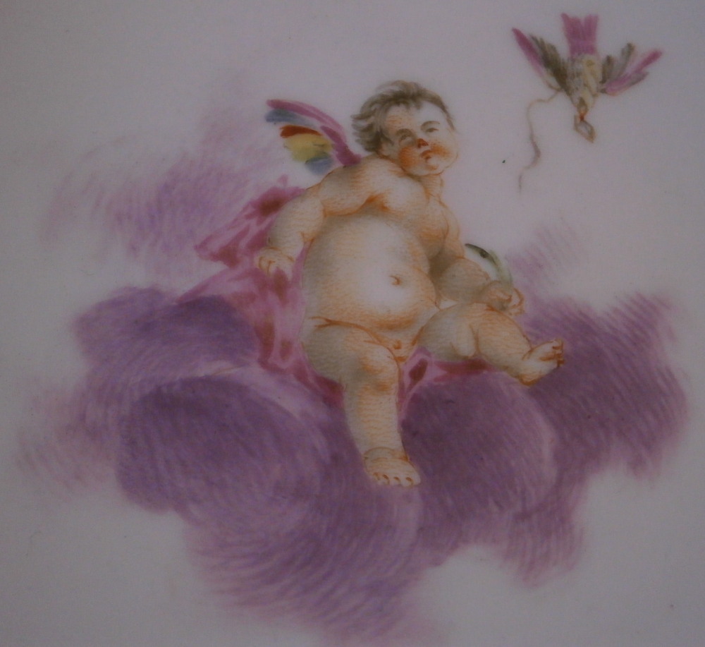 This is a really nice saucer made by Locre aka Rue de la Fontaine-au-Roi aka La Courtille in the 18th century. I am not super fmailiar with all the inner workings of this maker but if they ahd a famous painter working there this piece was done by them. The center scene of a cherub sitting in a cloud with a bird above it is extremely well painted and just amazing. The gold trim along the rim is very detailed and amazing as well. Only downside is that I sadly do not ahve the matching cup :( The piece is in superb condition with just a touch of wear to the gilding along the very edge. The saucer is marked underneath with their under glaze blue crossed arrows mark meant to imitate the mark of the top German maker. It is 1 inch tall and 4.875 inches in diameter. Please email me for more information or other pictures.