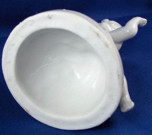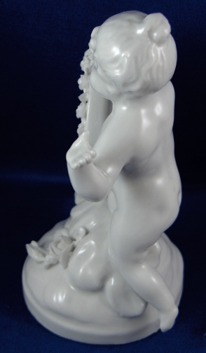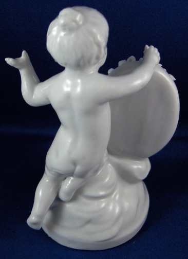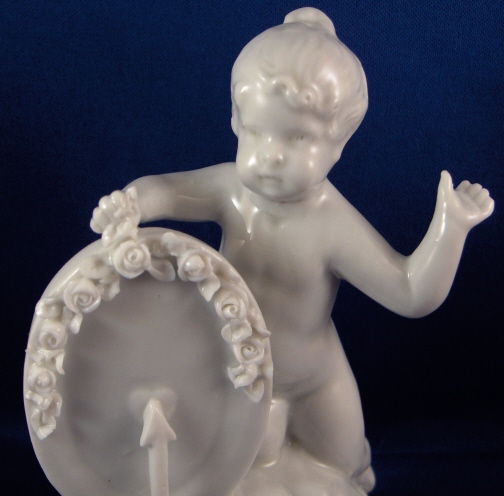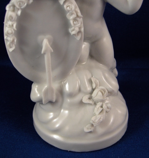 This is a figurine likely made in France around 1800. No idea as to an exact maker sadly and no idea what exactly these signify. Something to do with love. I have three different ones that belong together. This one is of a female putto that is holding some kind of tablet under her right hand decorated with flowers. The center has a heart on it with an arrow pointing to it. Simple base is also decorated with a flower. The piece is unmarked which is not uncommon on pieces from this period. She is in superb condition with two of the tiny leaves being chipped. The figurine is 5.25 inches tall, 3 inches wide and 2.75 inches deep. Please email me for more information or other pictures.