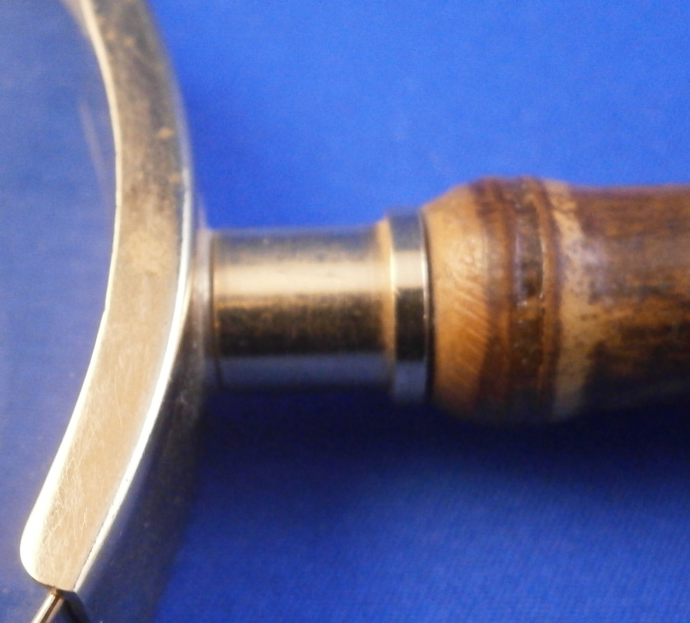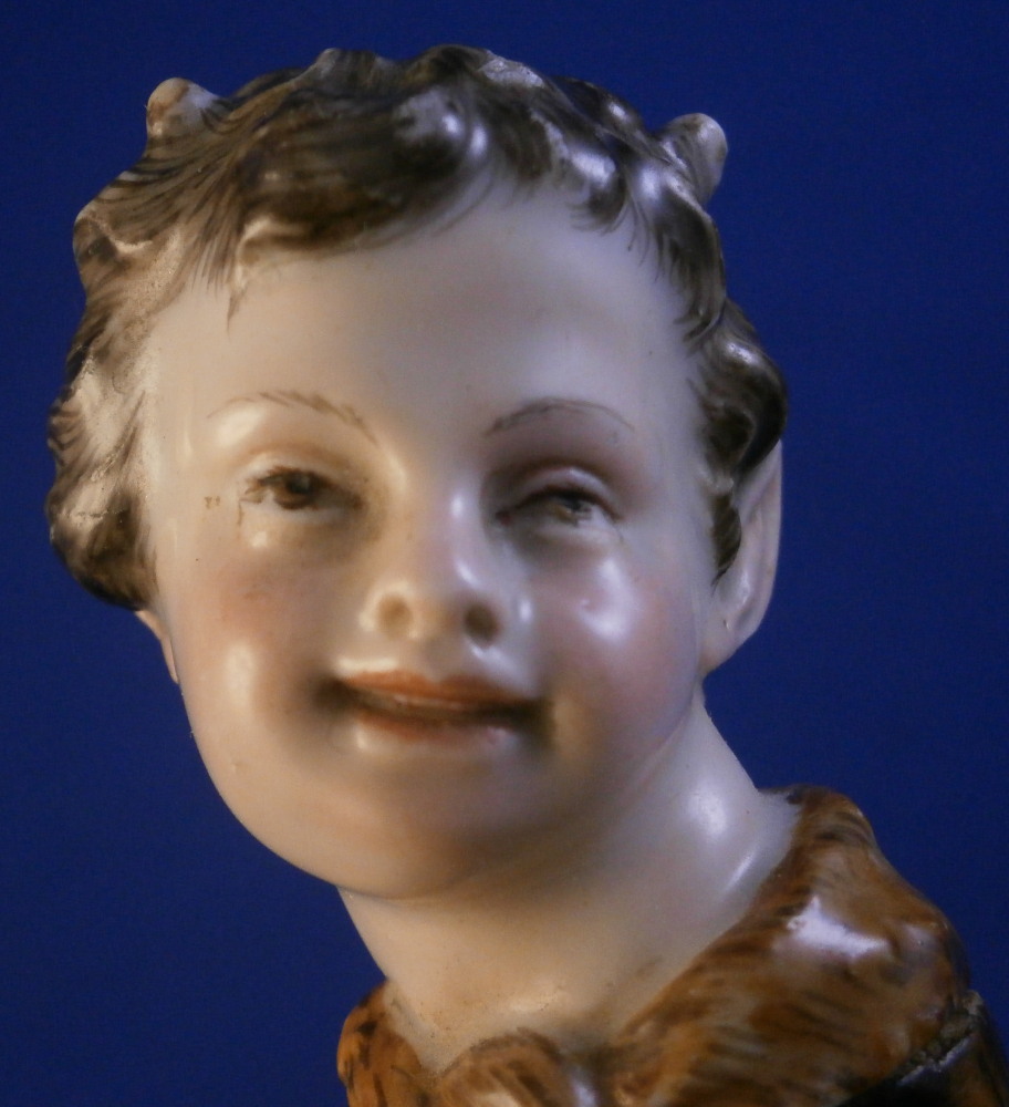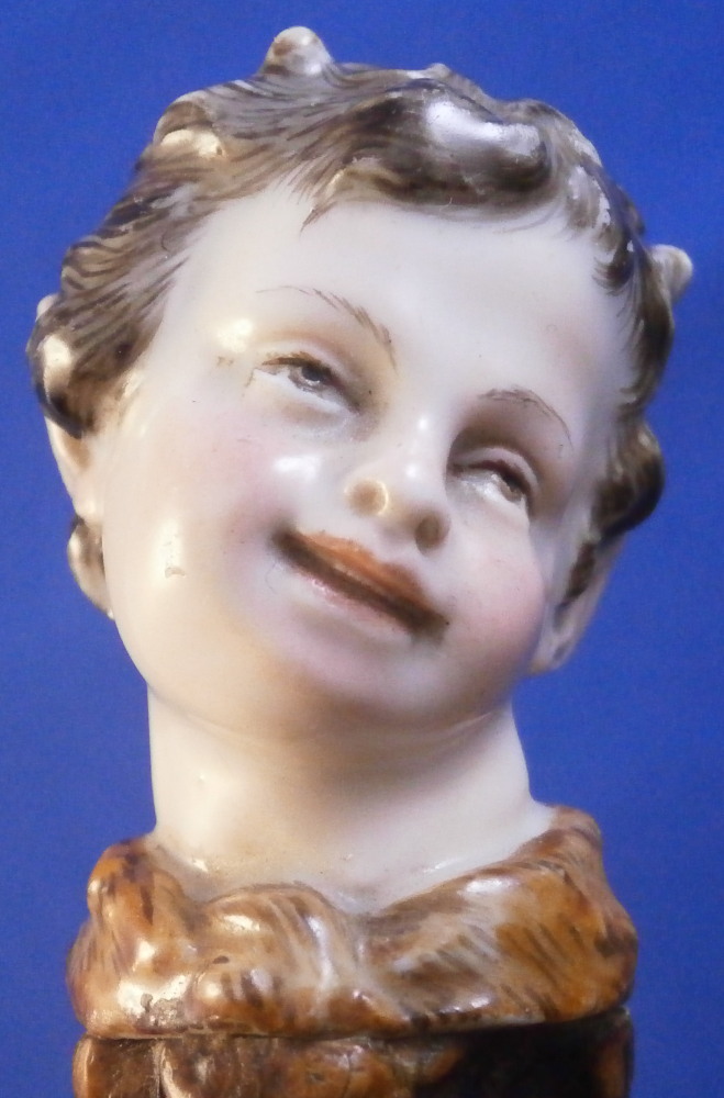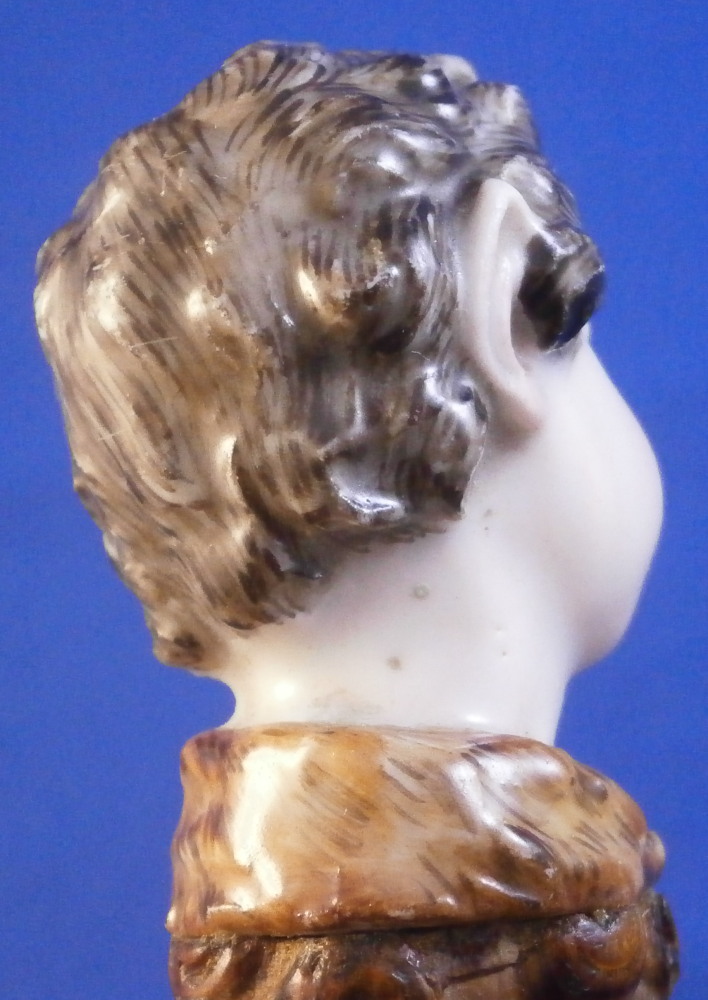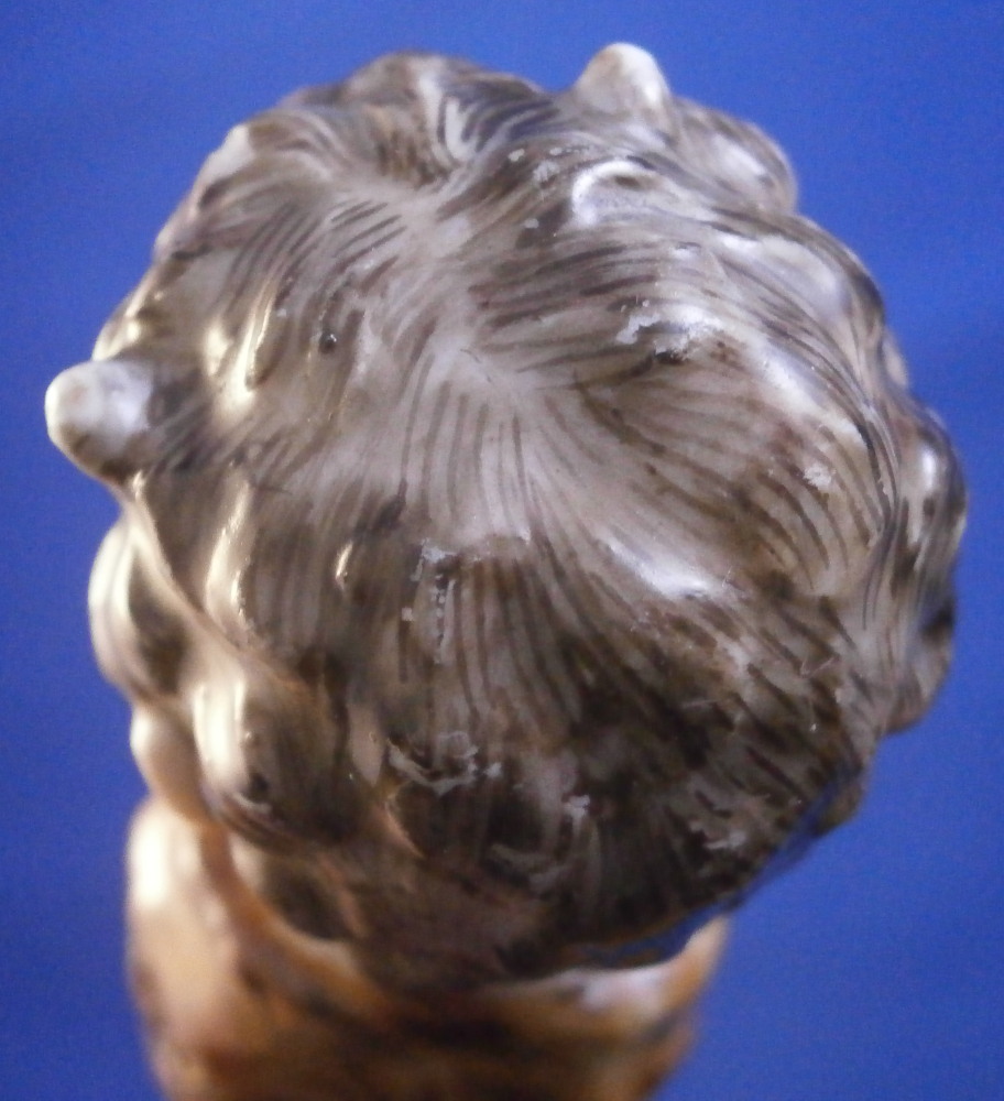 This is an interesting item for the true Meissen crazy person like me :) It is a magnifying glass with a bamboo handle made in France that has a Meissen bottle stopper attached to the end. The figural bottle stopper was made by Meissen in the 19th century . It is in the form of a young man's head which I think is meant to be the god Pan since in the hair there are two horns hidden and the ears are pointier than they usually are. The detail of the porcelain piece is superb especially the hand painting. I am not sure how the porcelain head is connected to the bomboo handle but they often have a screw or corkscrew attached to them so I assume that goes into the hollow part of the handle and it has been glued. The handle is really nice with the root system at the end which blends in perfectly with the collar of the porcelain. The handle is marked with an impressed BROT PALAIS ROYAL - I tried to look this up but found nothing except a cane with a silver topper marked the same way. The magnifying glass part is quite powerful and has a brass ring around it with a screw attachment at the bottom that attaches it to the handle. The piece is in superb condition with some wear to the paint of the porcelain head and some minor use marks. The piece displays perfectly and is really neat! The porcelain piece would be marked with the blue crossed swords underneath but since it is glued I cannot access it. The entire magnifying glass 12 inches long with the glass part being just under 3.5 inches in diameter. Please email me for more information or other pictures.