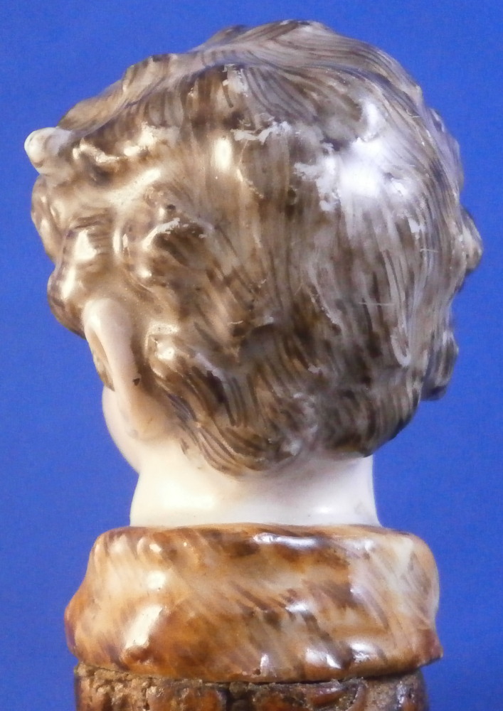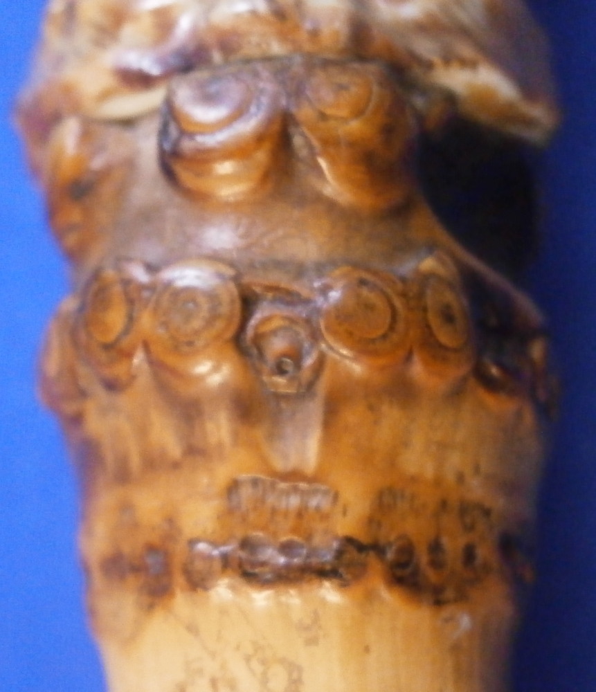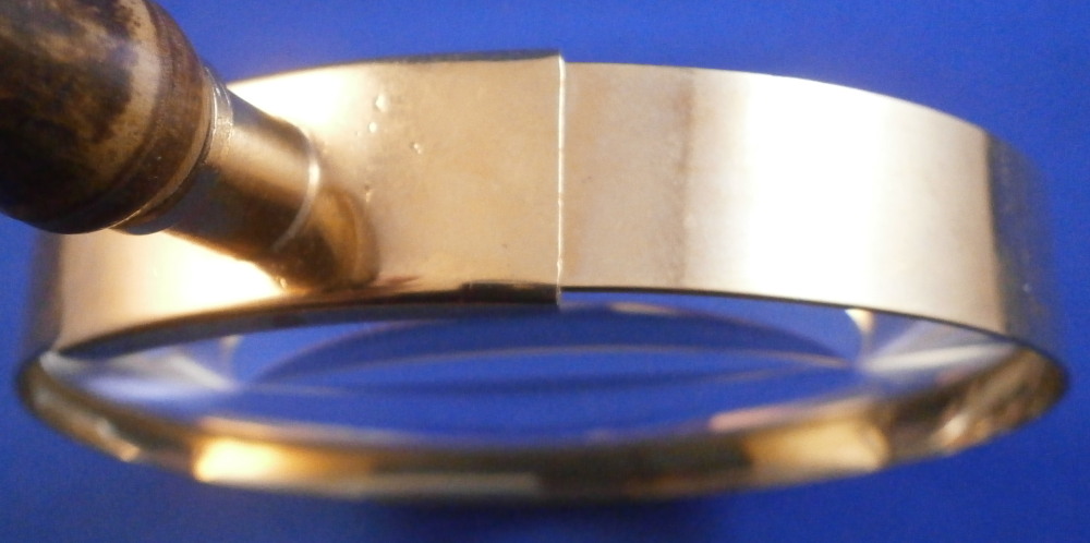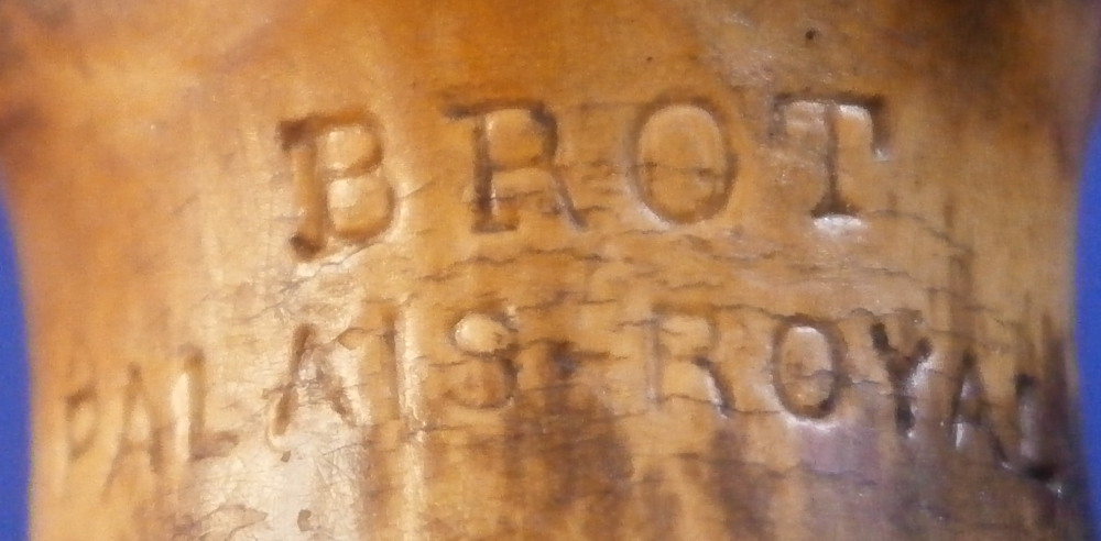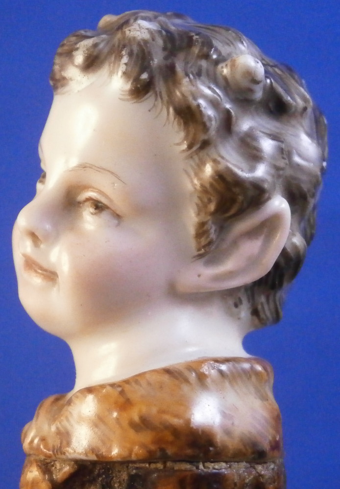 This is an interesting item for the true Meissen crazy person like me :) It is a magnifying glass with a bamboo handle made in France that has a Meissen bottle stopper attached to the end. The figural bottle stopper was made by Meissen in the 19th century . It is in the form of a young man's head which I think is meant to be the god Pan since in the hair there are two horns hidden and the ears are pointier than they usually are. The detail of the porcelain piece is superb especially the hand painting. I am not sure how the porcelain head is connected to the bomboo handle but they often have a screw or corkscrew attached to them so I assume that goes into the hollow part of the handle and it has been glued. The handle is really nice with the root system at the end which blends in perfectly with the collar of the porcelain. The handle is marked with an impressed BROT PALAIS ROYAL - I tried to look this up but found nothing except a cane with a silver topper marked the same way. The magnifying glass part is quite powerful and has a brass ring around it with a screw attachment at the bottom that attaches it to the handle. The piece is in superb condition with some wear to the paint of the porcelain head and some minor use marks. The piece displays perfectly and is really neat! The porcelain piece would be marked with the blue crossed swords underneath but since it is glued I cannot access it. The entire magnifying glass 12 inches long with the glass part being just under 3.5 inches in diameter. Please email me for more information or other pictures.