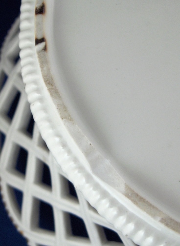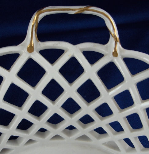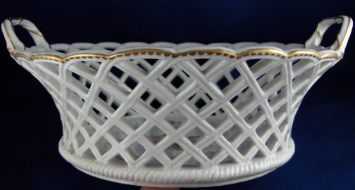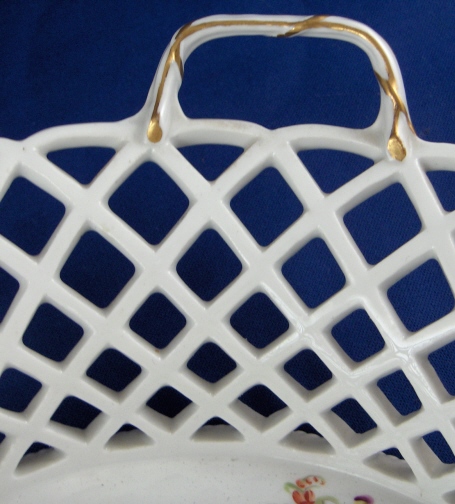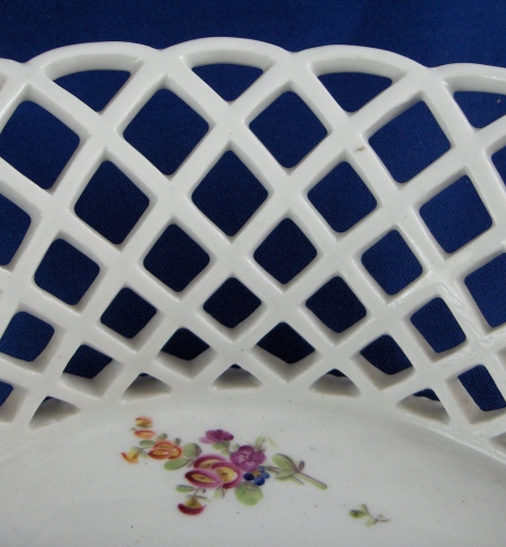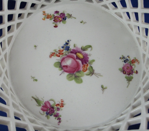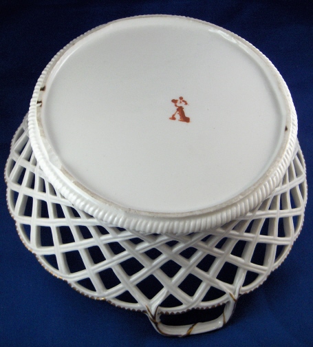This is a nice reticulated basket made by Rue Thiroux also known as Fabrique de la Reine. Marie Antoinette was a patron of this maker and thus they were allowed to use the A under a crown mark. The piece is handpainted with a larger floral arrangement in the center with three smaller ones around it and a few tiny leaves in between. The rim of the basket is reticulated with the outside having a design like it was woven to it with a gold trim ot the top. A handle on each side with some gold trim finish off this very nice basket! The piece is in superb condition with a few black firing spots normal to the 18th century pieces and a larger and a tiny chip to the footring neither of which takes away from the piece when on display! The basket is marked underneath with the underglaze red A under a crown mark. It is 2.875 inches tall and 8.5 inches in diameter. Please email me for more information or other pictures.