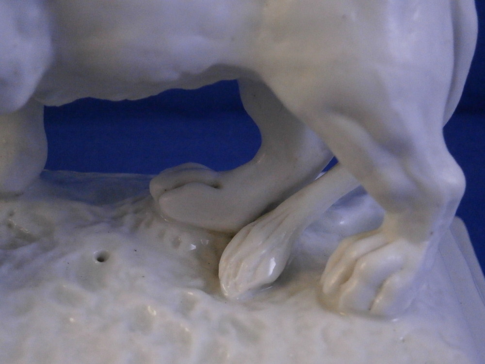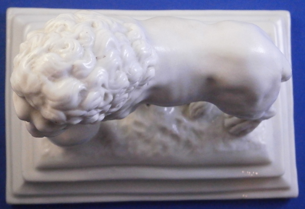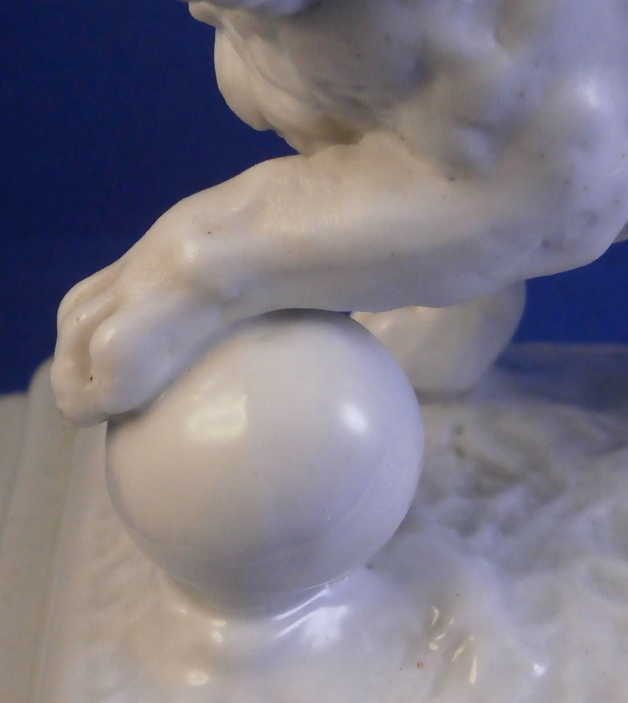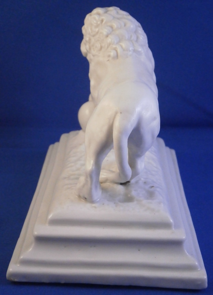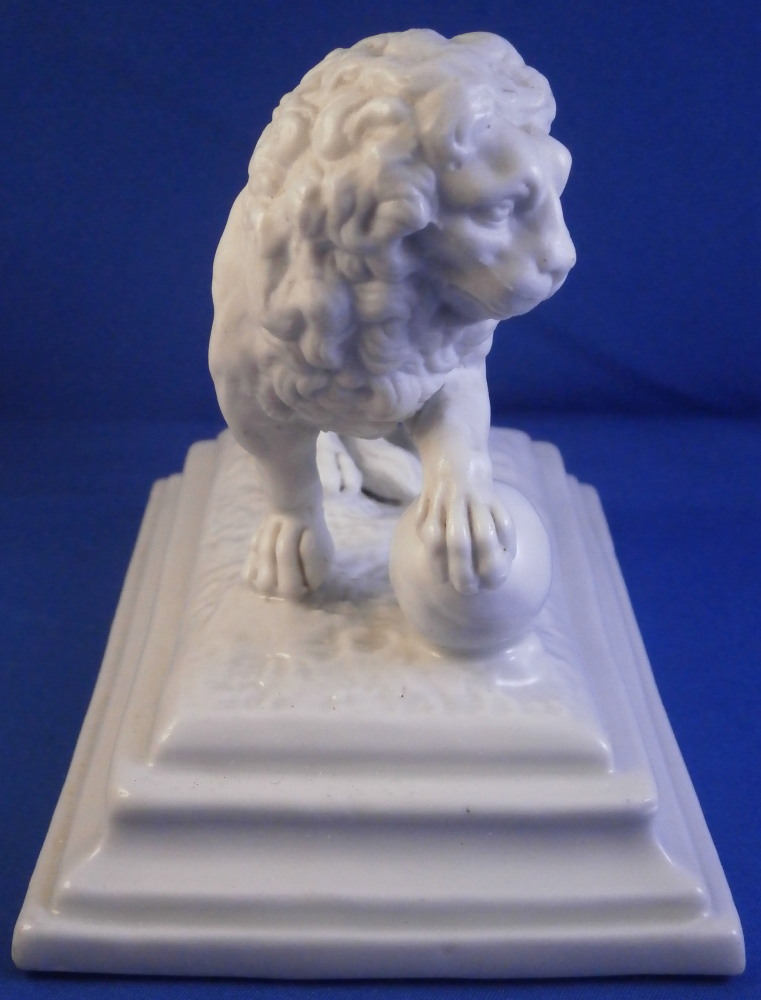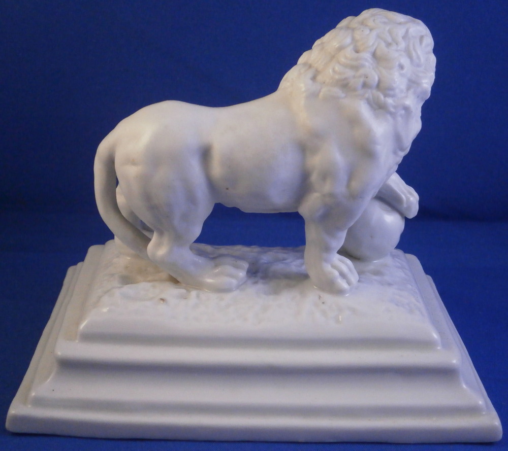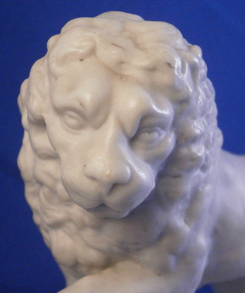 This is a porcelain figurine most likely made in France or possibly in Italy in the 19th century. It is of a male lion with a sphere or ball under its front left paw standing on a base reminiscent of what today is known as the Medici lion. The lion is mostly unglazed porcelain while the ball and base are fully glazed. It is nicely modeled with good detail! I really like the figure! The piece is in great condition without any issues. Couple minor firing flaws and the base is not quite flat when sitting on a table but as nice as they come. Ther eis a tiny air hole in the center of the top of the base which is unusual as they would normally be found on the underside. The underside of the base is unmarked which mean figuring out the maker will be really difficult but it is certainly French or Italian from the 19th century. The figurine is 4.25 inches tall, 3.625 inches wide and 5.25 inches long. Please email me for more information or other pictures.