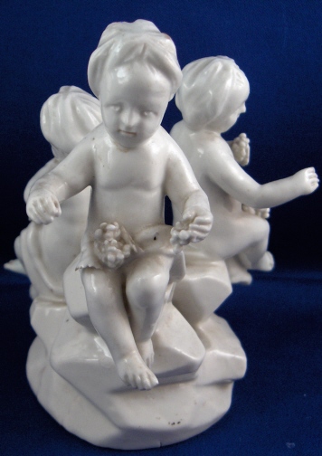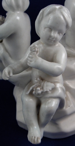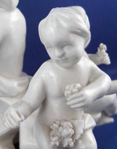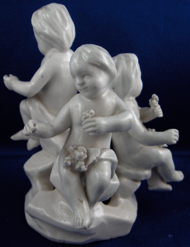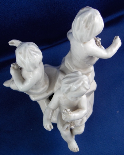This is a figurine most likely made in Italy in the 18th century by one of the smaller makers like Este or maybe by a French maker like Orleans during the 18th century. Very hard to tell. Either way it is a superb figurine of three putti sitting on a rock base while they are holding flowers in their hands. A nicely modeled piece and more valued back in the days because it was left unpainted. Amazingly this piece is in the same condition as the day it was made except for one chipped leaf and a little dirt. It off course has a few of the firing spots from the making that we always find on the 18th century goodies of this sort. The figurine is not marked but that's common. It is 4.875 inches tall and about 4.5 inches wide. The base has a diameter of about 2.5 inches. Please email me for more information or other pictures.