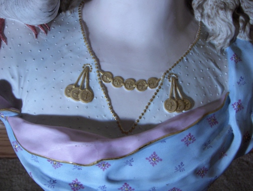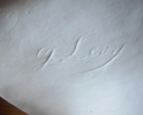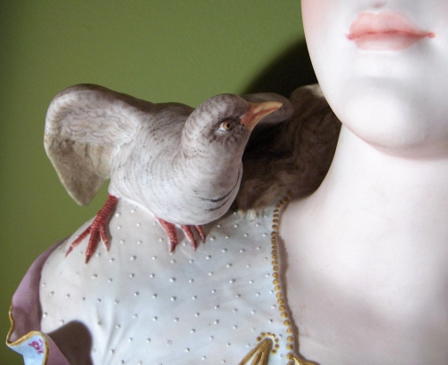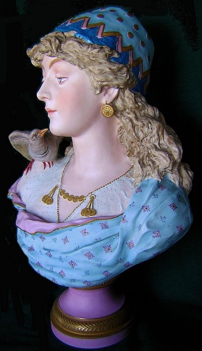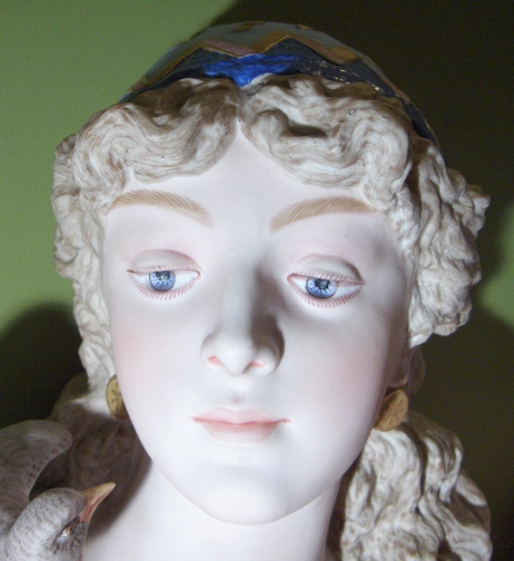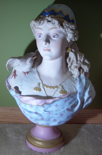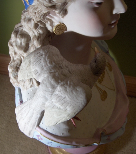 This is a gigantic parian porcelain bust of a lady with a bird on her shoulder made in France by Charenton around 1876. The bust is signed by the artist in the back which looks like CH Levy who was active there around that time so that fits. I do believe this bust is supposed to represent innocence since she is often modelled as a pretty lady with a bird on her shoulder. Whoever she might be this piece is superb and amazingly large for a porcelain piece! The bust is 19 inches tall, 13 inches wide and 8 inches deep or so. The detail is amazing and she extremely well painted for a large piece. The pupils even go into the eye just like old marble statues. And amazingly the whole piece is in great condition with a meaningless chip to the underside tail of the bird one needs to feel for to find. Usually large porcelain pieces have major firing issues like cracks but this piece only has a few minor firing cracks that don't take away from her at all! She is marked underneath with the fairy wand kind of mark used by Charenton around this time. The bust weights around 15 pounds or so so much larger and heavier than any other piece I own. Please email me for more information or other pictures.