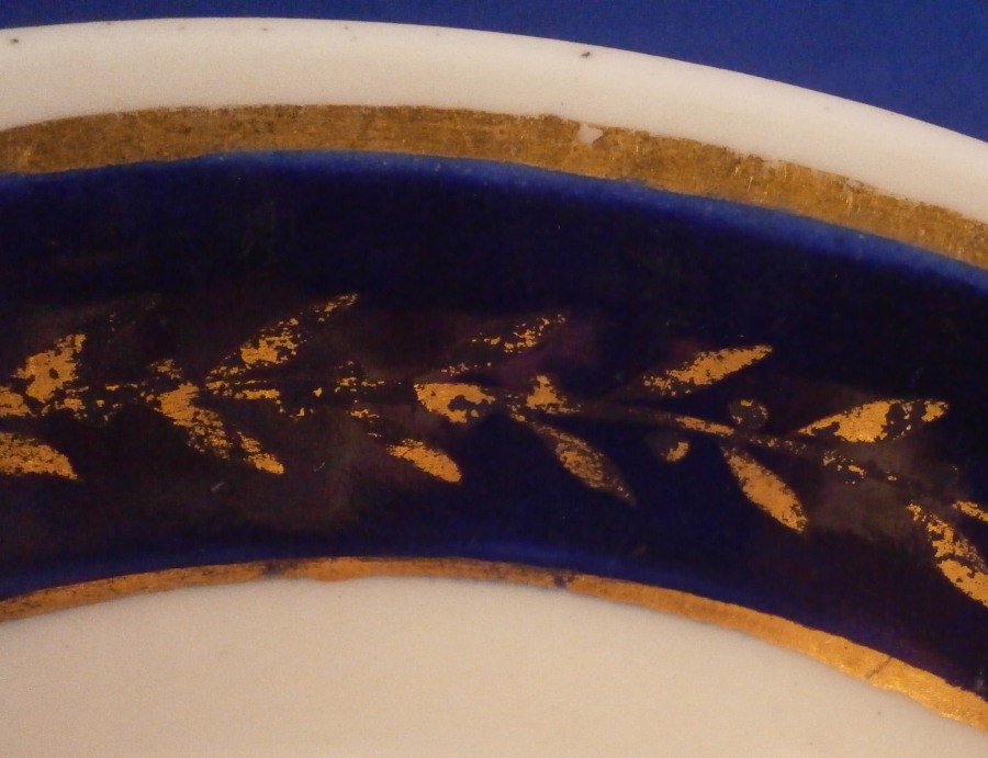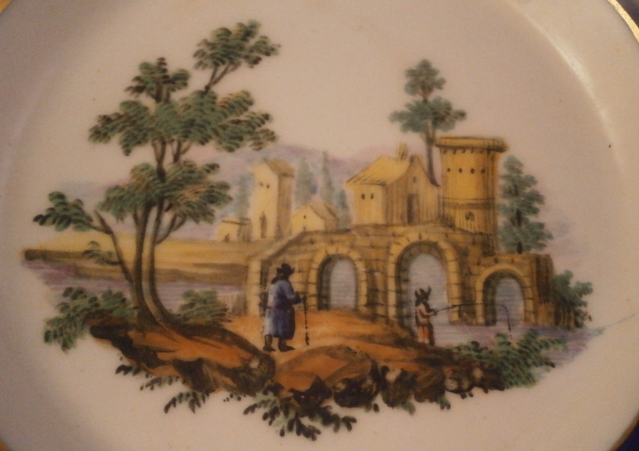 This is a nice saucer dish made in France in the 18th century. The piece is made of soft paste porcelain and is hand painted with a nice land scape scene in the center in the typical Paris style. The scene is of a very nice quality and includes a ruin, some buildings and two people in a landscape surrounding. The rim has a cobalt blue ground color with a gold leaf garland over that and a gold ring to either side of the blue. The shape and paste of the saucer reminds me of Sevres porcelain but it was not done by them. The translucency is green and it has typical moons to it showing it to be from the 18th century. Not sure as to the maker but definitely French from this period. The dish is in great condition with just some wear to the gilding and a small firing flaw around 7 o'clock under the scene. The piece is not marked at all so it is hard to figure out the exact maker. The saucer is 1.125 inches tall and 5.125 inches in diameter. Please email me for more information or other pictures.