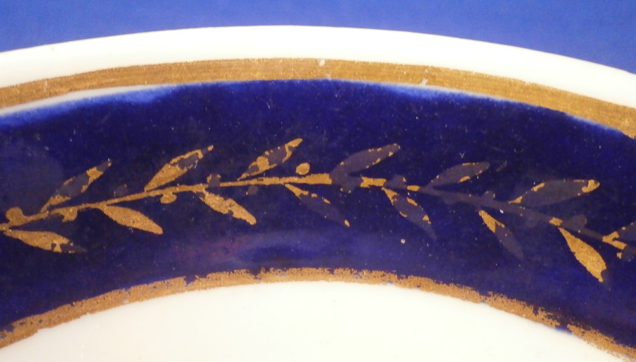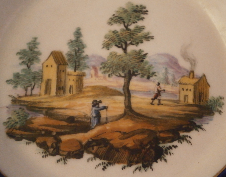 This is a nice saucer dish made in France in the 18th century. The piece is made of soft paste porcelain and is hand painted with a nice landscape scene in the center in the typical Paris style. The scene is of a very nice quality and includes two buildings with mountains in the background and two people in a landscape surrounding. The rim has a cobalt blue ground color with a gold leaf garland over that and a gold ring to either side of the blue. The shape and paste of the saucer reminds me of Sevres porcelain but it was not done by them. The translucency is green and it has typical moons to it showing it to be from the 18th century. Not sure as to the maker but definitely French from this period. The dish is in good condition with wear to the gilding of the leaf garland. There are some strange lines to the underside center but they are not cracks and are only superficial. Not sure what caused them but some sort of firing issue for sure. The piece is not marked at all so it is hard to figure out the exact maker. The saucer is 1.25 inches tall and 5.125 inches in diameter. Please email me for more information or other pictures.