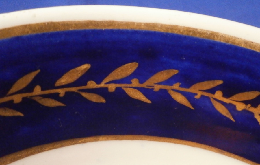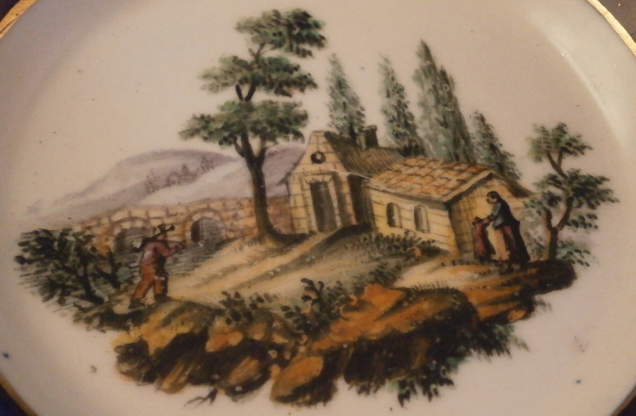 This is a nice saucer dish made in France in the 18th century. The piece is made of soft paste porcelain and is hand painted with a nice landscape scene in the center in the typical Paris style. The scene is of a very nice quality and includes a building with a bridge over some water, mountains in the background as well as two adults and one child in a landscape surrounding. The rim has a cobalt blue ground color with a gold leaf garland over that and a gold ring to either side of the blue. The shape and paste of the saucer reminds me of Sevres porcelain but it was not done by them. The translucency is green and it has typical moons to it showing it to be from the 18th century. Not sure as to the maker but definitely French from this period. The dish is in superb condition with a minor touch of wear. The piece is not marked at all so it is hard to figure out the exact maker. The saucer is 1.25 inches tall and 5.125 inches in diameter. Please email me for more information or other pictures.