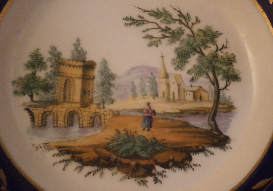 This is a nice saucer dish made in France in the 18th century. The piece is made of soft paste porcelain and is hand painted with a nice landscape scene in the center in the typical Paris style. The scene is of a very nice quality and includes some buildings, a bridge over a river, mountains in the background as well as a person in a landscape surrounding. The rim has a cobalt blue ground color with a gold leaf garland over that and a gold ring to either side of the blue. The shape and paste of the saucer reminds me of Sevres porcelain but it was not done by them. The translucency is green and it has typical moons to it showing it to be from the 18th century. Not sure as to the maker but definitely French from this period. The dish is in great condition with some minor wear. The piece is not marked at all so it is hard to figure out the exact maker. The saucer is 1.25 inches tall and 5.25 inches in diameter. Please email me for more information or other pictures.