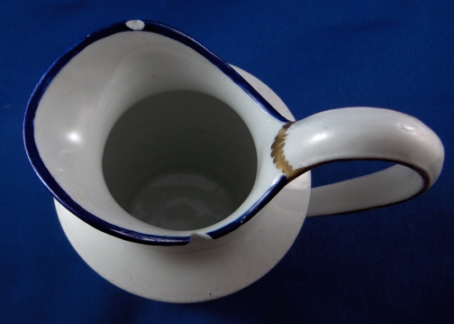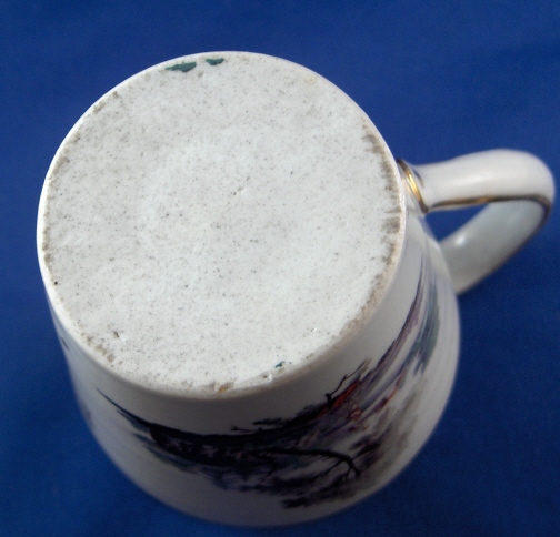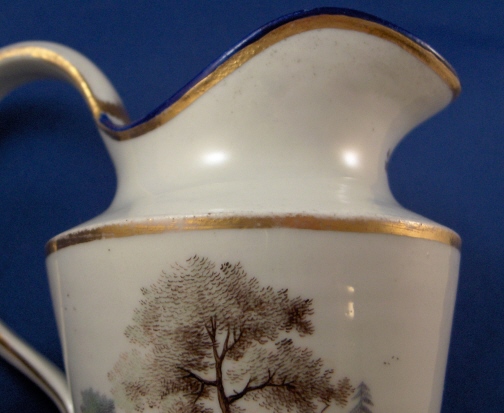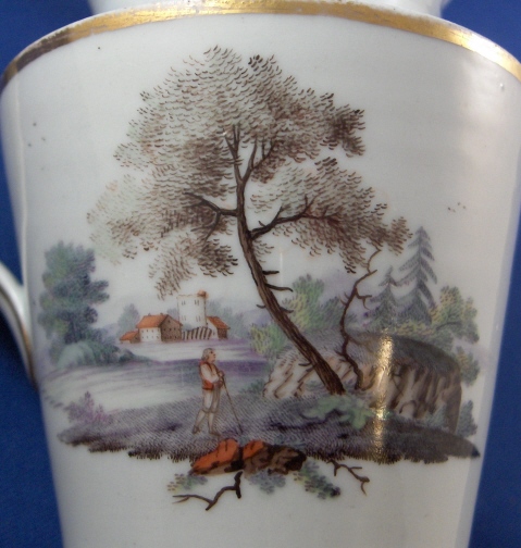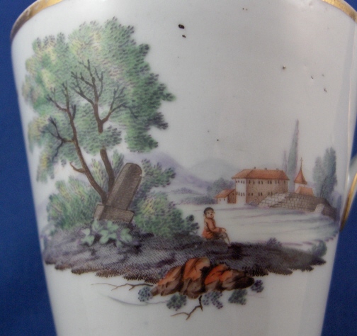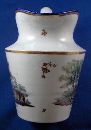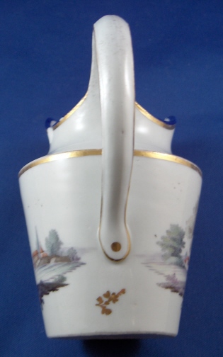 This is a small pitcher or large creamer made in Germany aroun 1780. I have found pieces from this set both attributed to Fuerstenberg and Eisenberg in the literature though I am leaning towards Eisenberg myself looking a the painting style and paste. It has two very very nice scenes hand painted on the sides and a blue and gold trim. The landscape scenes are top quality. The creamer is in decent shape but has two chips to the top rim one being minor and the other not so minor. No hairlines, etc. though. The base is flat and unmarked. The creamer is 4.5 inches tall and has a diameter of 3 inches. Please email me for more information or other pictures.