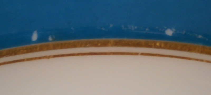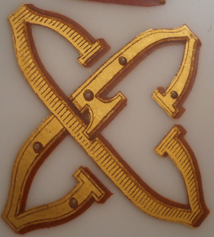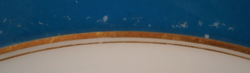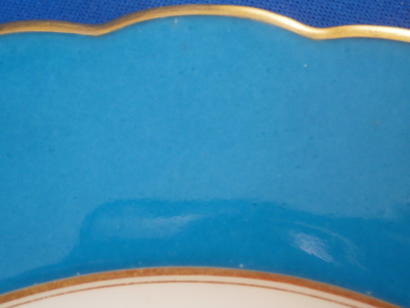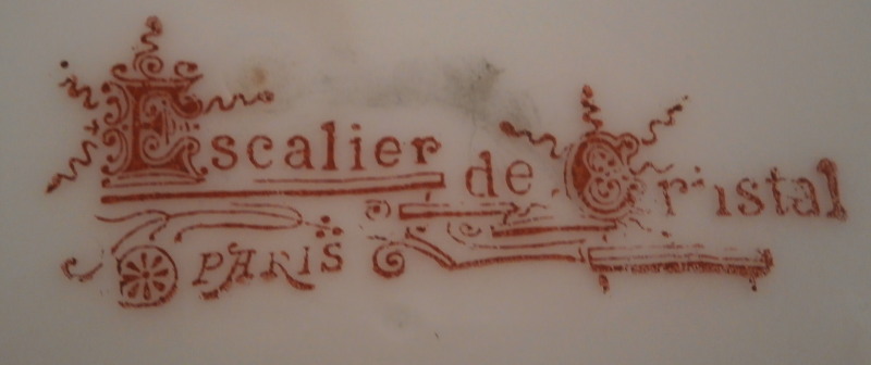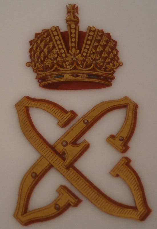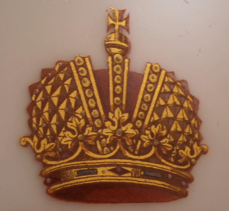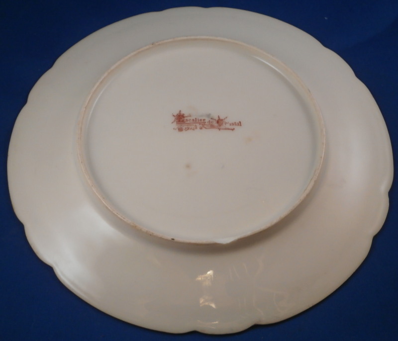 This is an interesting plate hand painted with the red and gold cypher / monogram of the Grand Duke Sergei Alexandrovich and Grand Duchess Elisabeth beneath an Imperial crown. He was the fifth son of Tsar / Emperor Alexander II of Russia and she was a German princess of the House of Hesse-Darmstadt who married the Grand Duke. The superb plate was made by Escalier de Cristal of Paris and is marked as such. It has a really beautiful turquoise rim with gold trim on the edge and also the edge of the well and the cyphers / monograms in the center. The detail to the cypher and crown are top and the red and gold combination is just stunning! The plate is in great condition with some wear to the turquoise near the well as shown and a chip to the foot ring also shown. It displays perfectly and is not something you will find again anytime soon if ever. The piece is marked with their red mark as shown as well as an incised line near the foot ring. The plate is 8.625 inches in diameter and 0.75 inches tall. Please email me for more information or other pictures.