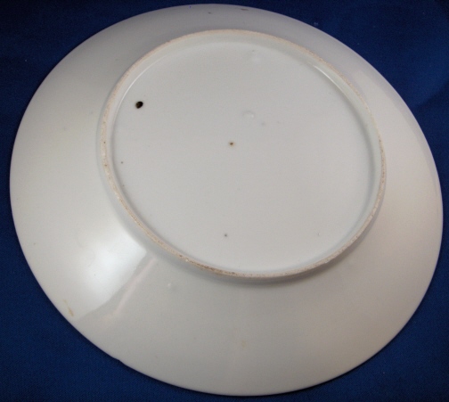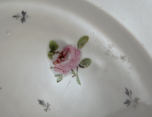 This is a plate made by one of the Paris area makers or at least in France in the late 18th or early 19th century. The design reminds me of a Rue de Crussol plate I once owned. It is nicely painted with scattered roses and small bluish grey leaves filling the spaces in between. Gold trim to the rim. The roses are of good quality. The plate is in good condition with a small rim chip and some wear to the gilding and a little stacking wear to some leaves. One rose hides a giant lump in the paste. The plate is unmarked which is pretty normal with Paris porcelain. It is 1.25 inches tall and 9.125 inches in diameter.  Please email me for more information or other pictures.
