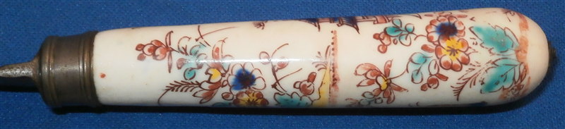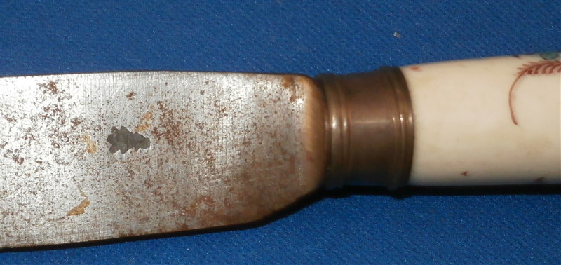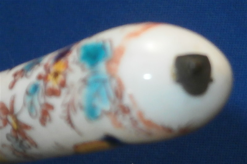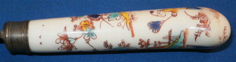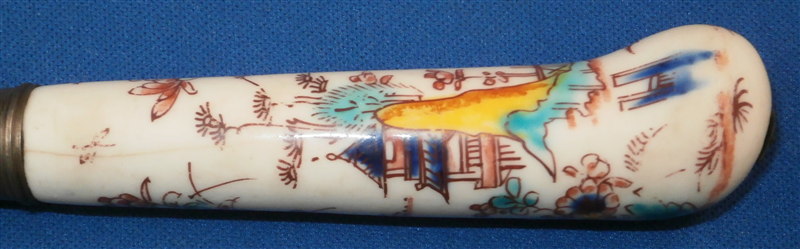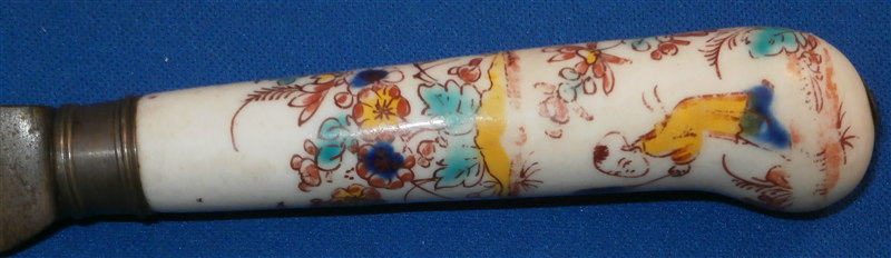 This is a rare large knife with the handle made of soft paste porcelain made by Mennecy around 1740. The porcelain handle is hand painted with a Chinoiserie design in polychrome including a little boy and a building. The blade is steel which is marked as shown and the ferrule is sterling silver. The knife is amazingly complete with the blade which isn't that common. There is some wear to the design which is normal on softpaste porcelain like this and the end that connects to the blade has a hairline. The blade has a bit of oxidation to it as shown which is unavoidable. The piece that sticks out at the end of the handle has a piece on one side missing but that doesn;t affect anything. The porcelain is unmarked which is the norm. The knife is 10.125 inches long of which the visible porcelain handle is about 3.375 inches. Please email me for more information or other pictures.