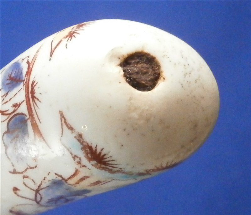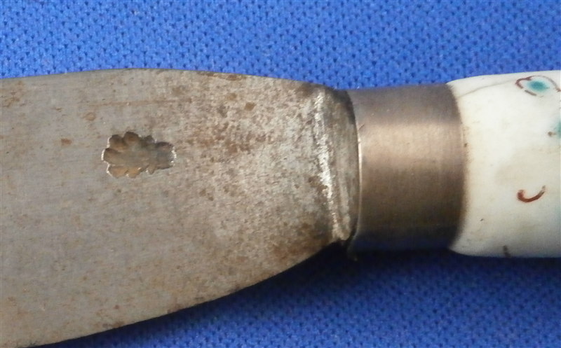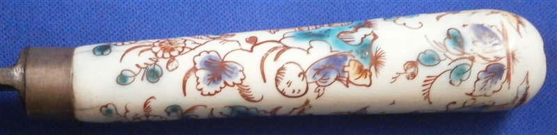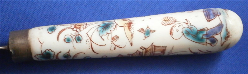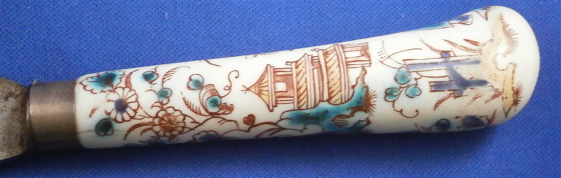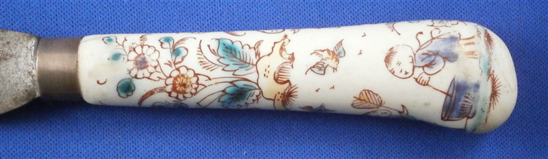 This is a rare large knife with the handle made of soft paste porcelain made by Mennecy around 1740. The porcelain handle is hand painted with a Chinoiserie design in polychrome including three little boys, some flowers and a building. The blade is steel which is marked as shown and the ferrule is sterling silver. The knife is amazingly complete with the blade which isn't that common. There is a little wear to the design which is normal on softpaste porcelain like this and the end that connects to the blade has two short hairlines. The blade has a bit of oxidation to it as shown which is unavoidable. The piece that sticks out at the end of the handle has the little sterling silver cover missing and the ferrule which is a later replacement I think has a dent to the edge. The porcelain is unmarked which is the norm. The knife is 10.5 inches long of which the visible porcelain handle is about 3.5 inches. Please email me for more information or other pictures.