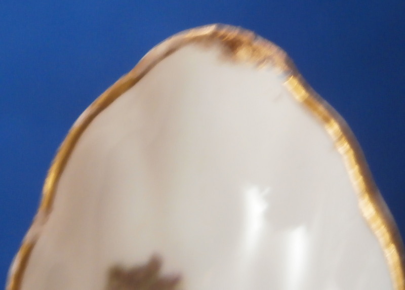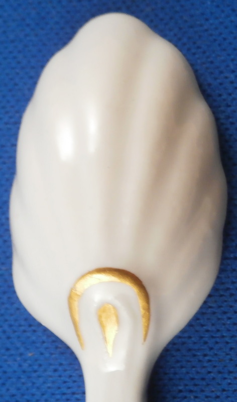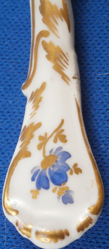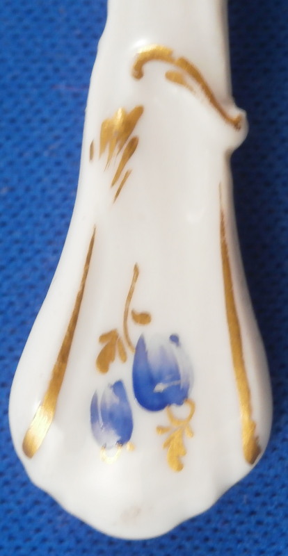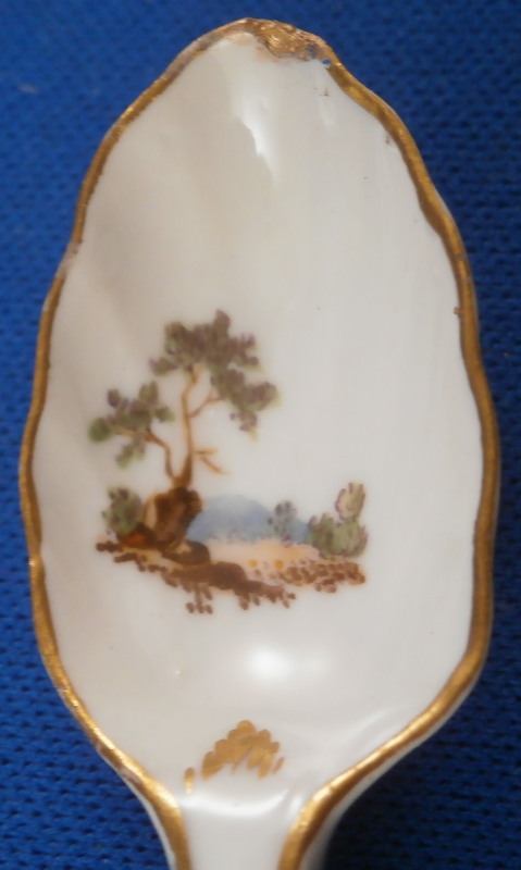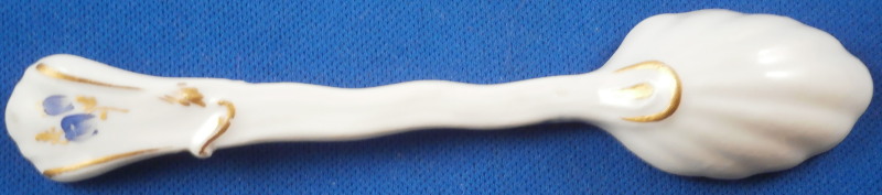 This is a cute spoon made by Fuerstenberg of Germany in the 18th century. It is actually marked but it looked more like some blue lines until I held it at the right angle and it became clear that it was in fact an udner glaze blue script F mark on the side of the handle. It is hand painted with tiny scene to the bowl part of the spoon, a blue and gold flower to the end part and lots of gold highlights some of which are on relief designs. Even the back of the spoon is painted with another blue flower and some gold trim. The spoon displays nicely but has a small chip that was gilded in on the very tip of the bowl part as shown. It displays nicely! The spoon is 4 inches long with the handle being 2.75 inches long and the bowl 1.25 inches by 0.75 inches. Please email me for more information or other pictures.