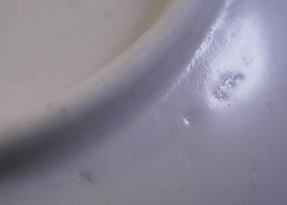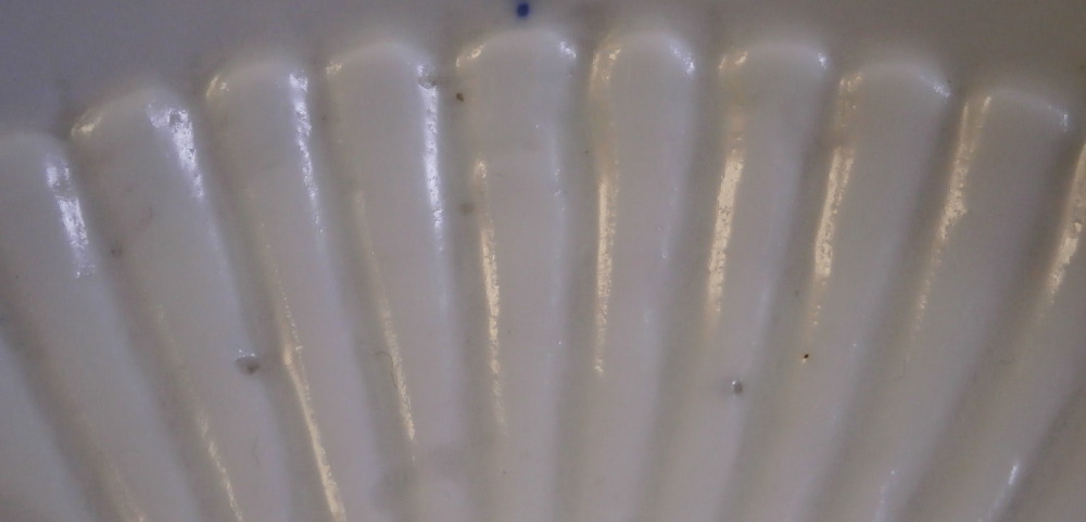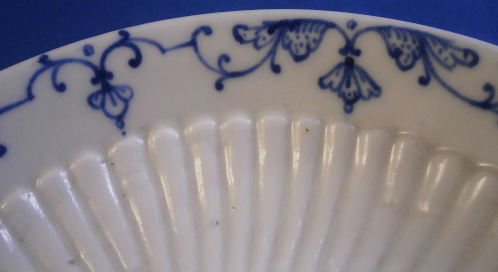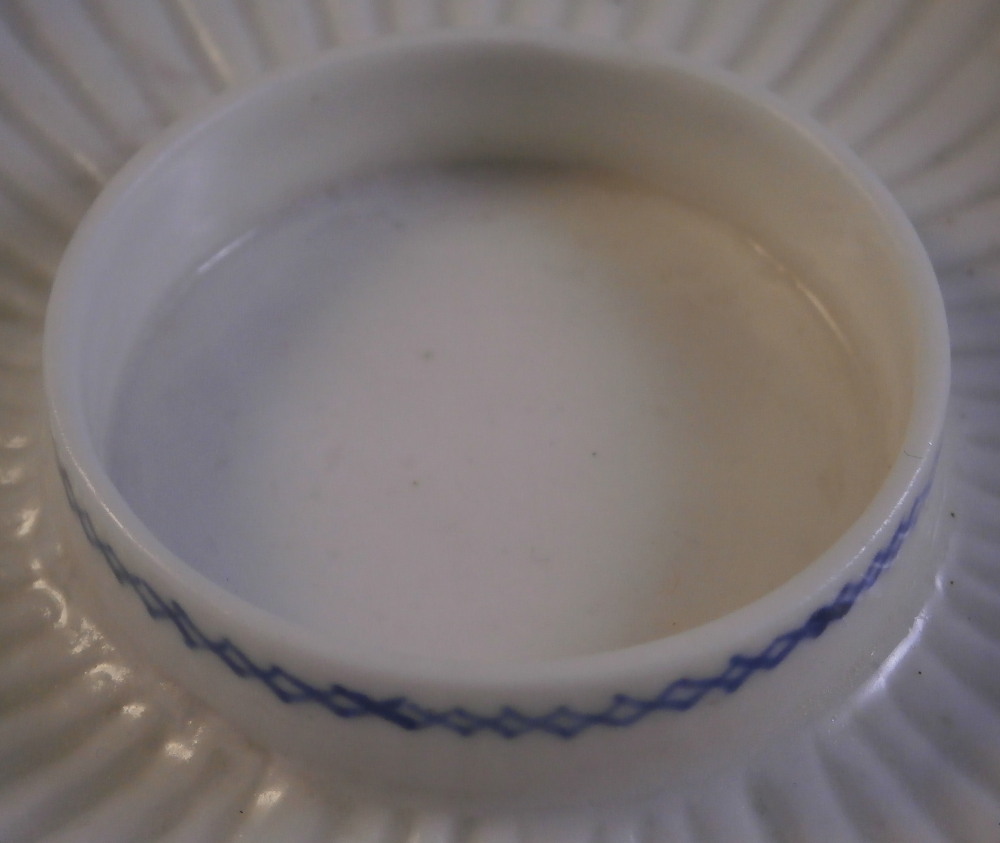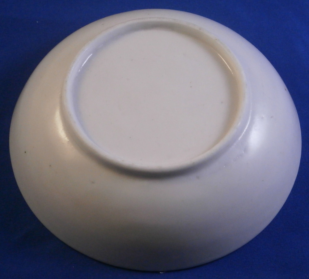 This is a nice saucer made in France in the 19th century. Made to look like St. Cloud and very difficult to see the difference but appears to have been made by Samson or another maker. It has that same creamy color to it with an under glaze blue decoration that is quite nice. The saucer has a ribbed design to the paste in a section below the blue decoration and it has a little rim around the center well to keep the cup from moving around much like a trembleuse saucer. The inner circle is smaller on this piece than the other example I own, having an inner diameter of about 1.625 inches. The piece is in great condition with some minor manufacturing flaws. The saucer is 1.25 inches tall and 5.125 inches in diameter. Please email me for more information or other pictures.