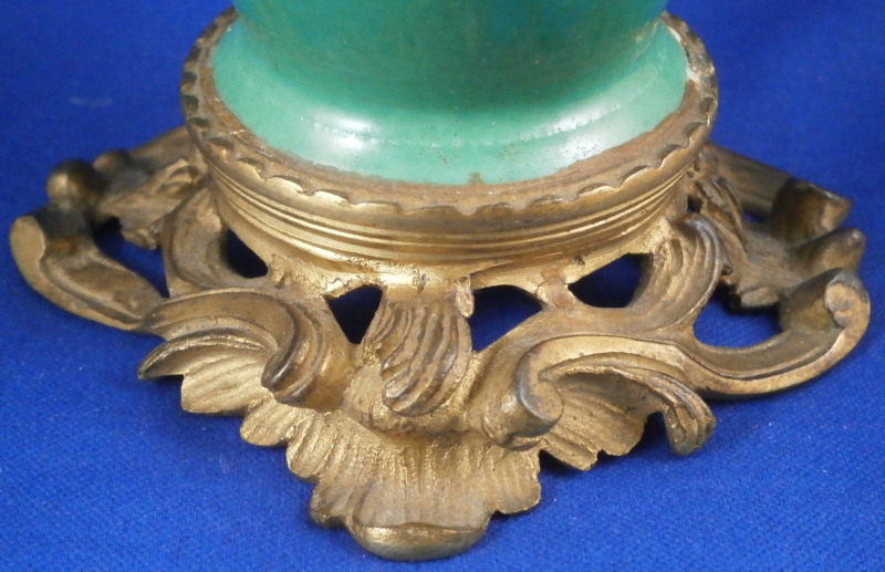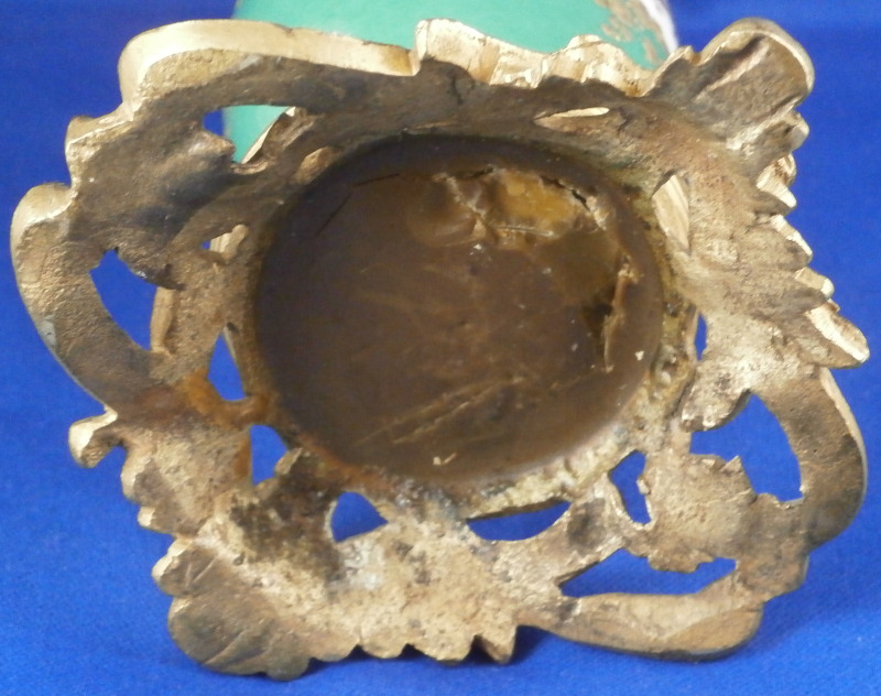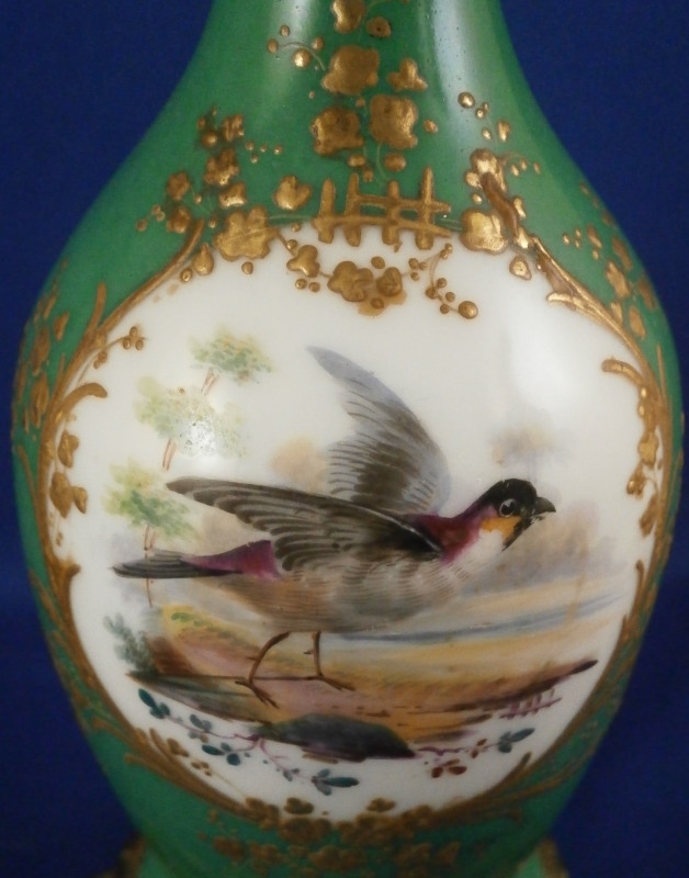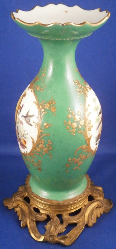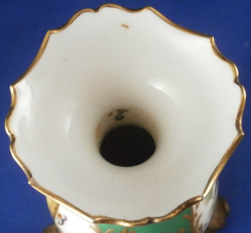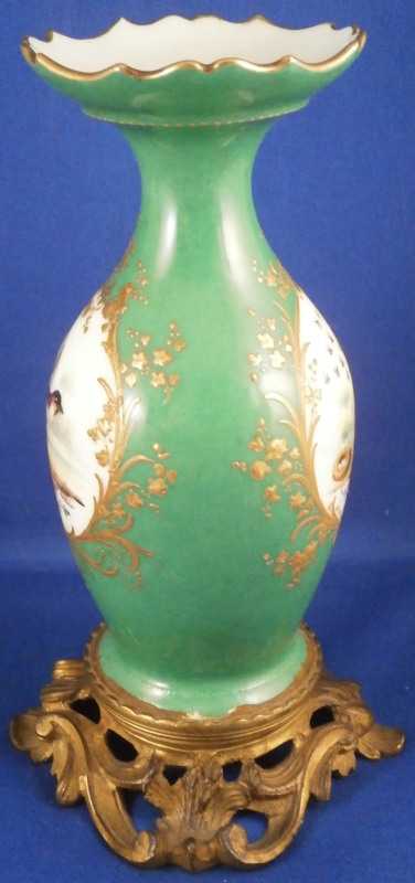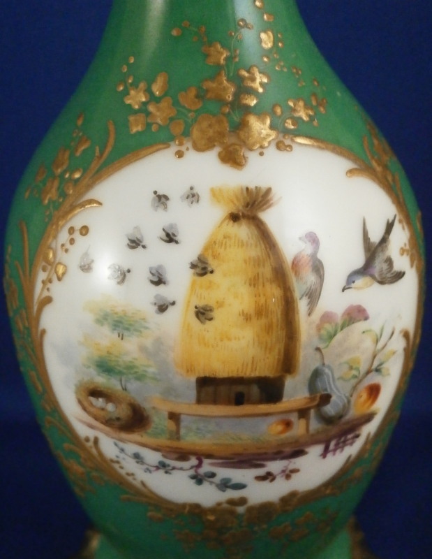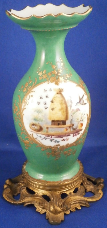 This is a fun scenic vase made by one of the Paris makers around the early 19th century. Very much in the style of Jacob Petit but could be another maker as well. What is rare about this piece is that it has the ormolu metal base which meant it was quite valued by someone and it has a scene to one side oincluding a beehive which is really rare to find. The vase has a nice green ground color with some raised gilding around the scenes. One scene is of a bird in a landscape whicle the other has the beehive sitting on a table with a bird hanging on one side while another one is going in for the landing, some bees swarming, a nest on the ground with eggs in it and some fruit on the ground as well. A really cute and well done scene with that rare addition for the modern beekeeper to collect :) The hand painting is of a very nice quality! The vase is not marked or at least not visibly because of the substance that is holding it in the ormolu base is covering the entire bottom. It does have a 2. in the neck of the top which does not help much. The piece is 6.375 inches tall including the metal base and about 2.5 inches in diameter. The base is 3.75 inches wide and deep. The vase is in great condition with a minor rough spot to a point on the top edge and a glaze flaw in the center of the bird. Neither takes away from the piece and it displays perfectly! Please email me for more information or other pictures.