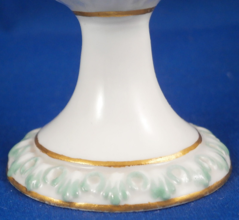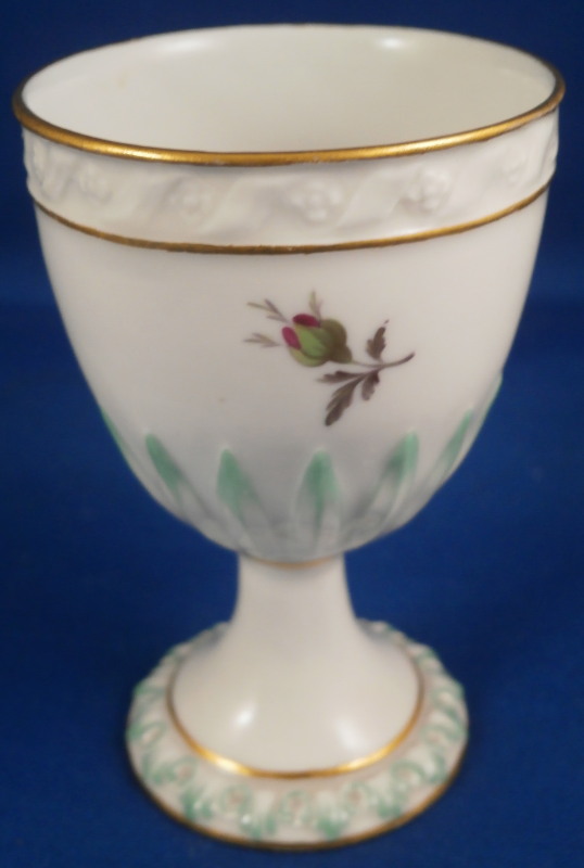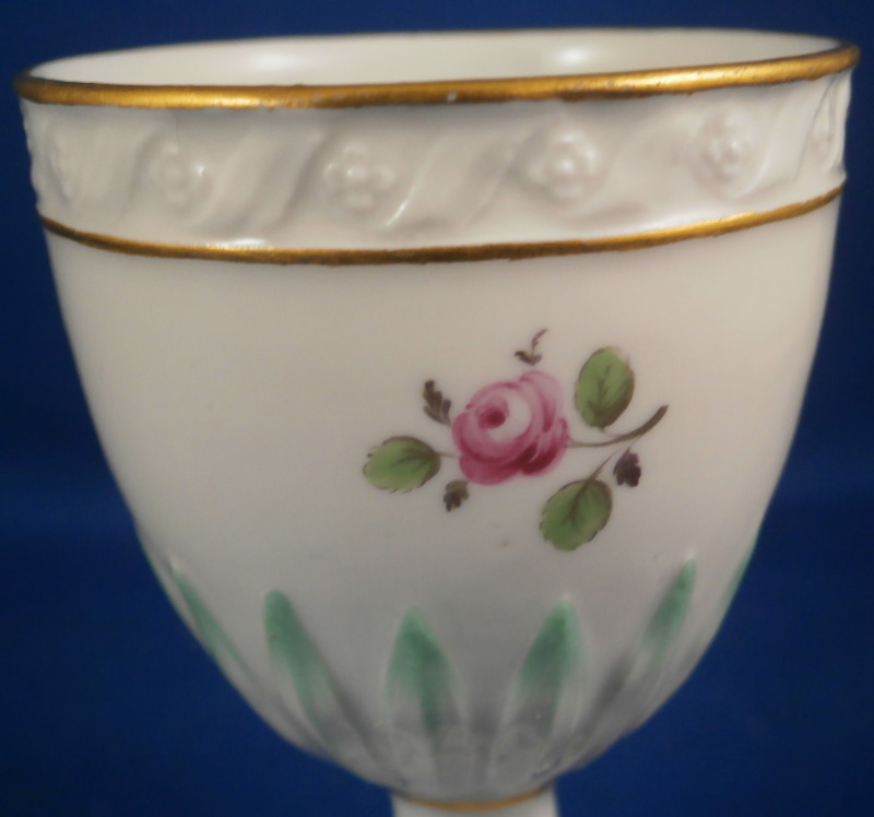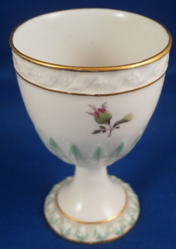 This is a nice egg cup made by Fuerstenberg in the 18th century. It has some nice relief designs to it along the top and bottom edge as well as the center. The ones along the edge of the foot and along the center are handpainted with a bit of green while the top design has gilding to either side. Three roses painted in the white area between the designs. One is in full bloom while two are buds with their leaves. The eggcup is in perfect condition which is always nice. It is marked with the under glaze blue F mark as well as the number 5 and some incised marks as shown. It is 3.125 inches tall and 2 inches in diameter. Please email me for more information or photos.