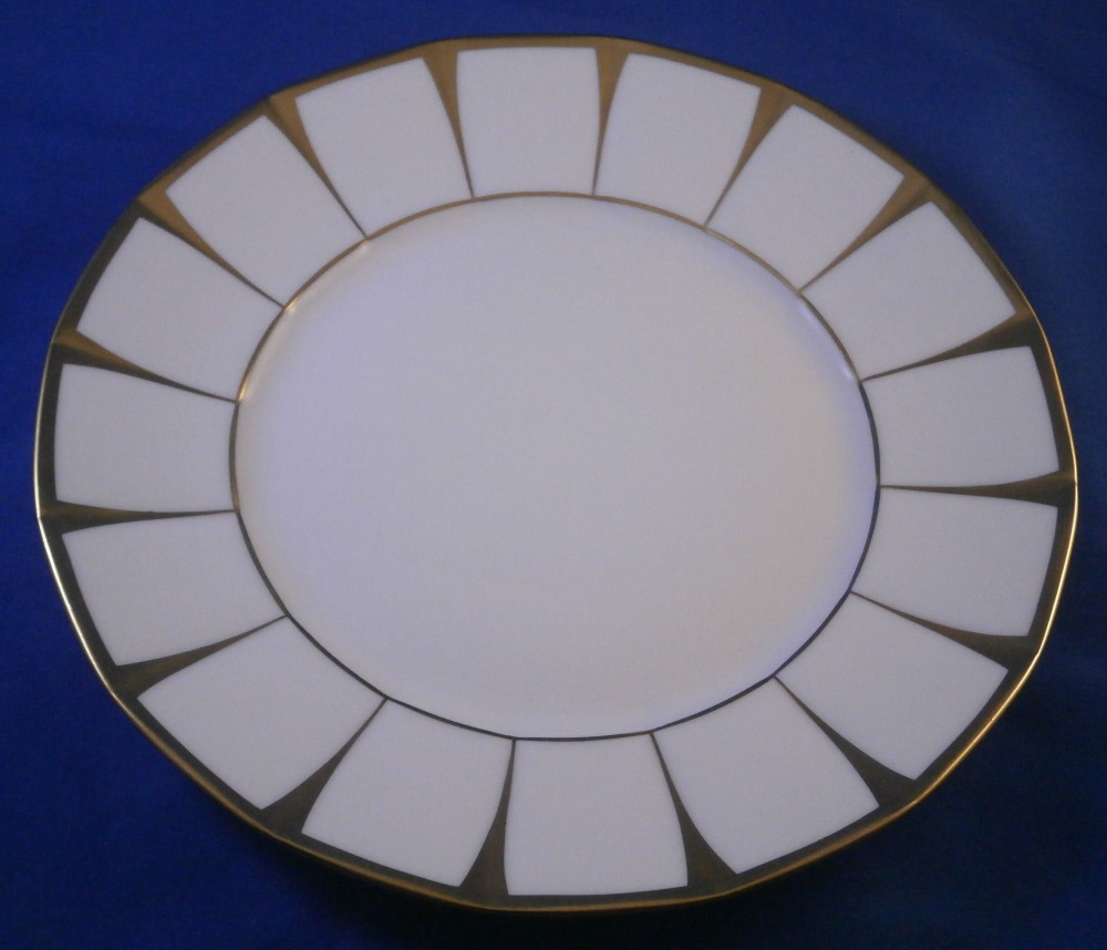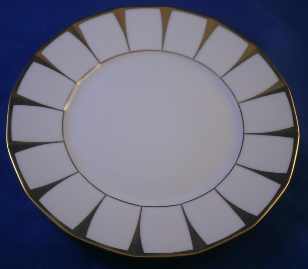 This is a set of six dessert plates made by Fuerstenberg around 1970 I believe. This is probably their most popular modern service these days but it is based in a Biedermeier service created in the mid 19th century. Nice design that is just white and gold. Very elegant. Each plate has a gold trim to the edge and another gold trim around the well. Between these there are thin triangular shapes jutting from the edge where they are wider to the inner gold trim where they are thin. Looks great and is one of those timeless designs. Each piece is marked with the underglaze blue F mark underneath as shown. They also all have Seit 1747 (since 1747) and some red letters and numbers as shown. Each in great condition and about 0.875 inches tall and 7.5 inches in diameter. Please email me for more information or photos.