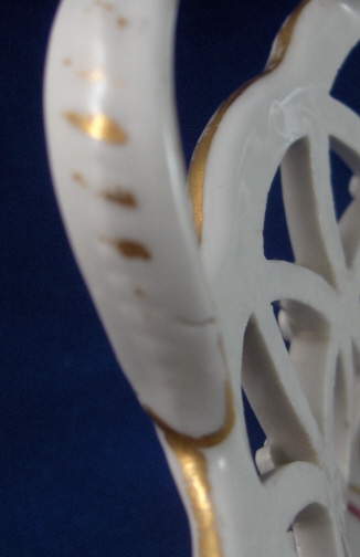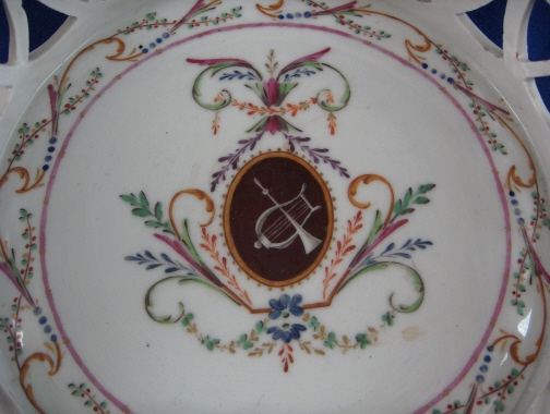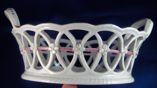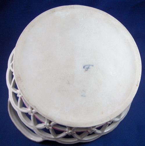 This is a reticulated basket made by Fuerstenberg in about 1780. It is handpainted with a nice colorful design with a musical medallion in the center on the inside bottom of the basket and flowers on the ouside of the basket as well as a pink and gold trim. The piece is in great condition with a small firing crack in one handle, a bit of wear to the gold and some teeny glaze chips on the sides of the reticulated areas from use which don't show unless you search for them. The basket is 2.375 inches tall plus the handles which add another inch and 7 inches in diameter. Marked on the underside with the blue script F mark, and incised cross, an incised S and 2 as well as a blue number 2. Please email me for more information or photos.