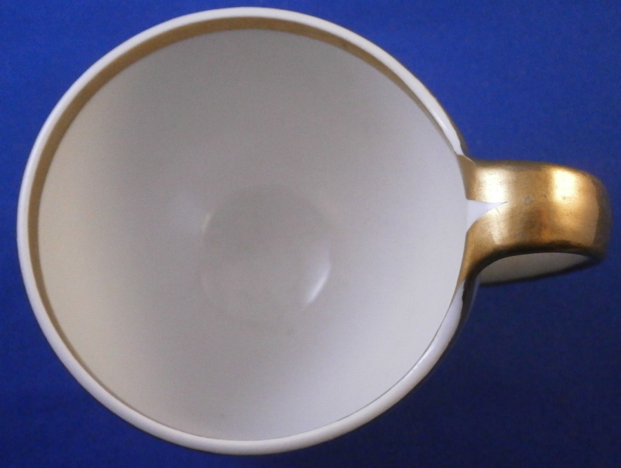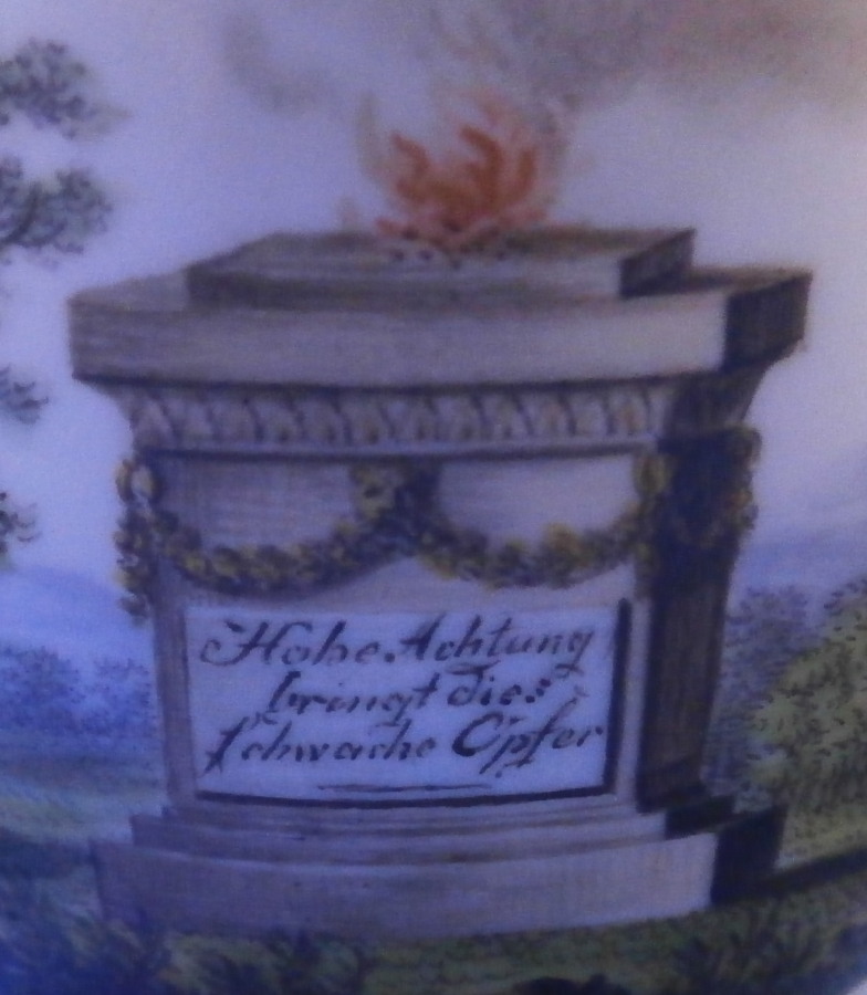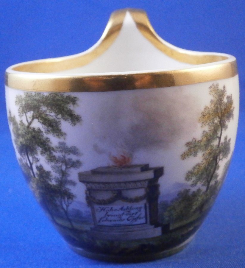 This is a nice cupand saucer set made by Fuerstenberg during the Biedermeier period around the early 19th century. The set has a very typical shape to it for this period and maker - very simple yet also very elegant. It is called Campanerform. A very sleek shape. The saucer has a scene in the center including a monument in a landscape surrounding and a bit of gold trim to the edge. The cup has a more elaborate scene to it including an altar for offerings with a burning flame in the center in a landscape surrounding. The column states: Hohe Achtung bringt dies schwache Opfer. It means something along these lines: High esteem bringt this small offering. The cup has a little gold trim to the top and bottom edge as well as the handle. The cup is just over 2.75 inches tall with the handle and has a diameter of just under 2.75 inches. The saucer is 1.125 inches tall with a diameter of 5 inches. The set is in nice condition with just some wear to the gilding mainly around the edge of the saucer and a small chip to the inside foot underneath the saucer as shown. Both are marked with the under glaze blue script F mark as well as some incised / impressed marks and a blue 19 under the cup as shown. Please email me for more information or photos.