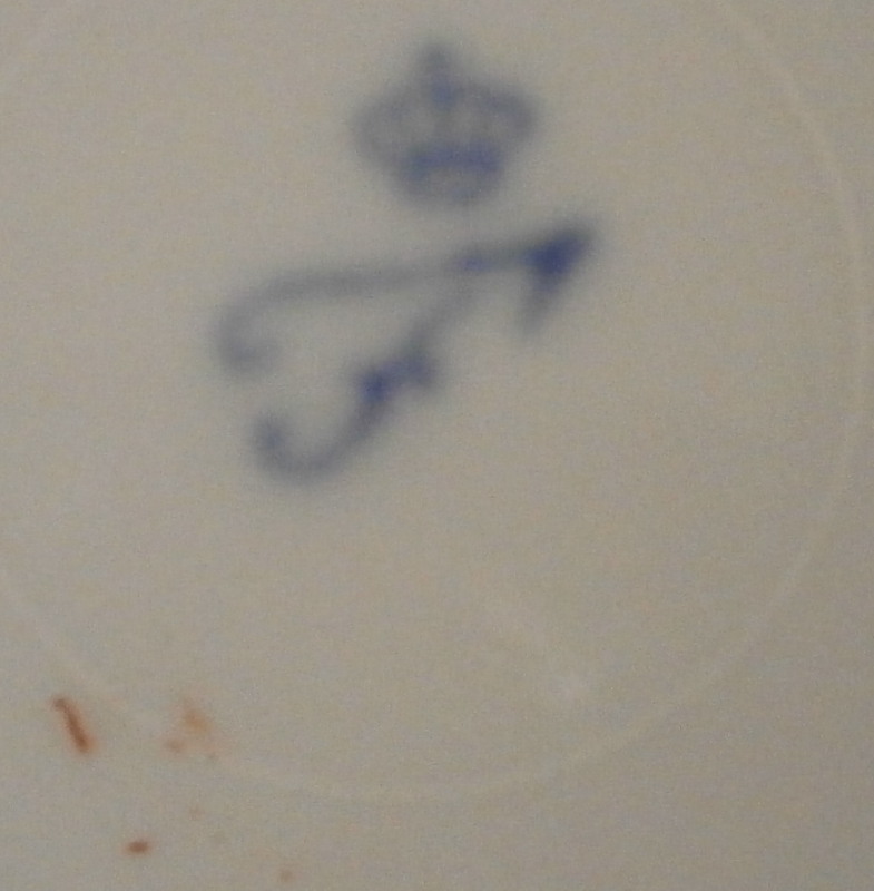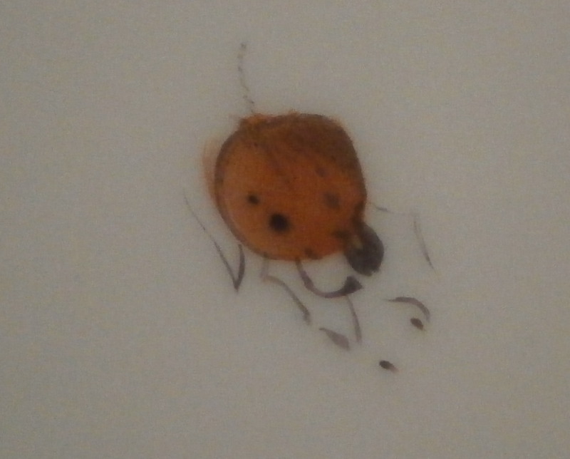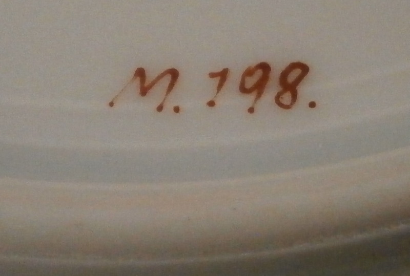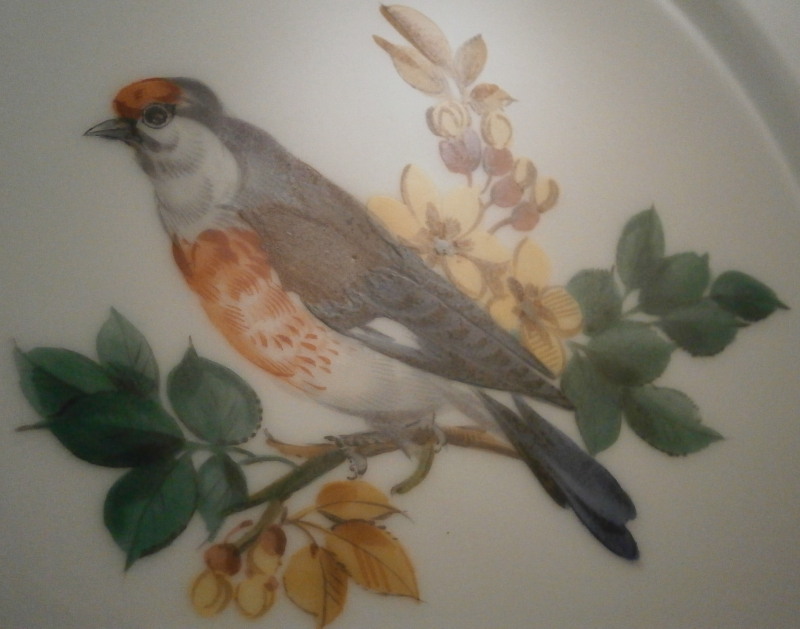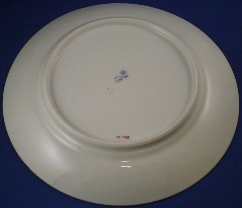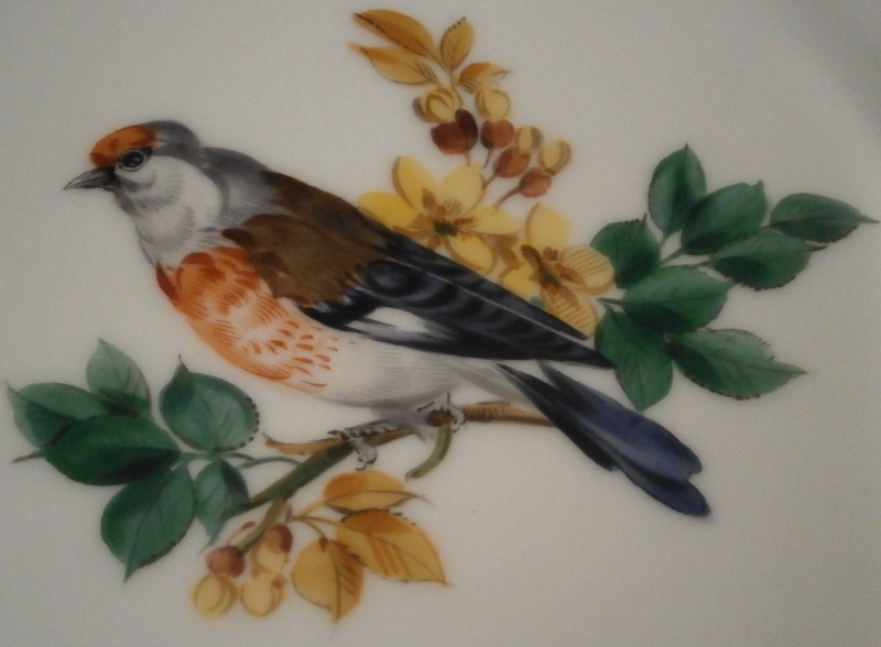 This is an unusual plate made by Fuerstenberg in the 20th century. Very unusual to find pieces that are hand painted byt them from this period as the vast majority of their designs are transfer printed. So it was likely a special order of some sort. The plate is very nicely hand painted with a bird scene in the center including the bird sitting on a branch with leaves and flowers on it. The rim has five bugs painted on it and there is a gold trim to the edge. A very elegant piece that looks superb on display. The plate is marked with the underglaze blue F mark under the crown as well as a red number along the foot ring. The piece is about 0.875 inches tall and 8.125 inches in diameter and is in perfect condition. Please email me for more information or photos.