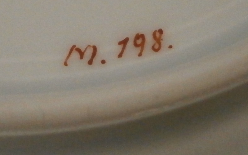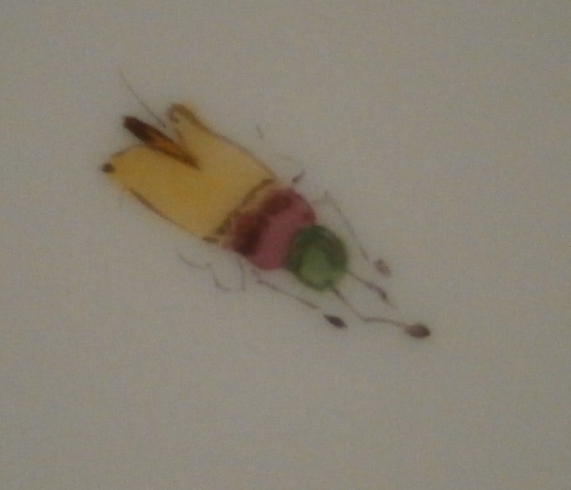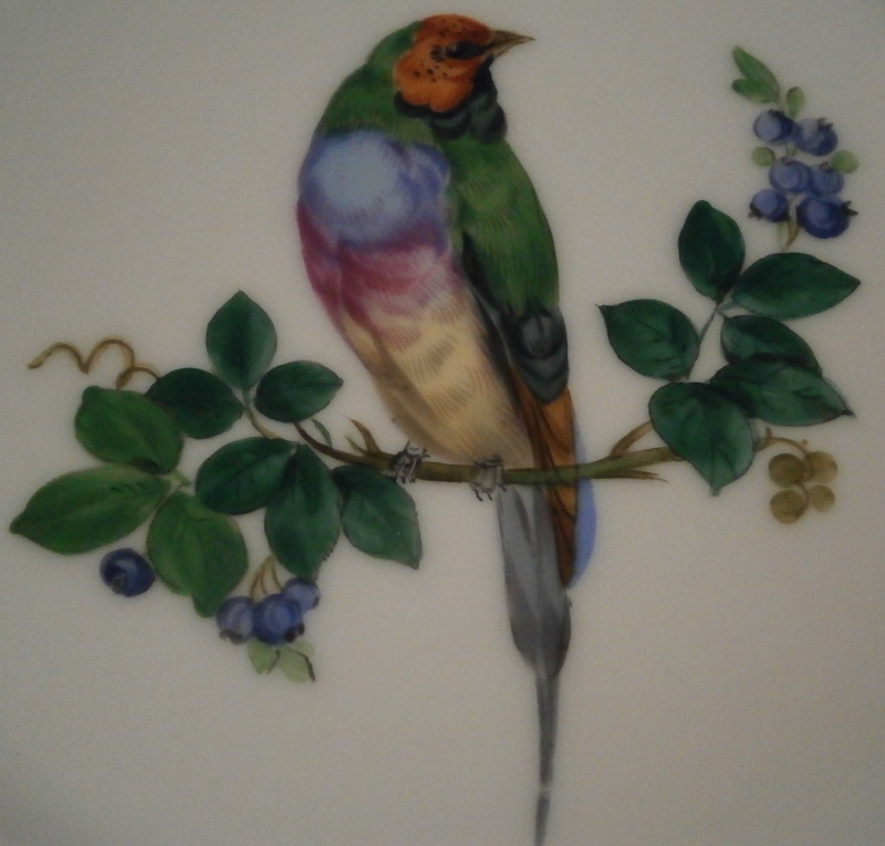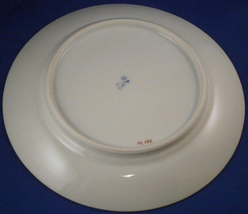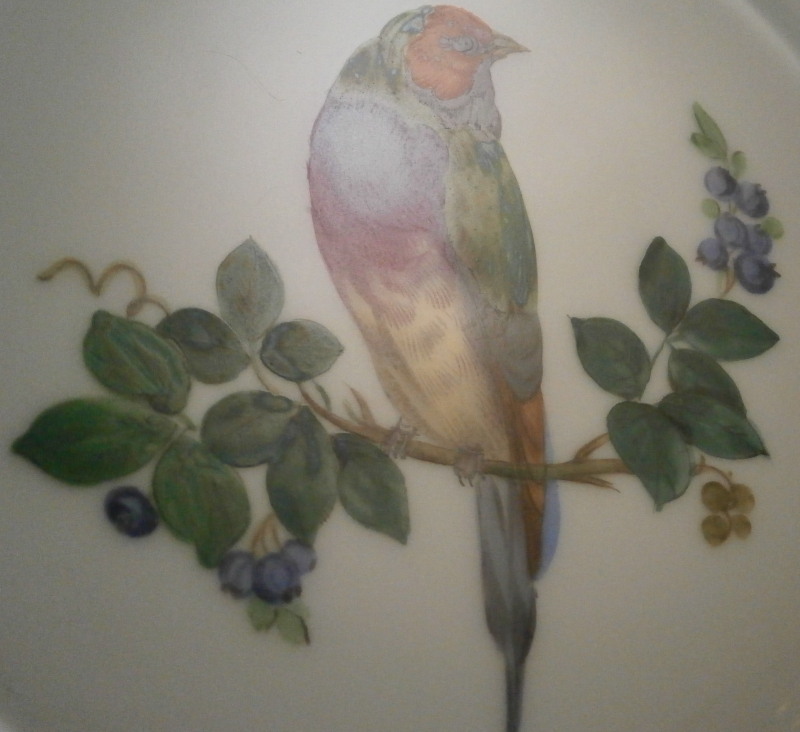 This is an unusual plate made by Fuerstenberg in the 20th century. I have a second one with a different bird if anyone is itnerested in a pair. Very unusual to find pieces that are hand painted byt them from this period as the vast majority of their designs are transfer printed. So it was likely a special order of some sort. The plate is very nicely hand painted with a bird scene in the center including the bird sitting on a branch with leaves and berries on it. The rim has five bugs painted on it and there is a gold trim to the edge. A very elegant piece that looks superb on display. The plate is marked with the underglaze blue F mark under the crown as well as a red number along the foot ring. The piece is about 0.875 inches tall and 8.125 inches in diameter and is in perfect condition. Please email me for more information or photos.