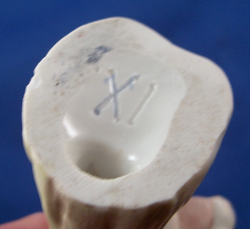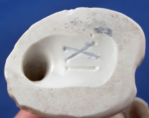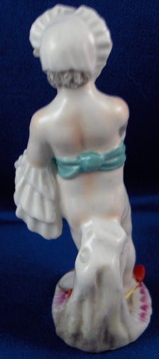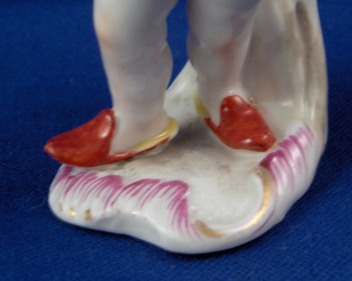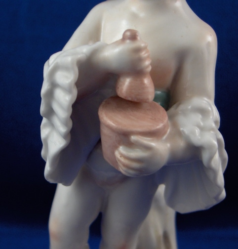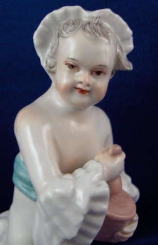 This is a putto made by Fuerstenberg in the 18th century. I am thinking he is a pharmacist / alchemist / chemist which is why he was a must have for me :) Have not seen this model before. It is of a putto using a mortar and pestle oddly enough he looks like he's ready for bed or if he is anything like me he had a brillant idea while falling asleep and just had to get up and try it :) Though his taste in slippers is not like mine! Nicely modeled and painted and an early flat base. This is a really cute piece! It is in perfect condition with just a teeny sliver off mostly the underside base and a firing line where the seem is along his right side from the making. The piece is 3.75 inches tall, 1.75 inches wide and 1.75 inches deep. It is marked with an incised XI and the X was made into crossed swords. Please email me for more information or other pictures.