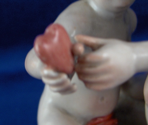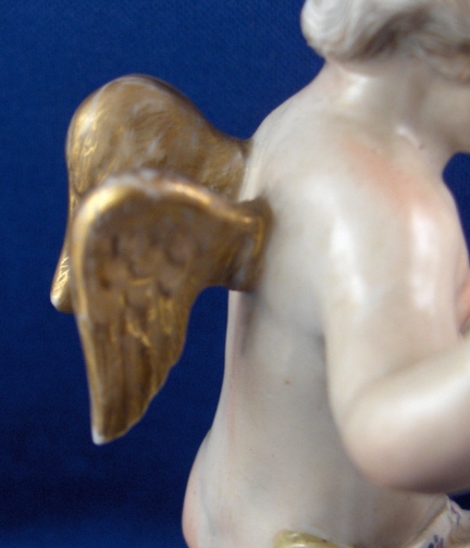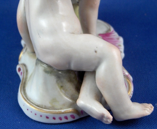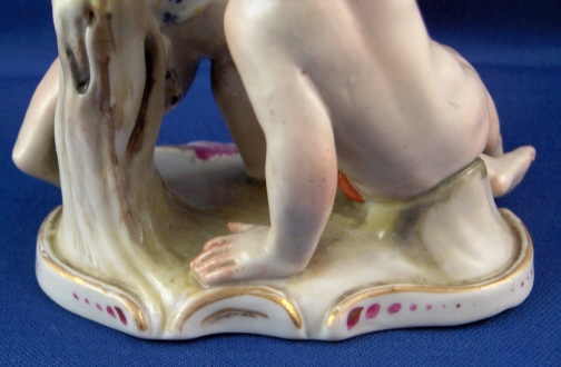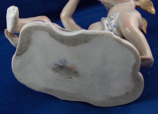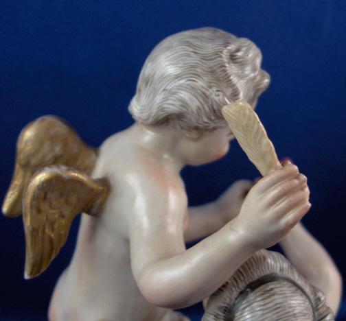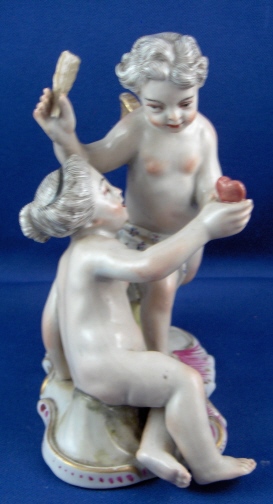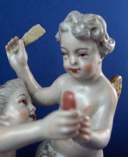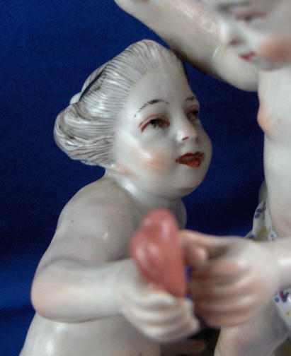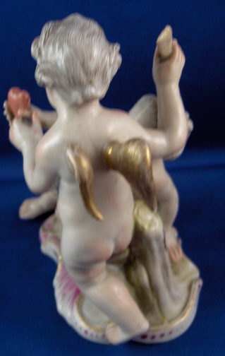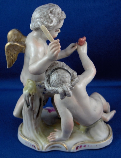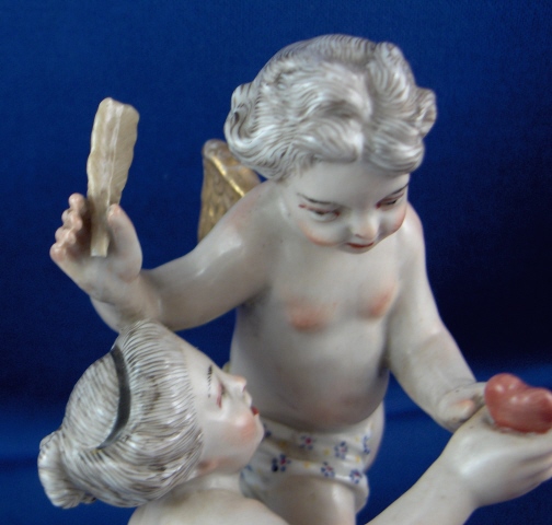 This is a figurine of cherub (possibly Amor) with a lady friend mady by Fuerstenberg in about 1790. A very well modeled and handpainted figurine of a great topic. The piece shows a cupid standing mostly naked with a cloth around the sensitive area with an arrow in his right hand and his left hand touch a female putto's hand that is holding a heart. She is sitting down also only covered with a small cloth. The base is nicely done with a bit of puce and gold trim to the edge. The figure is 4.5 inches tall, 3.875 inches wide and 2.375 inches deep. It is marked with one of the script blue F marks but it is not all thre anymore due to wear and hard to make out - it is however definitely an 18th century piece. The figure is in superb condition with just the bottom tip of the arrow broken off and missing - an easy fix if need be but I think it is fine the way it is right now!. A tiny bit of wear to the gilding on the wings. Please email me for more information or photos.