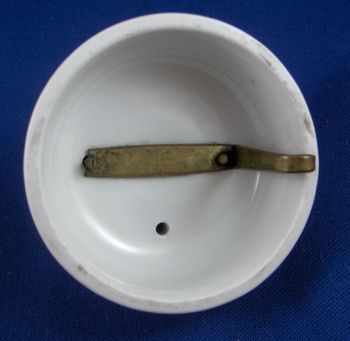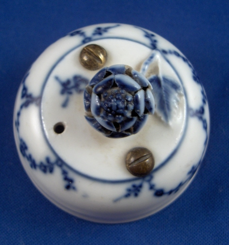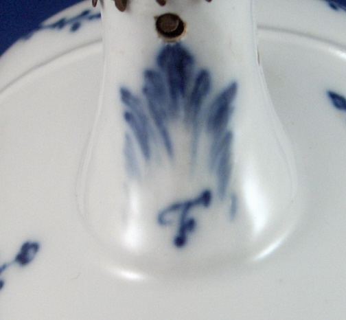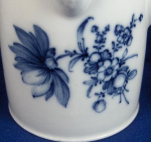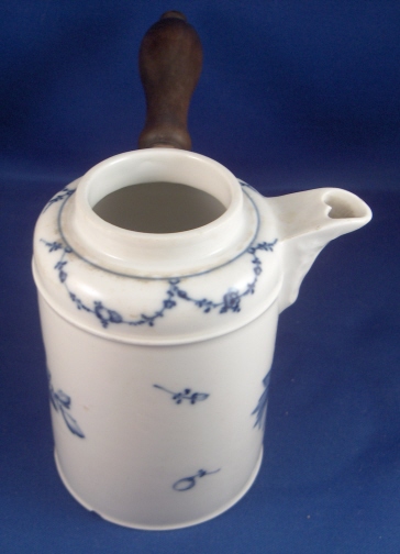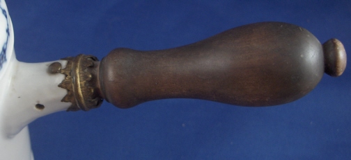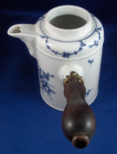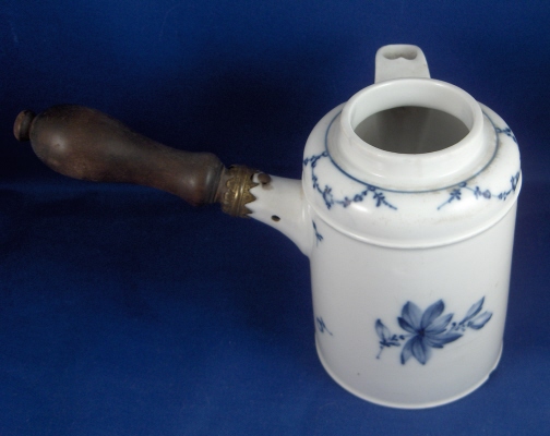 This is a hot chocolate pot made by Fuerstenberg in about 1770. It is decorated with a well done underglaze blue handpainted design called Lottine of flowers and garlands, has a floral finial on the lid and a wooden hadle with a metal connection on the side. These chocolate pots are pretty rare nowadays. The pot is in great condition with a small chip to the bottom which is barely visible when the piece is standing, a microscopic chip to the finial and a scratch to one side. Otherwise the porcelain is perfect. The metal on the inside of the lid that is holding it in place has one side missing and the handle is loose which is an easy fix. The chocolate pot is 5.75 inches tall and 3 inches in diameter. It is marked with the underglaze blue F script underneath the handle area and a number 3 underneath which is the size number. Please email me for more information or photos.