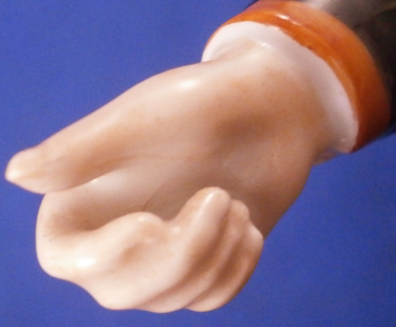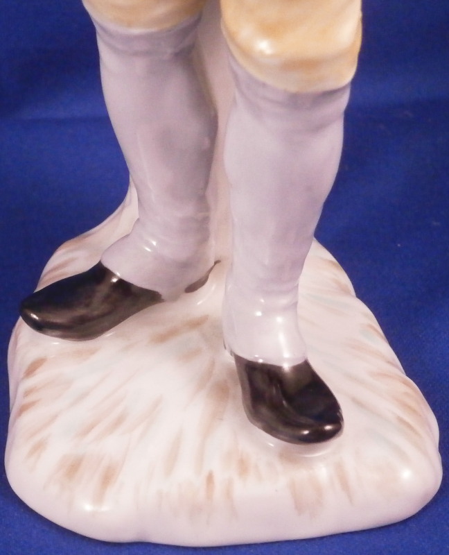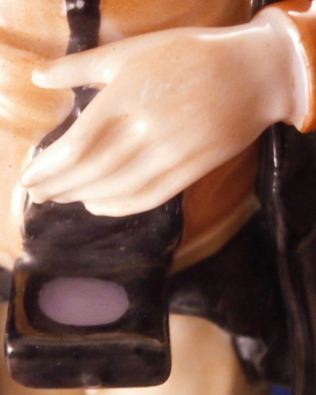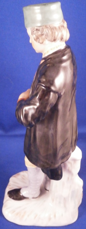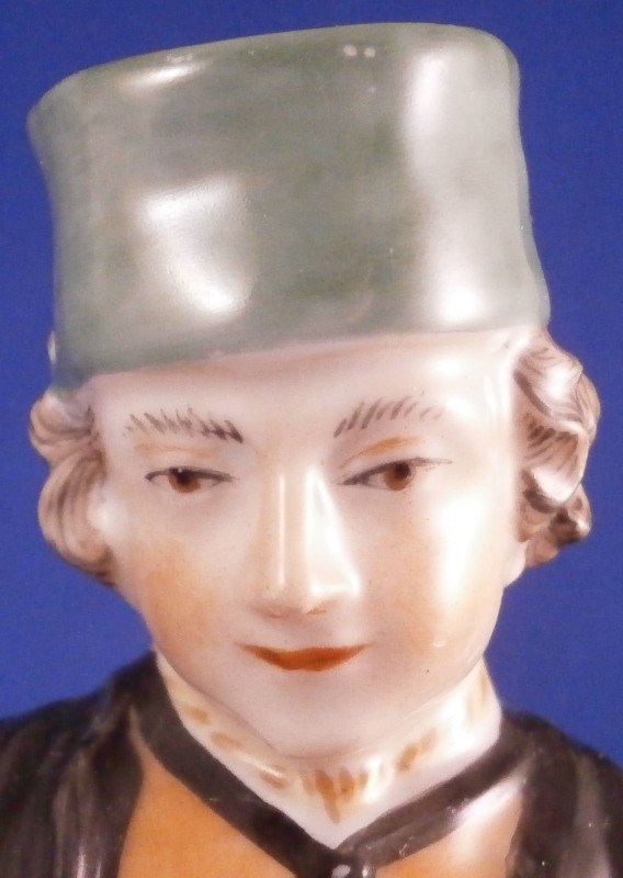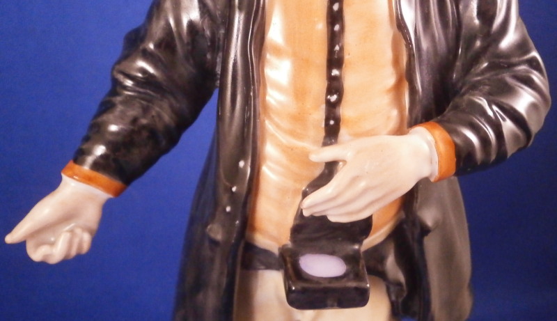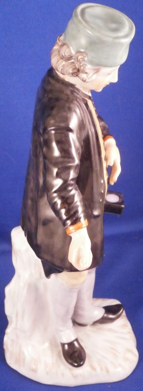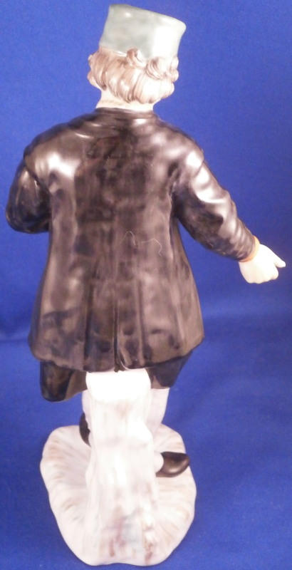 This is a figurine of the famous miner set first designed by Simon Feilner in the 18th century. This figure here is a more modern version though it is the oldest I have seen except for the original pieces. It is of a Mining Officer from the Bergoffizier series and he appears to be handing out coins possibly as payment. Not a model I have seen before and it is quite nice. Very well modeled and hand painted perfectly. He is wearing the typical uniform with the green hat and standing on a nice base. The piece is in superb condition with a tiny bit of wear. The figurine is 7.75 inches tall, 3.5 inches wide and 3 inches deep. He is marked with the script F with a dot behind it in under glaze blue as well as a painter's number 61. in red as shown. Please email me for more information or photos.