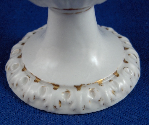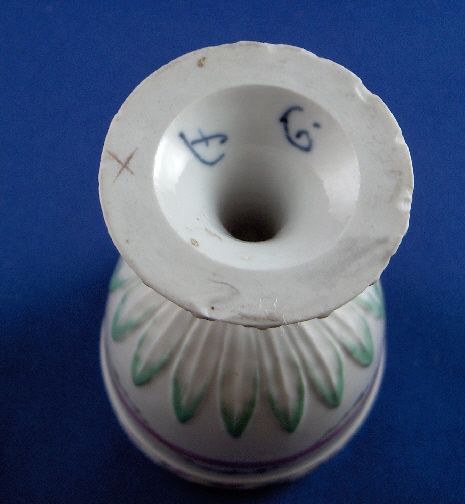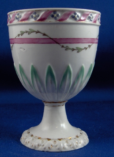 This is a cup for oranges (I always thought it was a large egg cup!) made by Fuerstenberg in the 18th century. It is handpainted with a nice design and there is lots of relief decoration as well. It is in great condition with wear to the gold, it has a manufacturing flaw (black spot) to the inside and a spot on the outside where the paste isn't even. Some tiny and shallow chips to the bottom rim. Marked with the underglaze blue F mark as well as the letter G. or a 6. and an incised plus sign. It is rather large measuring almost 3.5 inches tall and 2.375 inches in diameter. Probably since they ate goose eggs back then as well. Please email me for more information or photos.