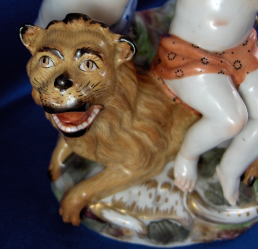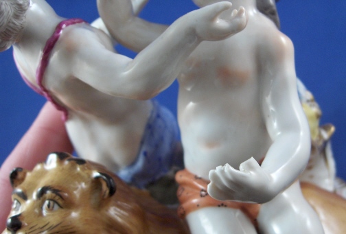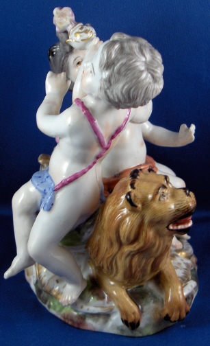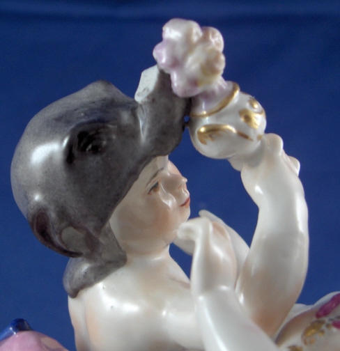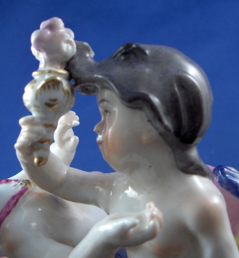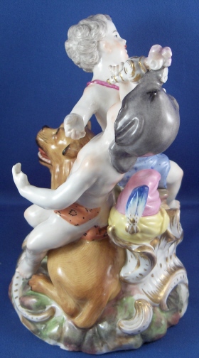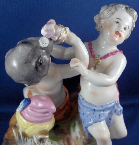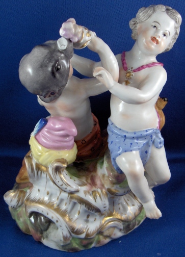 This is a figurine of Asia and Africa mady by Fuerstenberg in the 18th century. A very well modeled and handpainted figurine of a great topic. The piece shows Asia represented by a putto with a turban next to him and Africa represented by a putto wearing an elephant head dress and holding some kind of torch. On the base there is a lion next to them. The figure is 6 inches tall, 4.75 inches wide and 4.5 inches deep. It is not marked but quite obviously made by them! The piece is in great condition with the elephant trunk on the headdress missing, a chip to a finger on Afirca's left hand as well as a missing thumb on that hand and a minor chip to the base rim. Please email me for more information or photos.
