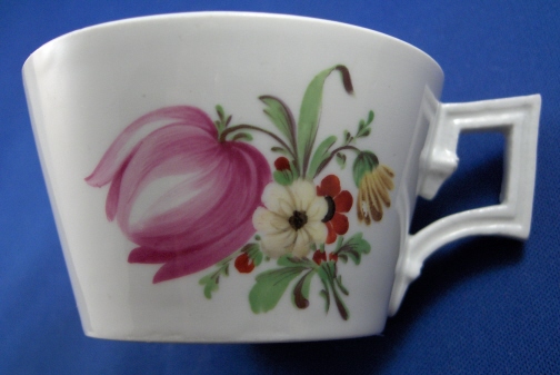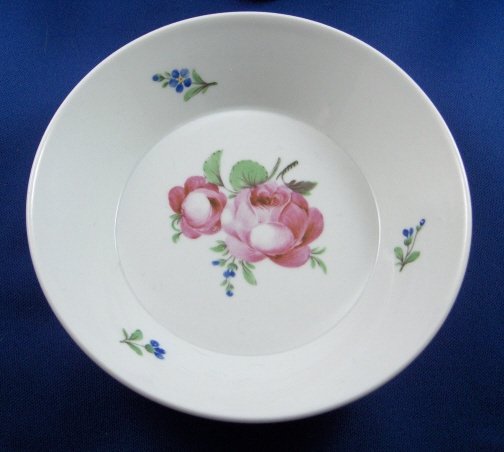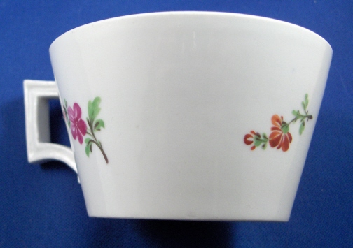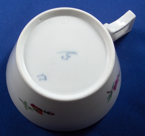 This is a cup and saucer set made by Fuerstenberg around 1790. Nicely handpainted with a set of roses in the center and some small blue flowers like forget me nots on the rim of the saucer. The cup has a nice floral arrangement painted on the front and two small flowers on the rest of it. The cup is 1.75 inches tall and 3.125 inches in diameter. The saucer is 1.25 inches tall and 5 inches in diameter. Both are in super condition with a tiny chip to the footring of the saucer which doesn't affect anything. Both are marked with the underglaze blue script F mark as well as a blue number and some impressed letters and numbers. Please email me for more information or photos.