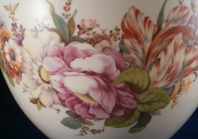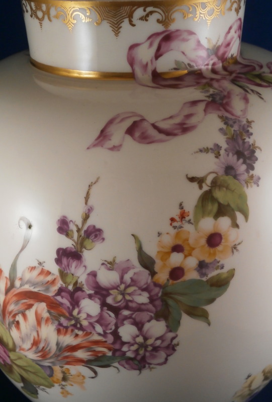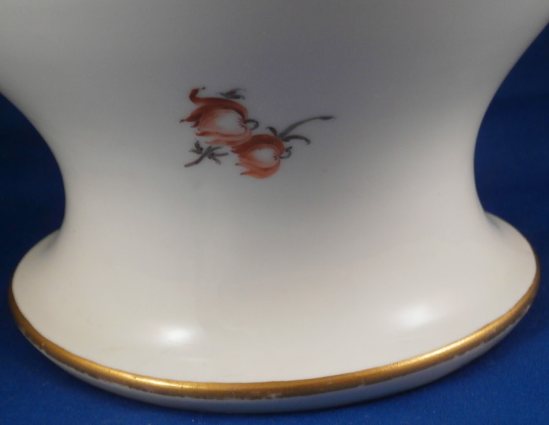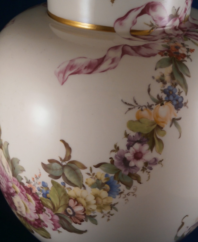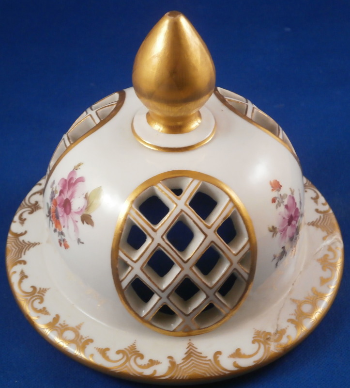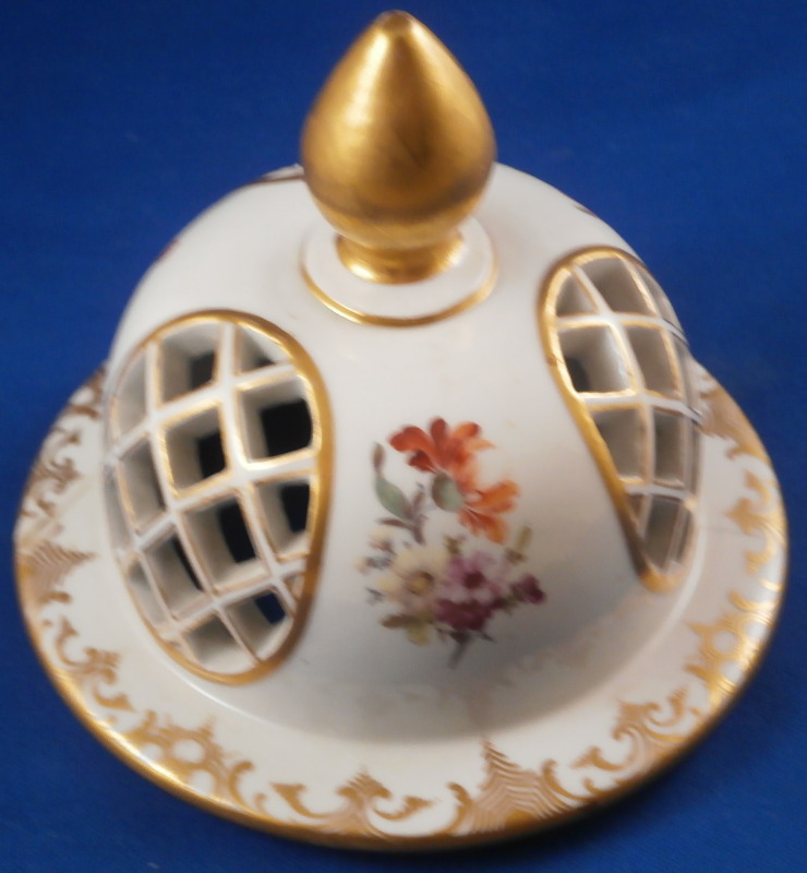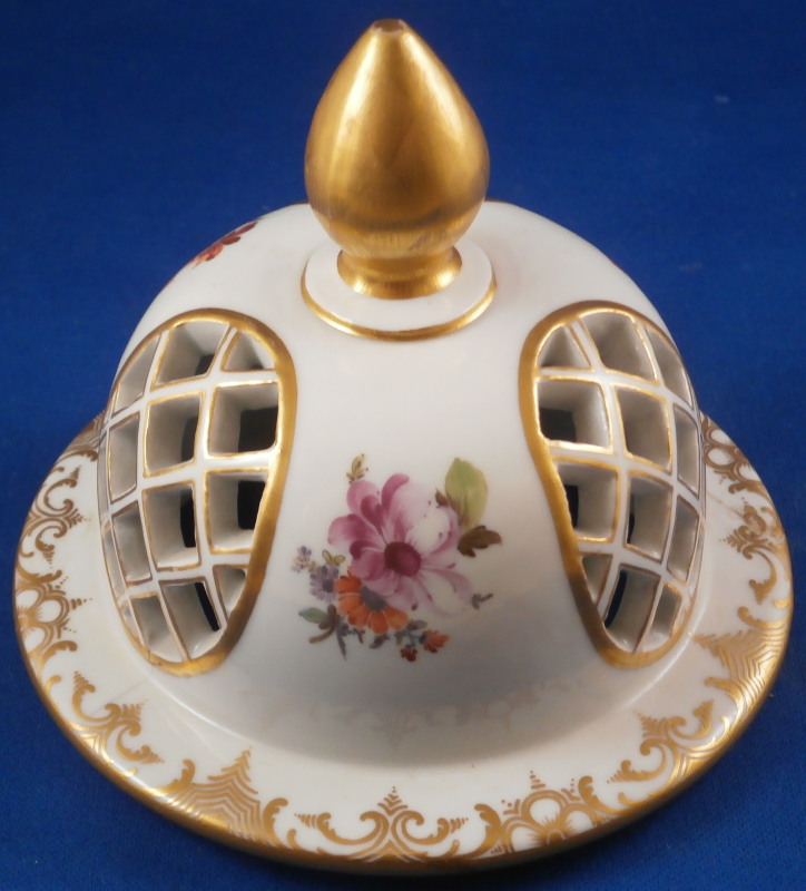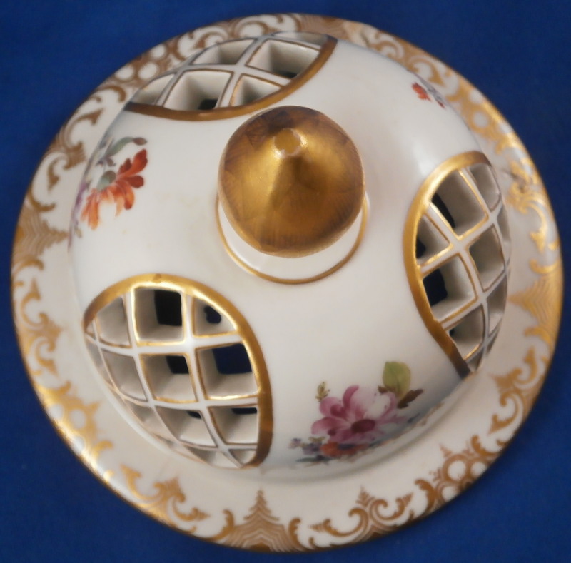 This is a superb large lidded potpourri vase made by Fuerstenberg in the 18th century - or about 1760. The main body is hand painted with two amazing floral garlands held up by two pink bows (I think Furstenberg flowers are among the best out there!!). There are also two smaller floral arrangements to the sides and a nice gold trim to the top rim. The details of thee flowers is just stunning. Amazingly it comes with its original lid which is handpainted with three small flower arrangements in between reticulated panels. Nice gold finial and a matching gold trim to the edge. Furstenberg is famous for their vases and this piece here clearly shows why! The main body is in perfect condition with one side having some tiny fly ash spots from the firing process. The lid displays perfectly but has a large chip reglued and a forked hairline to the other side as well as a small chip to the underside ring that sits in the main body when in place. The entire piece displays amazingly and is truly one of those pieces you can look at all day :) The vase with its lid in place is 14.5 inches tall and about 7.5 inches in diameter. It is marked with the under glaze blue F mark (though impossible to make out as an F) on the inside top rim and underneath with an impressed No. 3 and the letter G. Please email me for more information or photos.