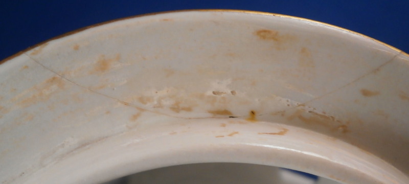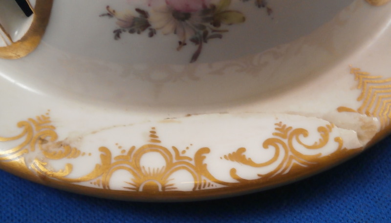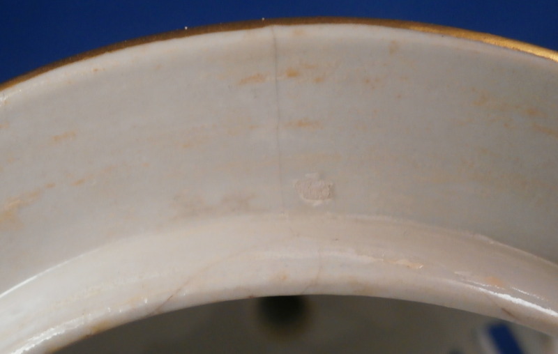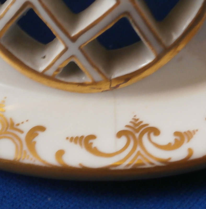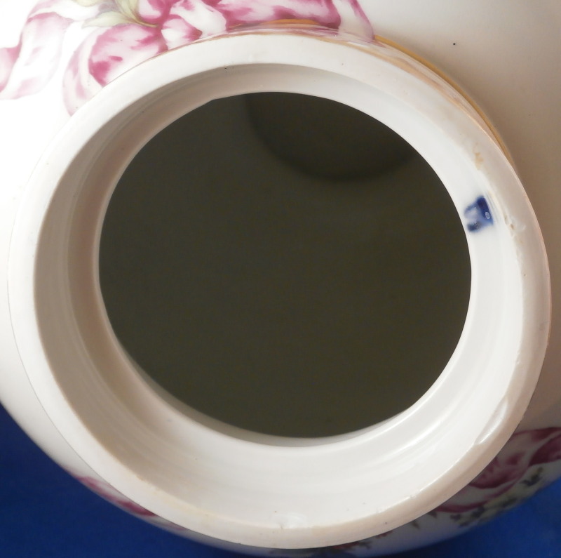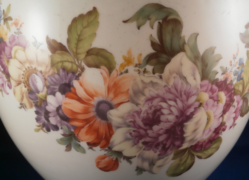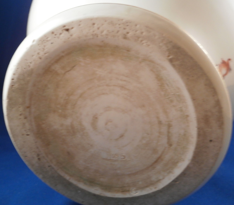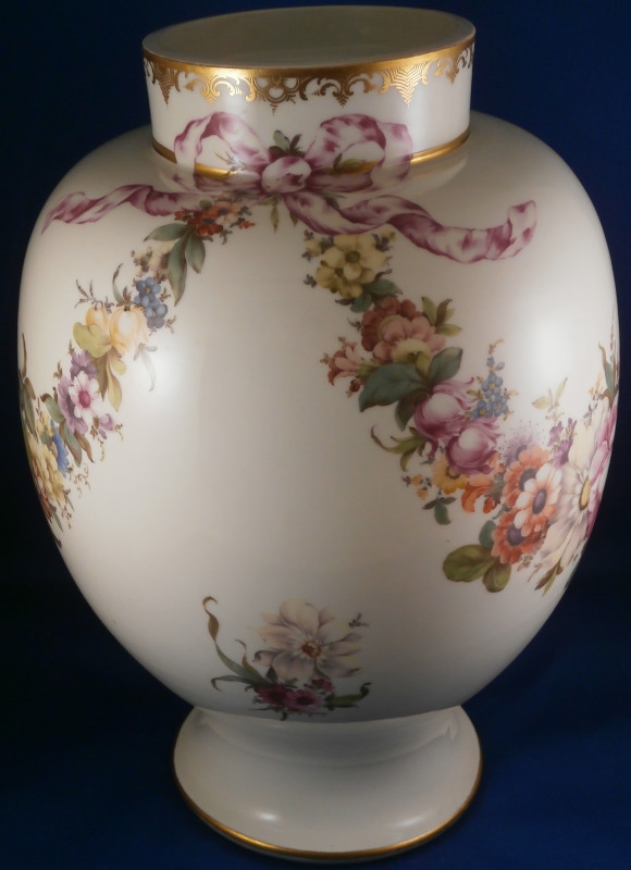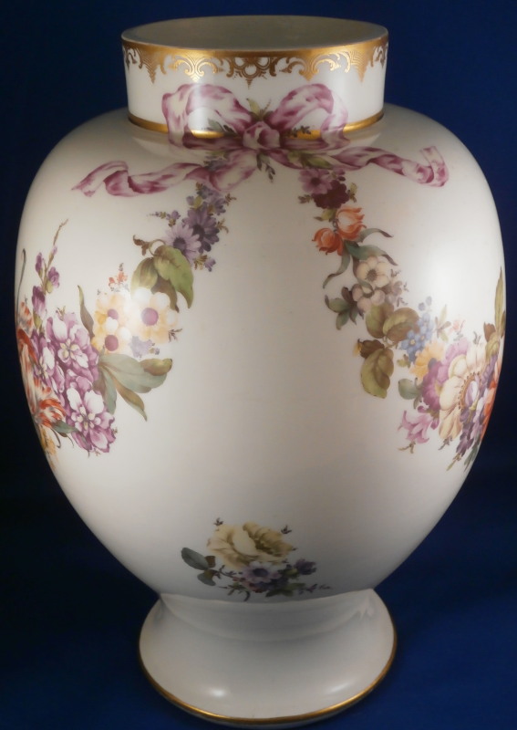 This is a superb large lidded potpourri vase made by Fuerstenberg in the 18th century - or about 1760. The main body is hand painted with two amazing floral garlands held up by two pink bows (I think Furstenberg flowers are among the best out there!!). There are also two smaller floral arrangements to the sides and a nice gold trim to the top rim. The details of thee flowers is just stunning. Amazingly it comes with its original lid which is handpainted with three small flower arrangements in between reticulated panels. Nice gold finial and a matching gold trim to the edge. Furstenberg is famous for their vases and this piece here clearly shows why! The main body is in perfect condition with one side having some tiny fly ash spots from the firing process. The lid displays perfectly but has a large chip reglued and a forked hairline to the other side as well as a small chip to the underside ring that sits in the main body when in place. The entire piece displays amazingly and is truly one of those pieces you can look at all day :) The vase with its lid in place is 14.5 inches tall and about 7.5 inches in diameter. It is marked with the under glaze blue F mark (though impossible to make out as an F) on the inside top rim and underneath with an impressed No. 3 and the letter G. Please email me for more information or photos.