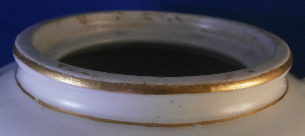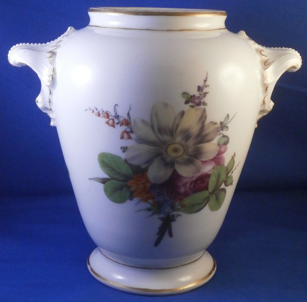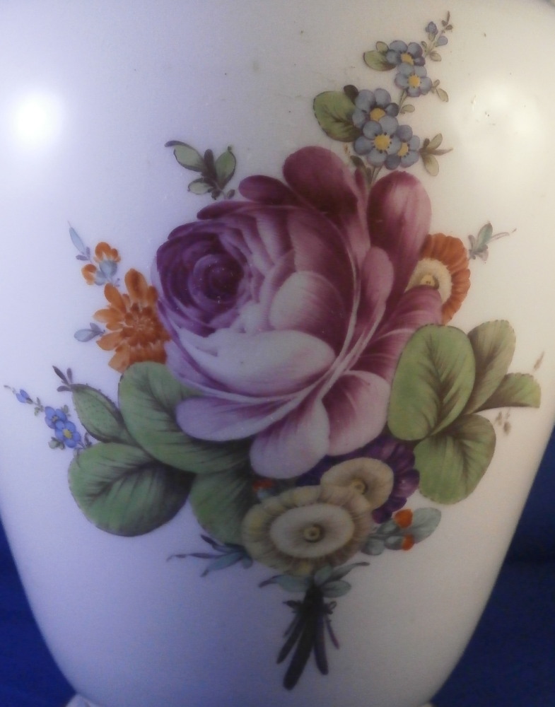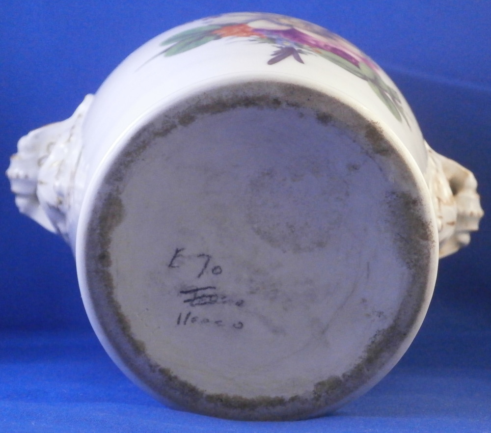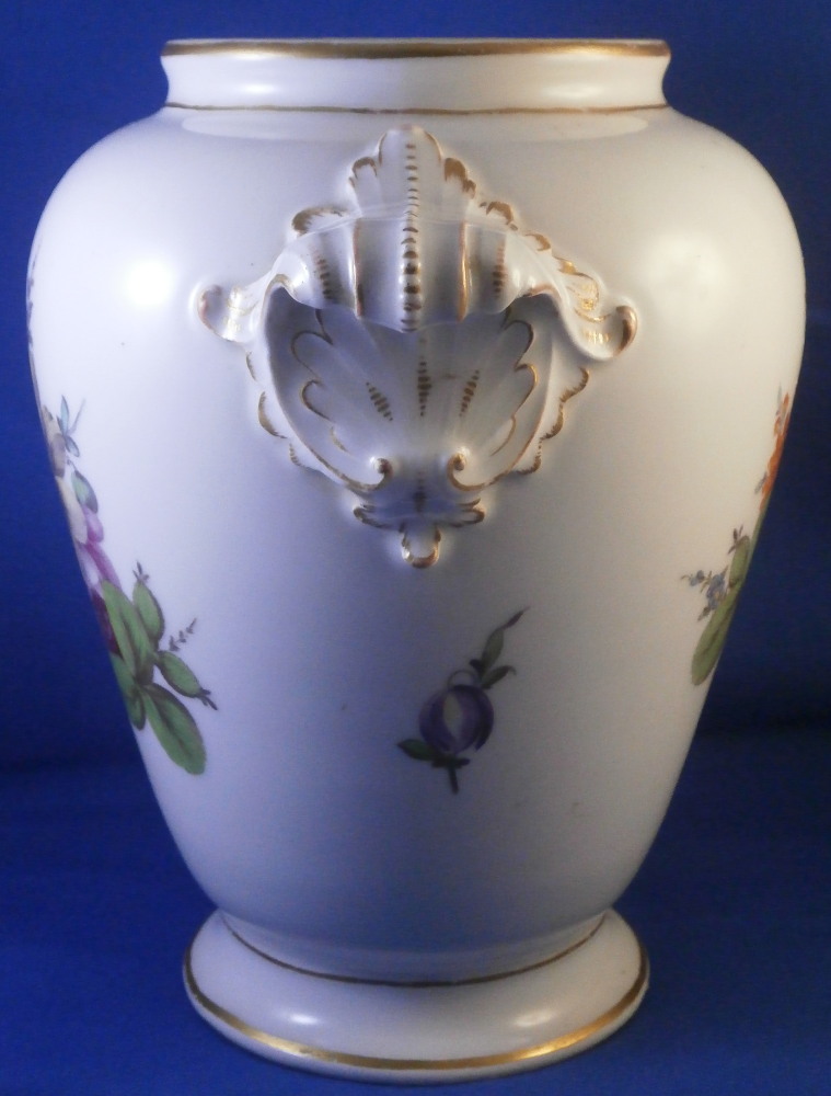 This is a very nice vase made by Furstenberg in the 18th century. It is hand painted with a superb large floral arrangement on the front and back with a small single flower on each side below the handles. Nicely shaped handles highlighted with gilding as well as some gold trim to the top and bottom. The piece is lacking the lid which would have been dome shaped. I have a yellow ground larger version of this piece if you want to see the shape of it.The piece is in great condition with a few minor use marks but no chips, restorations, etc. It is 7.75 inches tall, about 8.5 inches wide and about 6 inches in diameter. I think this is the smallest version for this shape. Vases were the most important product of Fuerstenberg during this period and this piece shows us why - quite stunning! It is marked with the under glaze blue F mark on the inside top rim of the main body and impressed No.1 underneath as shown. The underside handles each have an air hole for the firing process as shown. Please email me for more information or photos.