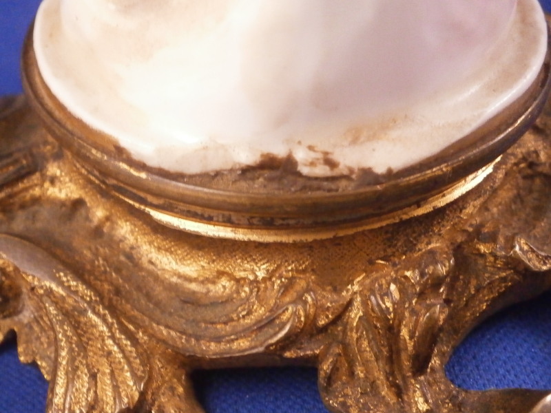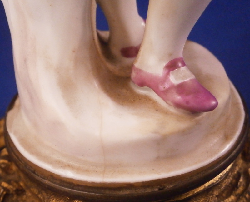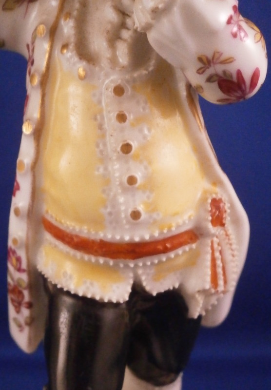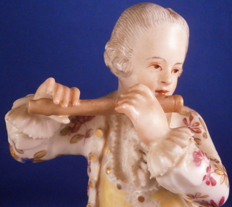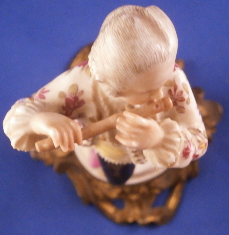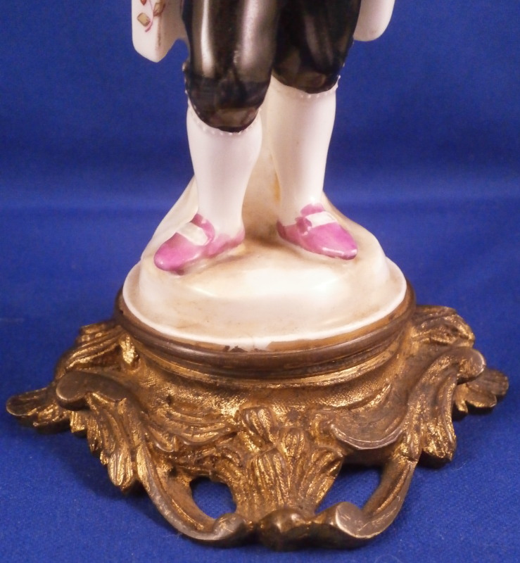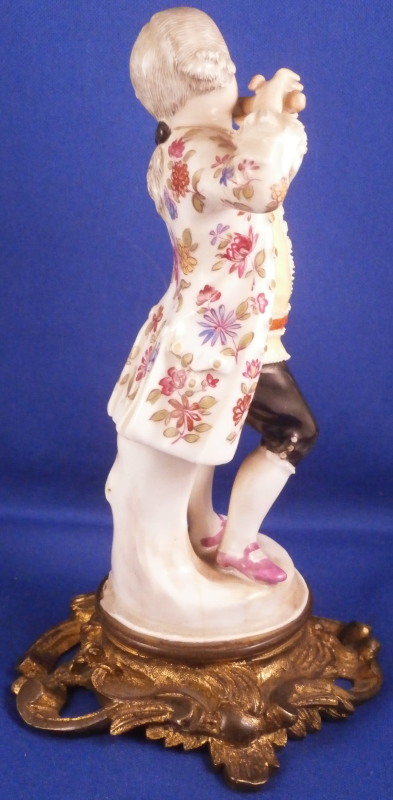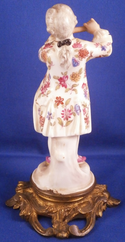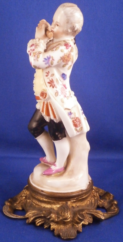This is a nice figurine of a flutist made by Fuerstenberg in the 18th century. Modeled nicely in their typical fashion and hand painted with their typical colors and style. No way to see the mark udnerneath the base since it is solidly attached to the superb ormolu bronze metal base which gives it some weight and adds elegance to the figure . The piece is of a flutist dressed nicely in a long loral decorated coat, a yellow vest with some riased decoration to it and black short pants plus pink shoes. The base is simple with a tree trunk in the back supporting the figure during the firing process. The figurine with the base is about 6 inches tall, 3.625 inches wide and 3.5 inches deep. The piece is in great condition with a tiny chip to one pinky tip which is not visible when displayed and some damage to the base - a chip to the back as well as two hairlines - it looks like someone tried to pry the figure off its metal base but they are attached solidly and it would be next to impossible to remove them. All in all a superb piece! Please email me for more information or other pictures.