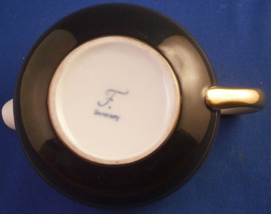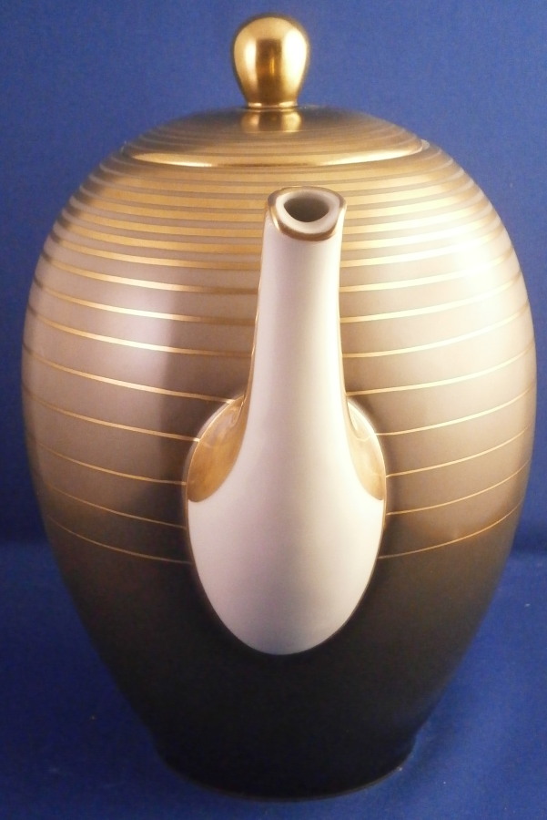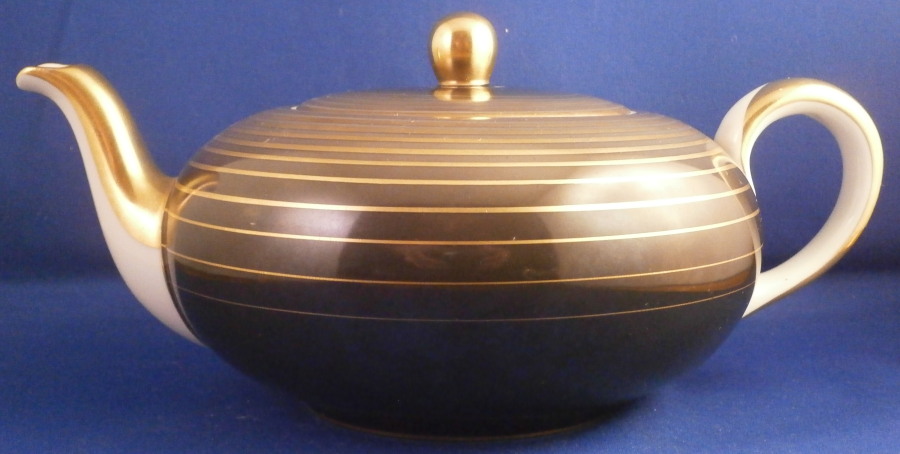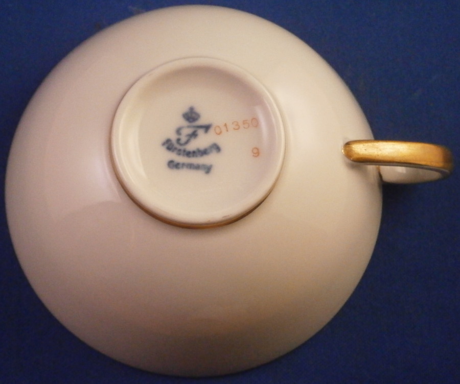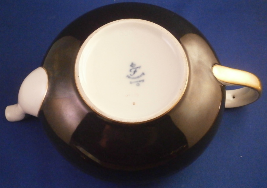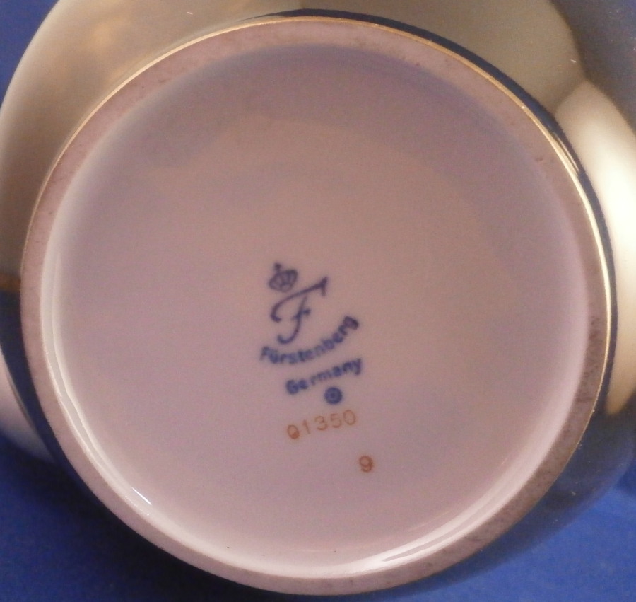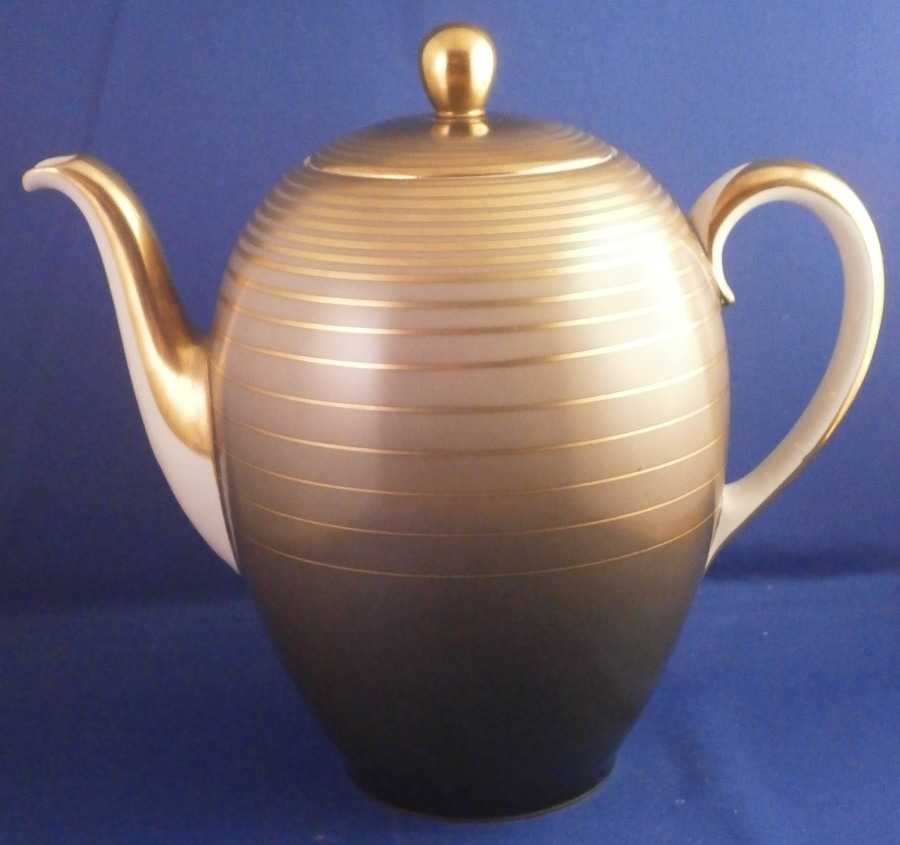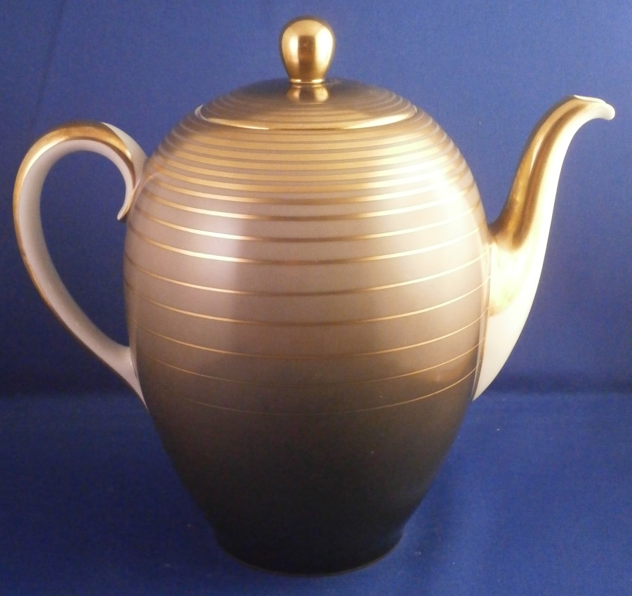This is a super tea and coffee service set made by Fuerstenberg in the mid 20th century. About as nice an Eames era set as you can find. The set is for five / six people missing just a cup and saucer (the easiest to find item) to make it a complete set for 6 people! The set has the shape number 650 and design 01350. A stunning looking set with a fading brown ground color that is slamost black toward to the bottom and very light towards the top over which a continuos gold ring design was painted going from wider at the top to thinner and then disappearing towards the bottom. The brown ground is also in a ring design on the cups, saucers and plates which reminds me of the Trude Petri pieces at KPM. The outside of the cups, center of the plates and part of the handles and psouts was left white. Nice shape to all pieces and very mid century modern look. All pieces are marked with the underglaze blue mark including the letter F under a crown. Most have the name Fuerstenberg as well as Germany underneath as well as the red design numbers. The creamer has an older mark of just the letter F. in script with Germany under it. Some pieces have a scratch in the glaze on the udnerside done on purpose. Not over the mark just randomly placed. Not sure if this means they are second quality pieces as normally those would be placed over the marks. Never seen that before! All pieces are in great condition, no chips or restorations just the occasional wear or use mark but they display perfectly! The cups are 1.75 inches tall and 4.25 inches in diameter. The saucers are 0.875 inches tall and 6 inches in diameter. The dessert plates are 1 inch tall and about 7.75 inches in diameter. The sugar dish is 3 inches tall including the finial and 4.375 inches in diameter without the handles. The creamer is 2.375 inches tall and 4 inches in diameter, the teapot is 4 inches tall including the finial, 9.75 inches from handle to spout and 6.75 inches in diameter and last but not least the coffee pot is 8.25 inches tall includig the finial, 9 inches from handle to spout and about 5.5 inches in diameter. Please email me for more information or photos.