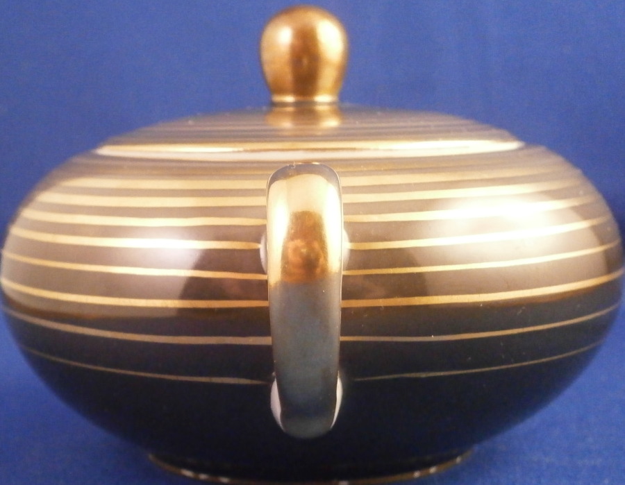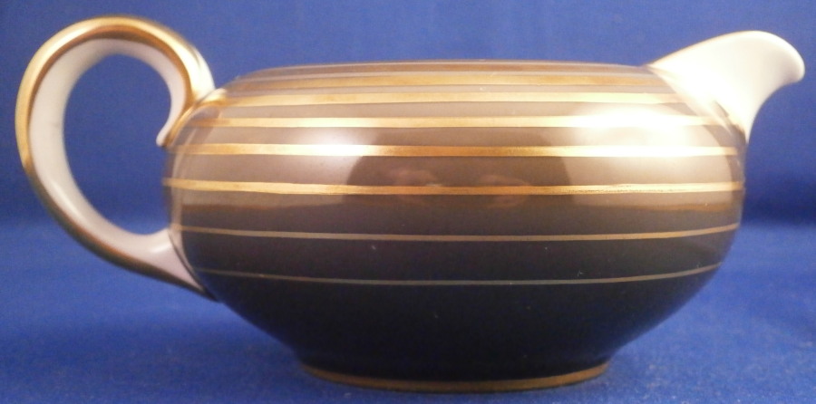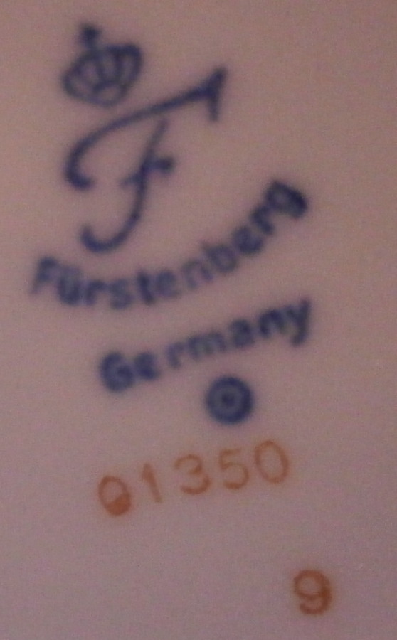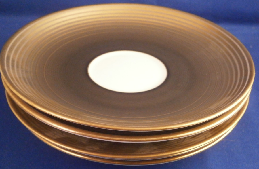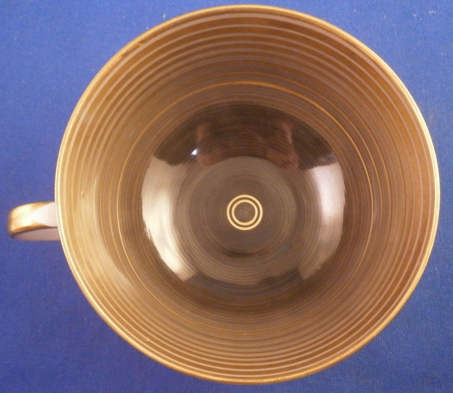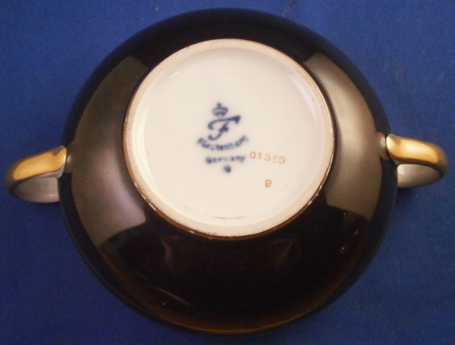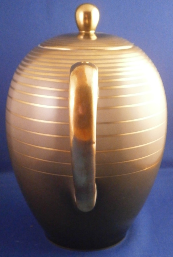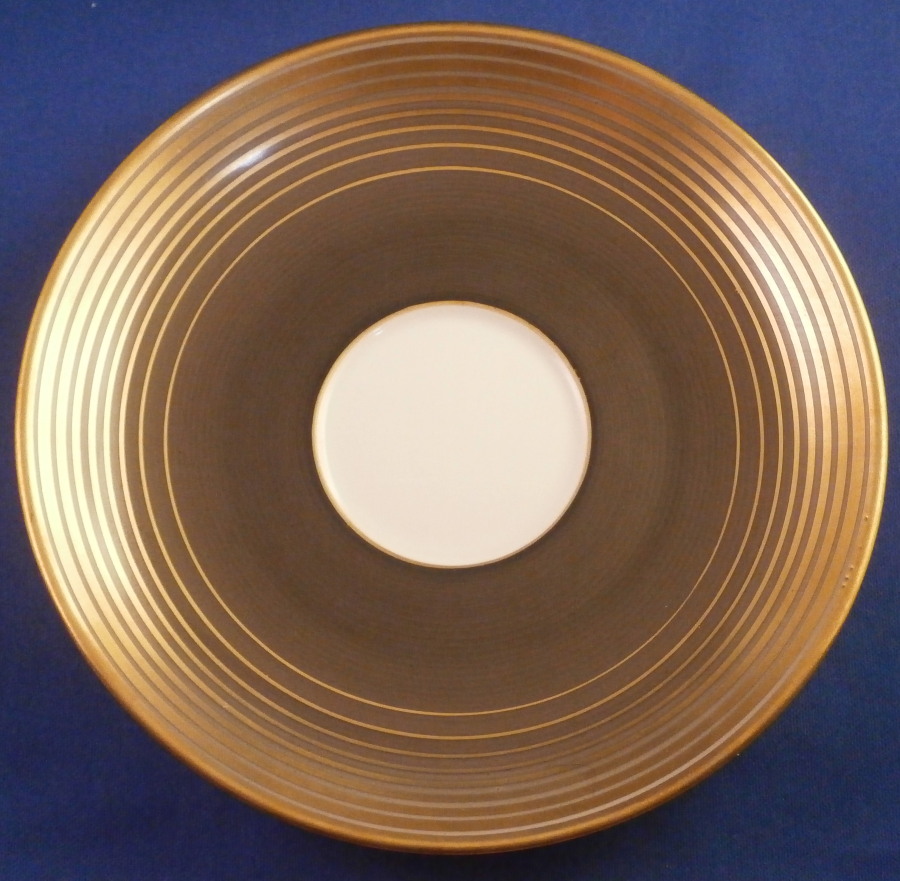 This is a super tea and coffee service set made by Fuerstenberg in the mid 20th century. About as nice an Eames era set as you can find. The set is for five / six people missing just a cup and saucer (the easiest to find item) to make it a complete set for 6 people! The set has the shape number 650 and design 01350. A stunning looking set with a fading brown ground color that is slamost black toward to the bottom and very light towards the top over which a continuos gold ring design was painted going from wider at the top to thinner and then disappearing towards the bottom. The brown ground is also in a ring design on the cups, saucers and plates which reminds me of the Trude Petri pieces at KPM. The outside of the cups, center of the plates and part of the handles and psouts was left white. Nice shape to all pieces and very mid century modern look. All pieces are marked with the underglaze blue mark including the letter F under a crown. Most have the name Fuerstenberg as well as Germany underneath as well as the red design numbers. The creamer has an older mark of just the letter F. in script with Germany under it. Some pieces have a scratch in the glaze on the udnerside done on purpose. Not over the mark just randomly placed. Not sure if this means they are second quality pieces as normally those would be placed over the marks. Never seen that before! All pieces are in great condition, no chips or restorations just the occasional wear or use mark but they display perfectly! The cups are 1.75 inches tall and 4.25 inches in diameter. The saucers are 0.875 inches tall and 6 inches in diameter. The dessert plates are 1 inch tall and about 7.75 inches in diameter. The sugar dish is 3 inches tall including the finial and 4.375 inches in diameter without the handles. The creamer is 2.375 inches tall and 4 inches in diameter, the teapot is 4 inches tall including the finial, 9.75 inches from handle to spout and 6.75 inches in diameter and last but not least the coffee pot is 8.25 inches tall includig the finial, 9 inches from handle to spout and about 5.5 inches in diameter. Please email me for more information or photos.