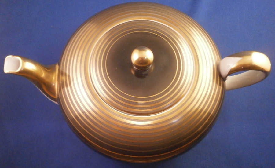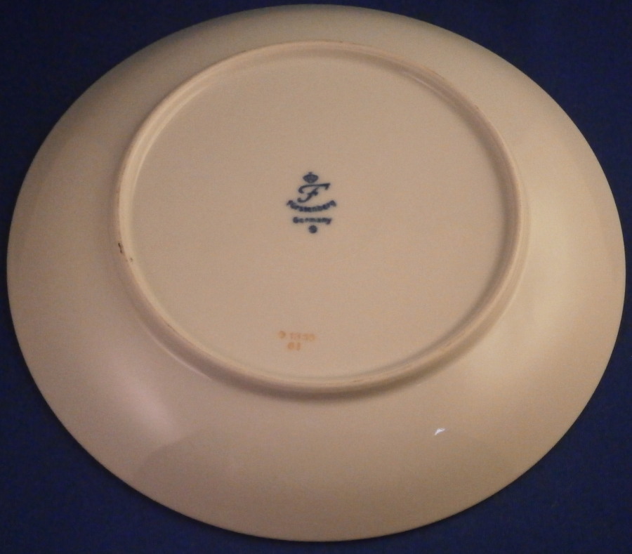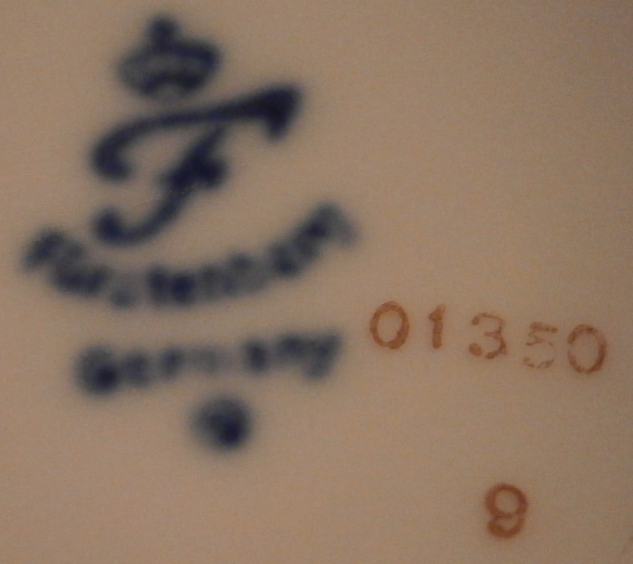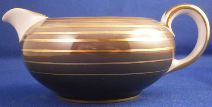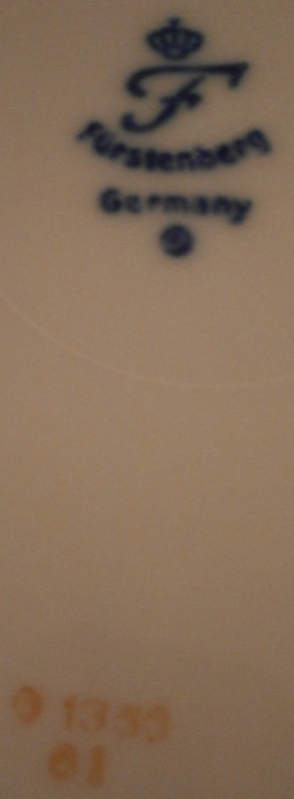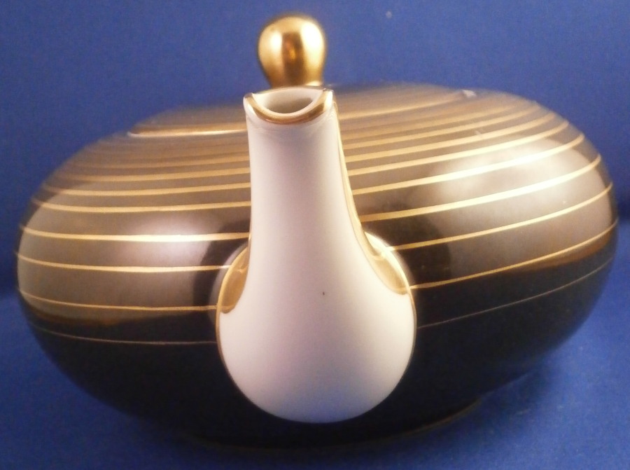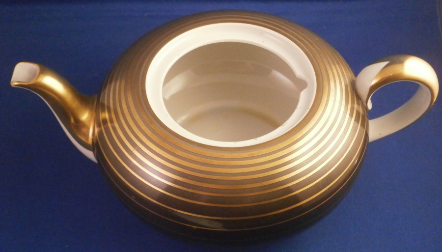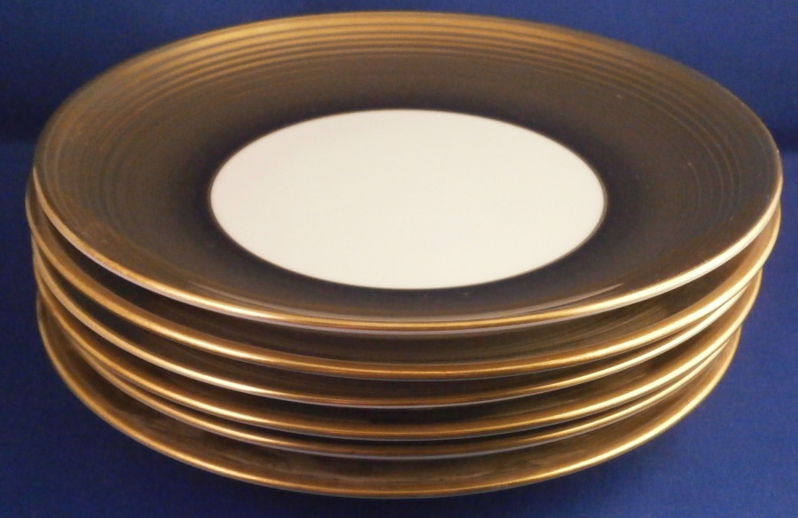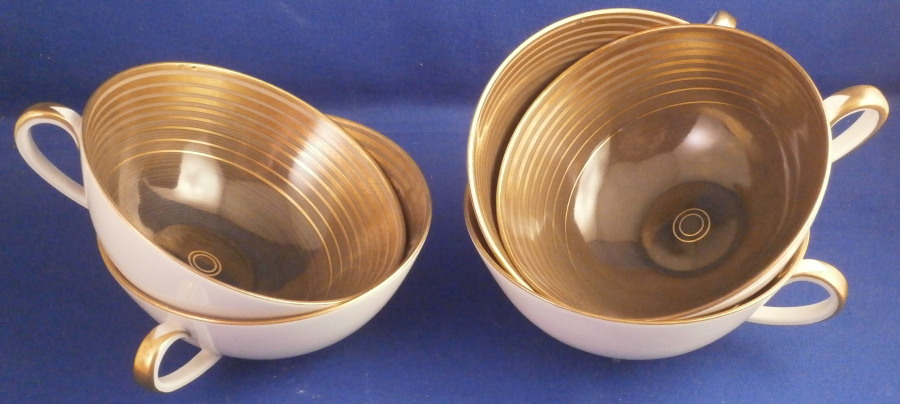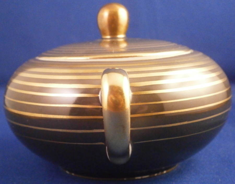 This is a super tea and coffee service set made by Fuerstenberg in the mid 20th century. About as nice an Eames era set as you can find. The set is for five / six people missing just a cup and saucer (the easiest to find item) to make it a complete set for 6 people! The set has the shape number 650 and design 01350. A stunning looking set with a fading brown ground color that is slamost black toward to the bottom and very light towards the top over which a continuos gold ring design was painted going from wider at the top to thinner and then disappearing towards the bottom. The brown ground is also in a ring design on the cups, saucers and plates which reminds me of the Trude Petri pieces at KPM. The outside of the cups, center of the plates and part of the handles and psouts was left white. Nice shape to all pieces and very mid century modern look. All pieces are marked with the underglaze blue mark including the letter F under a crown. Most have the name Fuerstenberg as well as Germany underneath as well as the red design numbers. The creamer has an older mark of just the letter F. in script with Germany under it. Some pieces have a scratch in the glaze on the udnerside done on purpose. Not over the mark just randomly placed. Not sure if this means they are second quality pieces as normally those would be placed over the marks. Never seen that before! All pieces are in great condition, no chips or restorations just the occasional wear or use mark but they display perfectly! The cups are 1.75 inches tall and 4.25 inches in diameter. The saucers are 0.875 inches tall and 6 inches in diameter. The dessert plates are 1 inch tall and about 7.75 inches in diameter. The sugar dish is 3 inches tall including the finial and 4.375 inches in diameter without the handles. The creamer is 2.375 inches tall and 4 inches in diameter, the teapot is 4 inches tall including the finial, 9.75 inches from handle to spout and 6.75 inches in diameter and last but not least the coffee pot is 8.25 inches tall includig the finial, 9 inches from handle to spout and about 5.5 inches in diameter. Please email me for more information or photos.